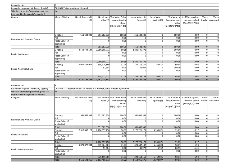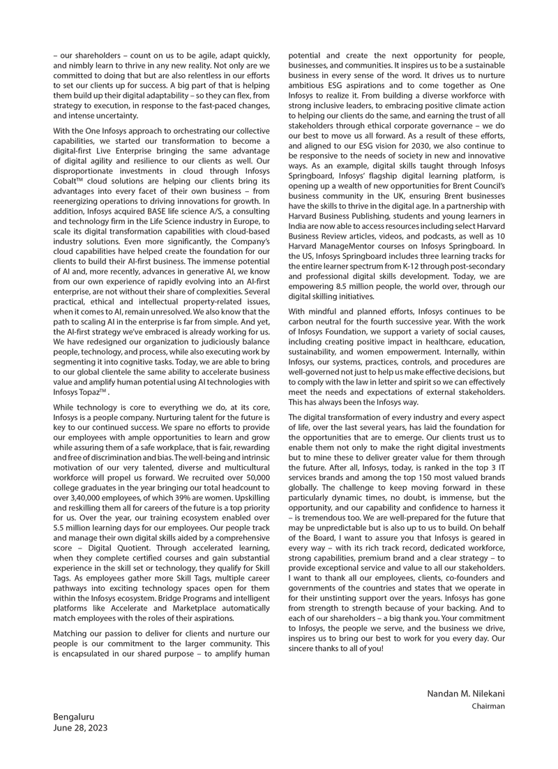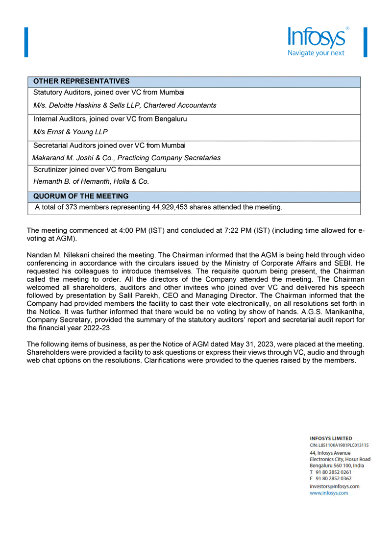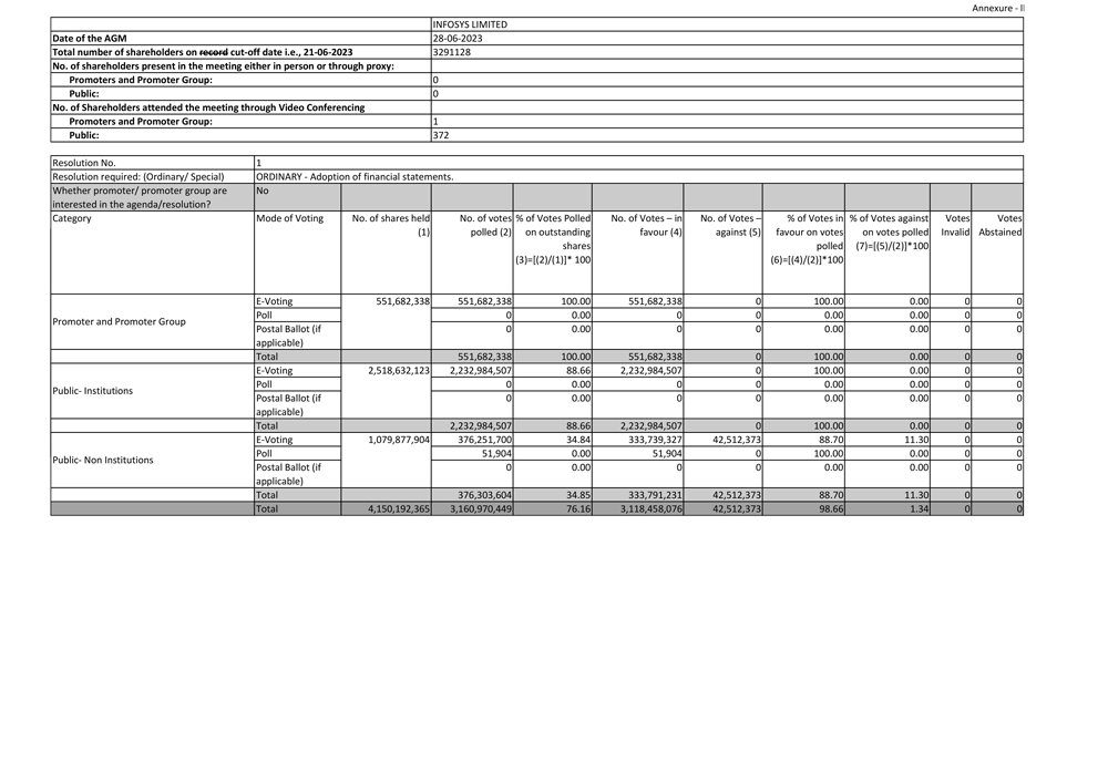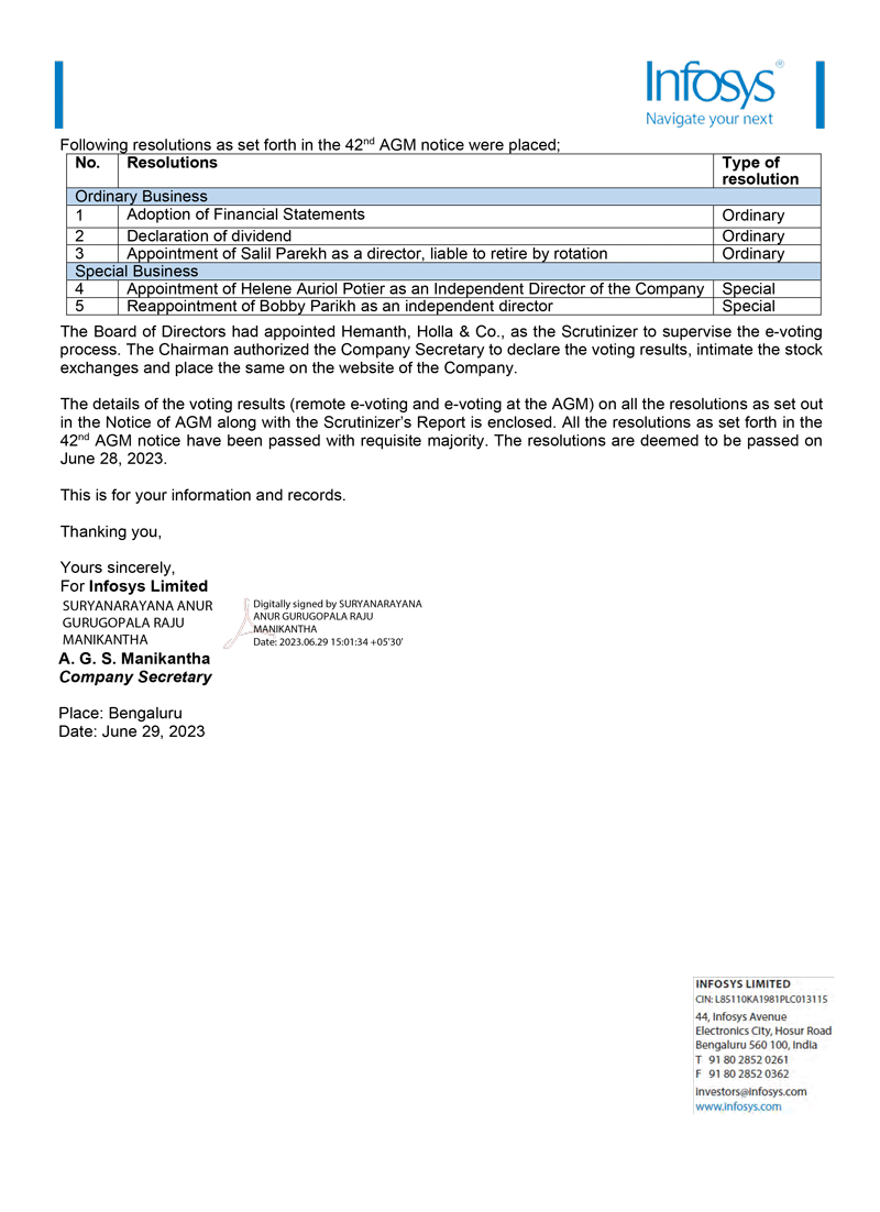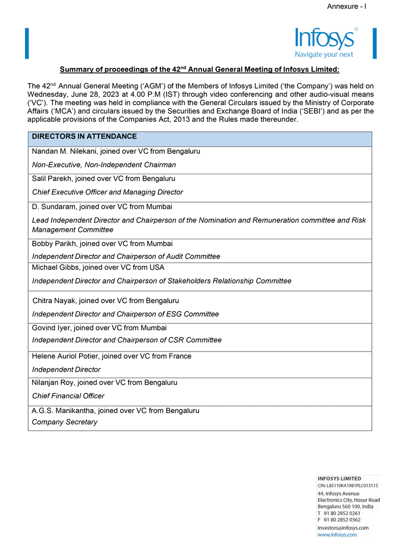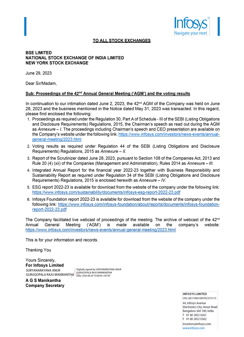 Infosys Limited (“Infosys” or the “Company”) hereby furnish the United States Securities and Exchange Commission with a copy of the outcome of the 42nd Annual General Meeting (AGM) of the Company held on June 28, 2023. The outcome were disseminated by Infosys Limited to the stock exchanges on June 29, 2023, which is attached to this Form 6-K as Exhibits 99.1.