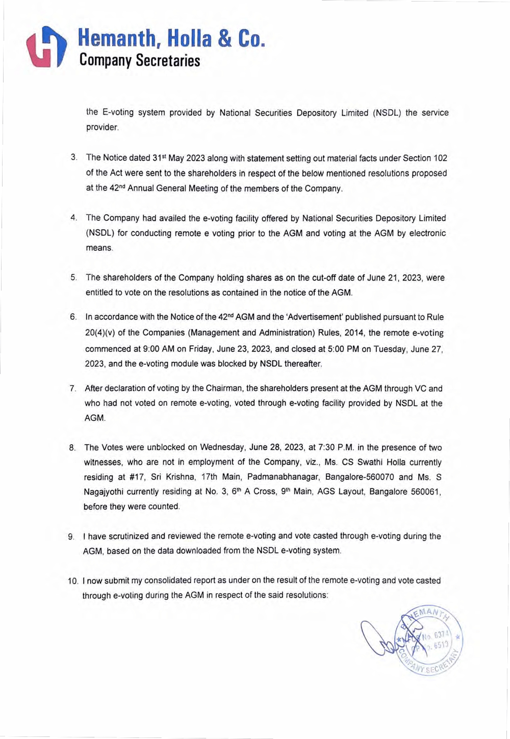 OUTCOME OF THE 42ND ANNUAL GENERAL MEETING