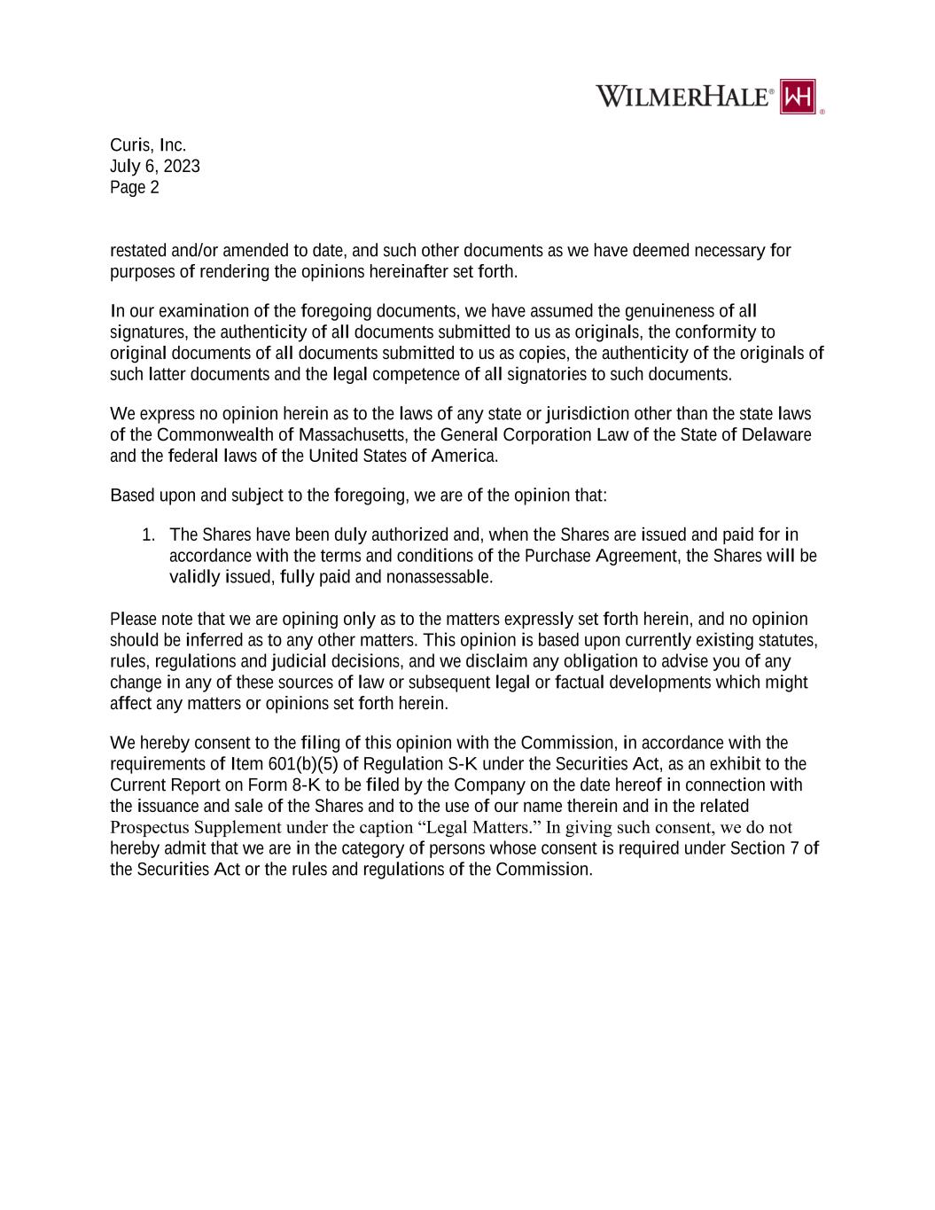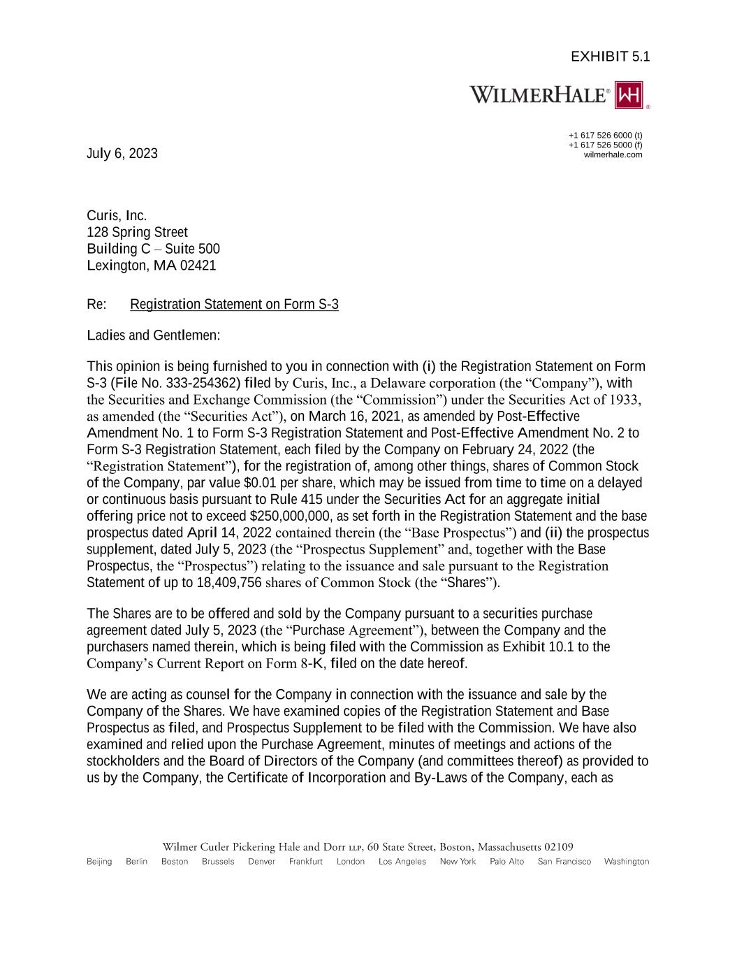 EXHIBIT 10.1 SECURITIES PURCHASE AGREEMENT This Securities Purchase Agreement (this “Agreement”) is dated as of July 5, 2023, between Curis, Inc., a Delaware corporation (the “Company”), and each purchaser identified on the signature pages hereto (each, including its successors and assigns, a “Purchaser” and collectively the “Purchasers”). WHEREAS, subject to the terms and conditions set forth in this Agreement and pursuant to an effective registration statement under the Securities Act (as defined below), the Company desires to issue and sell to each Purchaser, and each Purchaser, severally and not jointly, desires to purchase from the Company, securities of the Company as more fully described in this Agreement. NOW, THEREFORE, IN CONSIDERATION of the mutual covenants contained in this Agreement, and for other good and valuable consideration the receipt and adequacy of which are hereby acknowledged, the Company and each Purchaser agree as follows: ARTICLE I. DEFINITIONS 1.1 Definitions. In addition to the terms defined elsewhere in this Agreement, for all purposes of this Agreement, the following terms have the meanings set forth in this Section 1.1: “Acquiring Person” shall have the meaning ascribed to such term in Section 4.4. “Action” shall have the meaning ascribed to such term in Section 3.1(j). “Affiliate” means any Person that, directly or indirectly through one or more intermediaries, controls or is controlled by or is under common control with a Person as such terms are used in and construed under Rule 405 under the Securities Act. “Board of Directors” means the board of directors of the Company. “Business Day” means any day other than Saturday, Sunday or other day on which commercial banks in The City of New York are authorized or required by law to remain closed. “Closing” means the closing of the purchase and sale of the Shares pursuant to Section 2.1. “Closing Date” means the Trading Day on which all of the Transaction Documents have been executed and delivered by the applicable parties thereto, and all conditions precedent to (i) the Purchasers’ obligations to pay the Subscription Amount and (ii) the Company’s obligations to deliver the Shares, in each case, have been satisfied or waived, but in no event later than the second (2nd) Trading Day following the date hereof.