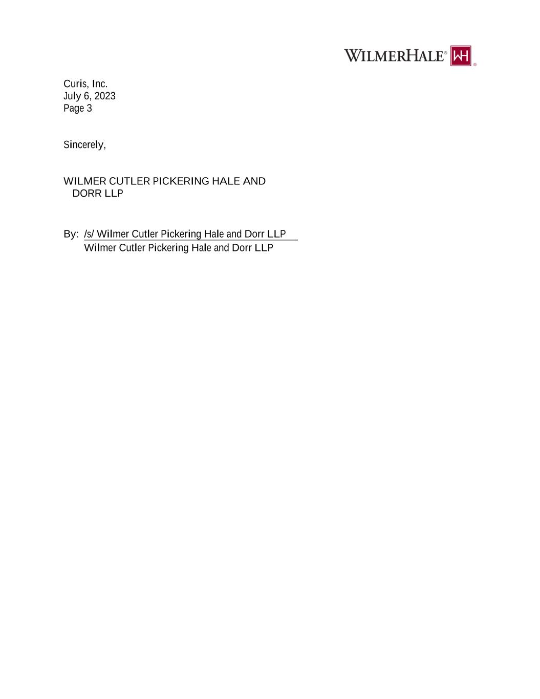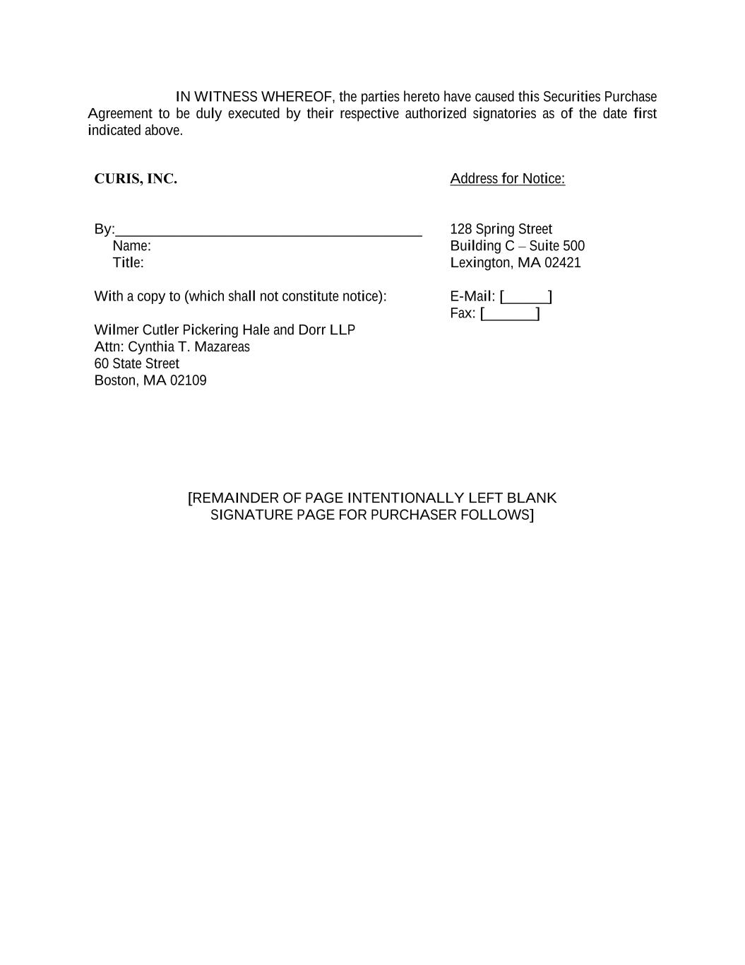 IN WITNESS WHEREOF, the parties hereto have caused this Securities Purchase Agreement to be duly executed by their respective authorized signatories as of the date first indicated above. CURIS, INC. Address for Notice: By:__________________________________________ Name: Title: With a copy to (which shall not constitute notice): 128 Spring Street Building C – Suite 500 Lexington, MA 02421 E-Mail: [______] Fax: [_______] Wilmer Cutler Pickering Hale and Dorr LLP Attn: Cynthia T. Mazareas 60 State Street Boston, MA 02109 [REMAINDER OF PAGE INTENTIONALLY LEFT BLANK SIGNATURE PAGE FOR PURCHASER FOLLOWS]