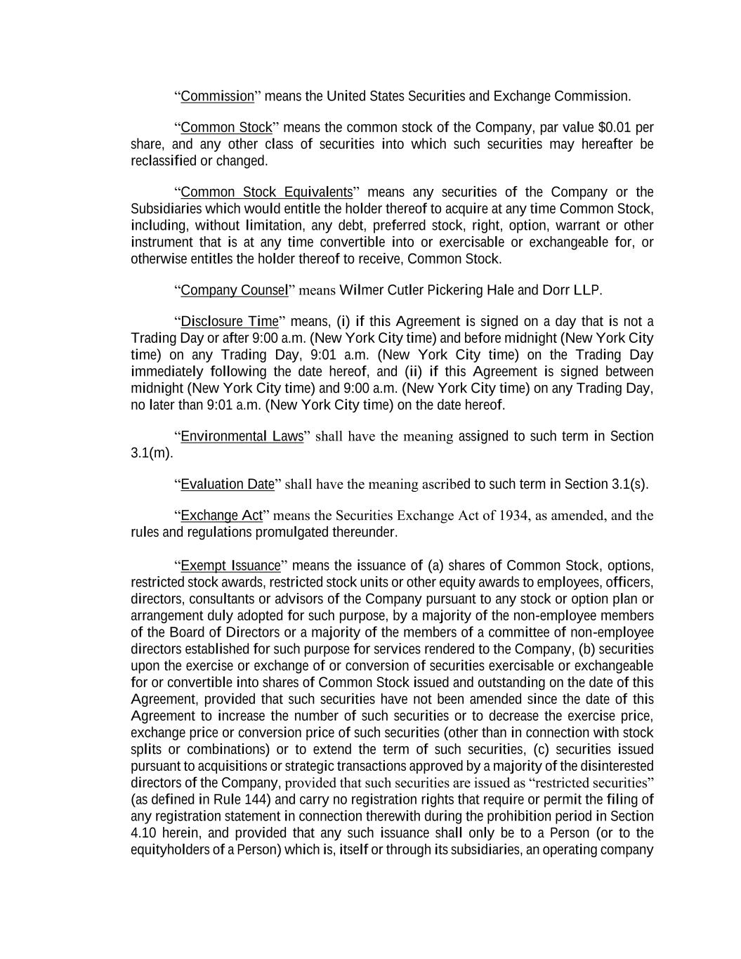 “Commission” means the United States Securities and Exchange Commission. “Common Stock” means the common stock of the Company, par value $0.01 per share, and any other class of securities into which such securities may hereafter be reclassified or changed. “Common Stock Equivalents” means any securities of the Company or the Subsidiaries which would entitle the holder thereof to acquire at any time Common Stock, including, without limitation, any debt, preferred stock, right, option, warrant or other instrument that is at any time convertible into or exercisable or exchangeable for, or otherwise entitles the holder thereof to receive, Common Stock. “Company Counsel” means Wilmer Cutler Pickering Hale and Dorr LLP. “Disclosure Time” means, (i) if this Agreement is signed on a day that is not a Trading Day or after 9:00 a.m. (New York City time) and before midnight (New York City time) on any Trading Day, 9:01 a.m. (New York City time) on the Trading Day immediately following the date hereof, and (ii) if this Agreement is signed between midnight (New York City time) and 9:00 a.m. (New York City time) on any Trading Day, no later than 9:01 a.m. (New York City time) on the date hereof. “Environmental Laws” shall have the meaning assigned to such term in Section 3.1(m). “Evaluation Date” shall have the meaning ascribed to such term in Section 3.1(s). “Exchange Act” means the Securities Exchange Act of 1934, as amended, and the rules and regulations promulgated thereunder. “Exempt Issuance” means the issuance of (a) shares of Common Stock, options, restricted stock awards, restricted stock units or other equity awards to employees, officers, directors, consultants or advisors of the Company pursuant to any stock or option plan or arrangement duly adopted for such purpose, by a majority of the non-employee members of the Board of Directors or a majority of the members of a committee of non-employee directors established for such purpose for services rendered to the Company, (b) securities upon the exercise or exchange of or conversion of securities exercisable or exchangeable for or convertible into shares of Common Stock issued and outstanding on the date of this Agreement, provided that such securities have not been amended since the date of this Agreement to increase the number of such securities or to decrease the exercise price, exchange price or conversion price of such securities (other than in connection with stock splits or combinations) or to extend the term of such securities, (c) securities issued pursuant to acquisitions or strategic transactions approved by a majority of the disinterested directors of the Company, provided that such securities are issued as “restricted securities” (as defined in Rule 144) and carry no registration rights that require or permit the filing of any registration statement in connection therewith during the prohibition period in Section 4.10 herein, and provided that any such issuance shall only be to a Person (or to the equityholders of a Person) which is, itself or through its subsidiaries, an operating company