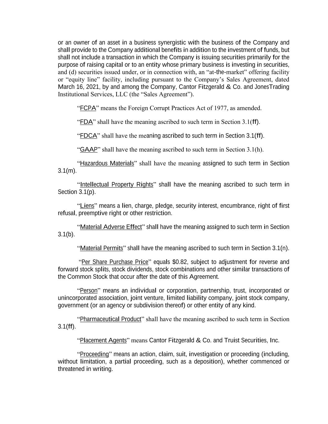 or an owner of an asset in a business synergistic with the business of the Company and shall provide to the Company additional benefits in addition to the investment of funds, but shall not include a transaction in which the Company is issuing securities primarily for the purpose of raising capital or to an entity whose primary business is investing in securities, and (d) securities issued under, or in connection with, an “at-the-market” offering facility or “equity line” facility, including pursuant to the Company’s Sales Agreement, dated March 16, 2021, by and among the Company, Cantor Fitzgerald & Co. and JonesTrading Institutional Services, LLC (the “Sales Agreement”). “FCPA” means the Foreign Corrupt Practices Act of 1977, as amended. “FDA” shall have the meaning ascribed to such term in Section 3.1(ff). “FDCA” shall have the meaning ascribed to such term in Section 3.1(ff). “GAAP” shall have the meaning ascribed to such term in Section 3.1(h). “Hazardous Materials” shall have the meaning assigned to such term in Section 3.1(m). “Intellectual Property Rights” shall have the meaning ascribed to such term in Section 3.1(p). “Liens” means a lien, charge, pledge, security interest, encumbrance, right of first refusal, preemptive right or other restriction. “Material Adverse Effect” shall have the meaning assigned to such term in Section 3.1(b). “Material Permits” shall have the meaning ascribed to such term in Section 3.1(n). “Per Share Purchase Price” equals $0.82, subject to adjustment for reverse and forward stock splits, stock dividends, stock combinations and other similar transactions of the Common Stock that occur after the date of this Agreement. “Person” means an individual or corporation, partnership, trust, incorporated or unincorporated association, joint venture, limited liability company, joint stock company, government (or an agency or subdivision thereof) or other entity of any kind. “Pharmaceutical Product” shall have the meaning ascribed to such term in Section 3.1(ff). “Placement Agents” means Cantor Fitzgerald & Co. and Truist Securities, Inc. “Proceeding” means an action, claim, suit, investigation or proceeding (including, without limitation, a partial proceeding, such as a deposition), whether commenced or threatened in writing.