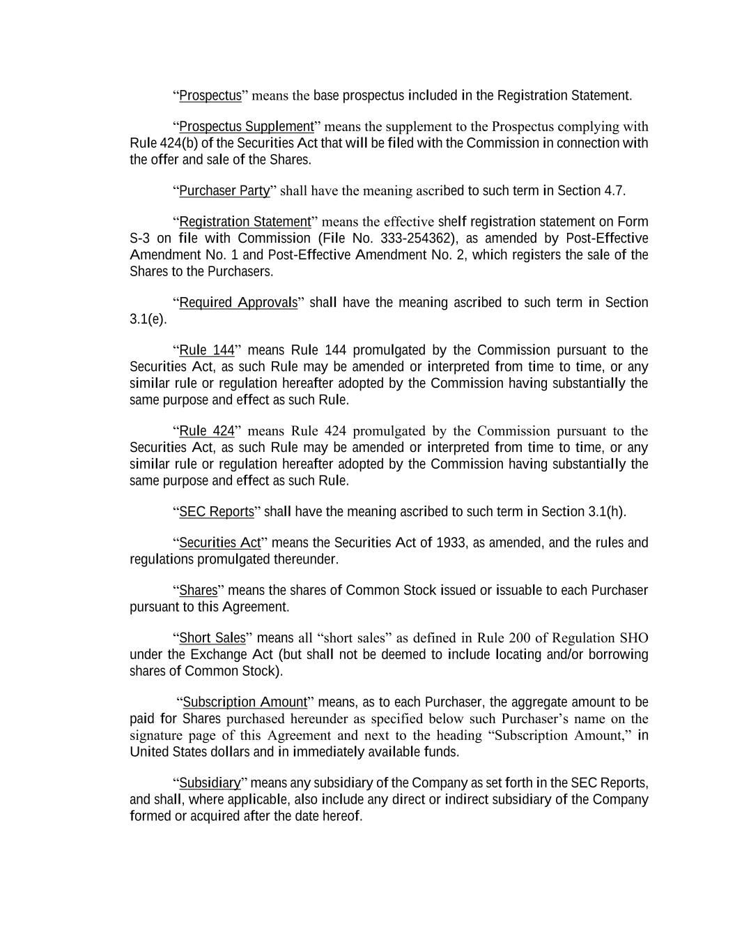 “Prospectus” means the base prospectus included in the Registration Statement. “Prospectus Supplement” means the supplement to the Prospectus complying with Rule 424(b) of the Securities Act that will be filed with the Commission in connection with the offer and sale of the Shares. “Purchaser Party” shall have the meaning ascribed to such term in Section 4.7. “Registration Statement” means the effective shelf registration statement on Form S-3 on file with Commission (File No. 333-254362), as amended by Post-Effective Amendment No. 1 and Post-Effective Amendment No. 2, which registers the sale of the Shares to the Purchasers. “Required Approvals” shall have the meaning ascribed to such term in Section 3.1(e). “Rule 144” means Rule 144 promulgated by the Commission pursuant to the Securities Act, as such Rule may be amended or interpreted from time to time, or any similar rule or regulation hereafter adopted by the Commission having substantially the same purpose and effect as such Rule. “Rule 424” means Rule 424 promulgated by the Commission pursuant to the Securities Act, as such Rule may be amended or interpreted from time to time, or any similar rule or regulation hereafter adopted by the Commission having substantially the same purpose and effect as such Rule. “SEC Reports” shall have the meaning ascribed to such term in Section 3.1(h). “Securities Act” means the Securities Act of 1933, as amended, and the rules and regulations promulgated thereunder. “Shares” means the shares of Common Stock issued or issuable to each Purchaser pursuant to this Agreement. “Short Sales” means all “short sales” as defined in Rule 200 of Regulation SHO under the Exchange Act (but shall not be deemed to include locating and/or borrowing shares of Common Stock). “Subscription Amount” means, as to each Purchaser, the aggregate amount to be paid for Shares purchased hereunder as specified below such Purchaser’s name on the signature page of this Agreement and next to the heading “Subscription Amount,” in United States dollars and in immediately available funds. “Subsidiary” means any subsidiary of the Company as set forth in the SEC Reports, and shall, where applicable, also include any direct or indirect subsidiary of the Company formed or acquired after the date hereof.