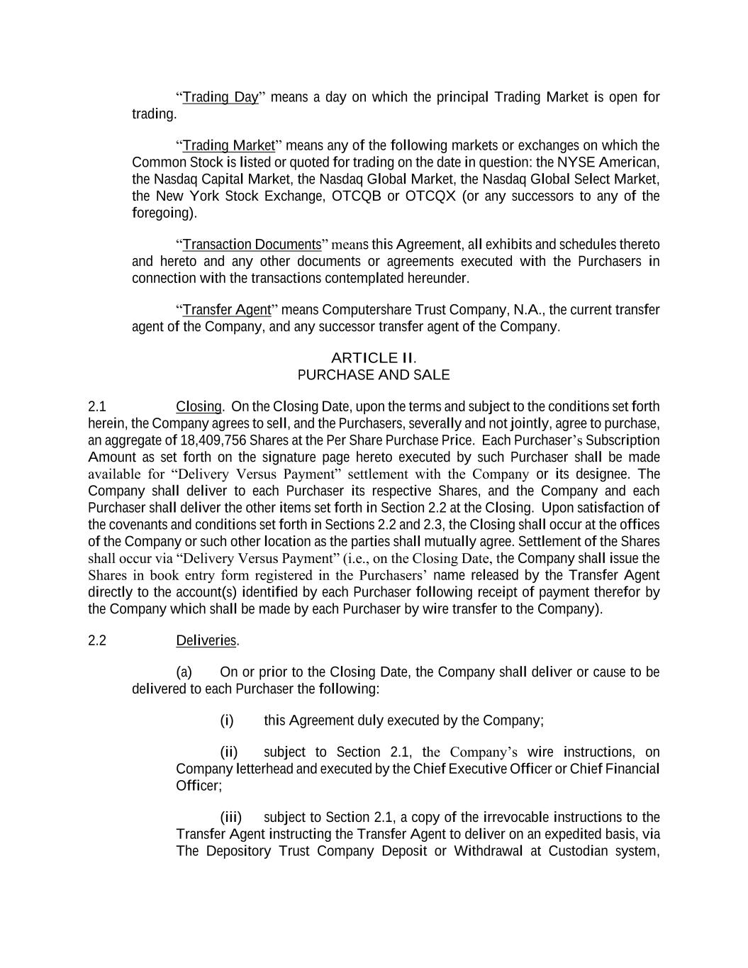 “Trading Day” means a day on which the principal Trading Market is open for trading. “Trading Market” means any of the following markets or exchanges on which the Common Stock is listed or quoted for trading on the date in question: the NYSE American, the Nasdaq Capital Market, the Nasdaq Global Market, the Nasdaq Global Select Market, the New York Stock Exchange, OTCQB or OTCQX (or any successors to any of the foregoing). “Transaction Documents” means this Agreement, all exhibits and schedules thereto and hereto and any other documents or agreements executed with the Purchasers in connection with the transactions contemplated hereunder. “Transfer Agent” means Computershare Trust Company, N.A., the current transfer agent of the Company, and any successor transfer agent of the Company. ARTICLE II. PURCHASE AND SALE 2.1 Closing. On the Closing Date, upon the terms and subject to the conditions set forth herein, the Company agrees to sell, and the Purchasers, severally and not jointly, agree to purchase, an aggregate of 18,409,756 Shares at the Per Share Purchase Price. Each Purchaser’s Subscription Amount as set forth on the signature page hereto executed by such Purchaser shall be made available for “Delivery Versus Payment” settlement with the Company or its designee. The Company shall deliver to each Purchaser its respective Shares, and the Company and each Purchaser shall deliver the other items set forth in Section 2.2 at the Closing. Upon satisfaction of the covenants and conditions set forth in Sections 2.2 and 2.3, the Closing shall occur at the offices of the Company or such other location as the parties shall mutually agree. Settlement of the Shares shall occur via “Delivery Versus Payment” (i.e., on the Closing Date, the Company shall issue the Shares in book entry form registered in the Purchasers’ name released by the Transfer Agent directly to the account(s) identified by each Purchaser following receipt of payment therefor by the Company which shall be made by each Purchaser by wire transfer to the Company). 2.2 Deliveries. (a) On or prior to the Closing Date, the Company shall deliver or cause to be delivered to each Purchaser the following: (i) this Agreement duly executed by the Company; (ii) subject to Section 2.1, the Company’s wire instructions, on Company letterhead and executed by the Chief Executive Officer or Chief Financial Officer; (iii) subject to Section 2.1, a copy of the irrevocable instructions to the Transfer Agent instructing the Transfer Agent to deliver on an expedited basis, via The Depository Trust Company Deposit or Withdrawal at Custodian system,