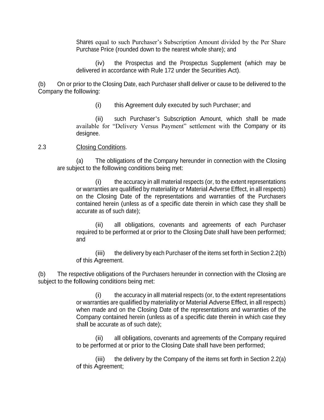 Shares equal to such Purchaser’s Subscription Amount divided by the Per Share Purchase Price (rounded down to the nearest whole share); and (iv) the Prospectus and the Prospectus Supplement (which may be delivered in accordance with Rule 172 under the Securities Act). (b) On or prior to the Closing Date, each Purchaser shall deliver or cause to be delivered to the Company the following: (i) this Agreement duly executed by such Purchaser; and (ii) such Purchaser’s Subscription Amount, which shall be made available for “Delivery Versus Payment” settlement with the Company or its designee. 2.3 Closing Conditions. (a) The obligations of the Company hereunder in connection with the Closing are subject to the following conditions being met: (i) the accuracy in all material respects (or, to the extent representations or warranties are qualified by materiality or Material Adverse Effect, in all respects) on the Closing Date of the representations and warranties of the Purchasers contained herein (unless as of a specific date therein in which case they shall be accurate as of such date); (ii) all obligations, covenants and agreements of each Purchaser required to be performed at or prior to the Closing Date shall have been performed; and (iii) the delivery by each Purchaser of the items set forth in Section 2.2(b) of this Agreement. (b) The respective obligations of the Purchasers hereunder in connection with the Closing are subject to the following conditions being met: (i) the accuracy in all material respects (or, to the extent representations or warranties are qualified by materiality or Material Adverse Effect, in all respects) when made and on the Closing Date of the representations and warranties of the Company contained herein (unless as of a specific date therein in which case they shall be accurate as of such date); (ii) all obligations, covenants and agreements of the Company required to be performed at or prior to the Closing Date shall have been performed; (iii) the delivery by the Company of the items set forth in Section 2.2(a) of this Agreement;