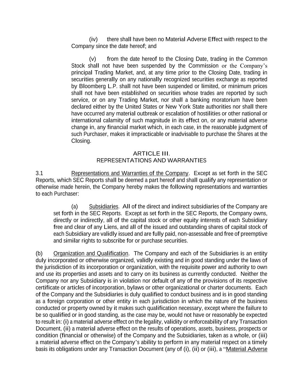 (iv) there shall have been no Material Adverse Effect with respect to the Company since the date hereof; and (v) from the date hereof to the Closing Date, trading in the Common Stock shall not have been suspended by the Commission or the Company’s principal Trading Market, and, at any time prior to the Closing Date, trading in securities generally on any nationally recognized securities exchange as reported by Bloomberg L.P. shall not have been suspended or limited, or minimum prices shall not have been established on securities whose trades are reported by such service, or on any Trading Market, nor shall a banking moratorium have been declared either by the United States or New York State authorities nor shall there have occurred any material outbreak or escalation of hostilities or other national or international calamity of such magnitude in its effect on, or any material adverse change in, any financial market which, in each case, in the reasonable judgment of such Purchaser, makes it impracticable or inadvisable to purchase the Shares at the Closing. ARTICLE III. REPRESENTATIONS AND WARRANTIES 3.1 Representations and Warranties of the Company. Except as set forth in the SEC Reports, which SEC Reports shall be deemed a part hereof and shall qualify any representation or otherwise made herein, the Company hereby makes the following representations and warranties to each Purchaser: (a) Subsidiaries. All of the direct and indirect subsidiaries of the Company are set forth in the SEC Reports. Except as set forth in the SEC Reports, the Company owns, directly or indirectly, all of the capital stock or other equity interests of each Subsidiary free and clear of any Liens, and all of the issued and outstanding shares of capital stock of each Subsidiary are validly issued and are fully paid, non-assessable and free of preemptive and similar rights to subscribe for or purchase securities. (b) Organization and Qualification. The Company and each of the Subsidiaries is an entity duly incorporated or otherwise organized, validly existing and in good standing under the laws of the jurisdiction of its incorporation or organization, with the requisite power and authority to own and use its properties and assets and to carry on its business as currently conducted. Neither the Company nor any Subsidiary is in violation nor default of any of the provisions of its respective certificate or articles of incorporation, bylaws or other organizational or charter documents. Each of the Company and the Subsidiaries is duly qualified to conduct business and is in good standing as a foreign corporation or other entity in each jurisdiction in which the nature of the business conducted or property owned by it makes such qualification necessary, except where the failure to be so qualified or in good standing, as the case may be, would not have or reasonably be expected to result in: (i) a material adverse effect on the legality, validity or enforceability of any Transaction Document, (ii) a material adverse effect on the results of operations, assets, business, prospects or condition (financial or otherwise) of the Company and the Subsidiaries, taken as a whole, or (iii) a material adverse effect on the Company’s ability to perform in any material respect on a timely basis its obligations under any Transaction Document (any of (i), (ii) or (iii), a “Material Adverse