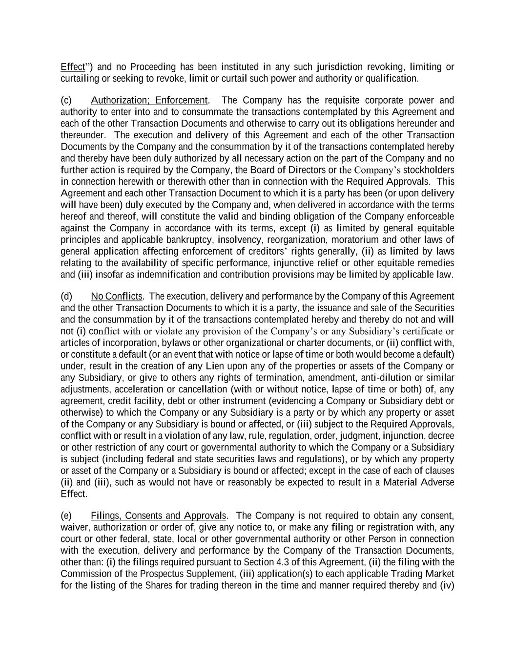 Effect”) and no Proceeding has been instituted in any such jurisdiction revoking, limiting or curtailing or seeking to revoke, limit or curtail such power and authority or qualification. (c) Authorization; Enforcement. The Company has the requisite corporate power and authority to enter into and to consummate the transactions contemplated by this Agreement and each of the other Transaction Documents and otherwise to carry out its obligations hereunder and thereunder. The execution and delivery of this Agreement and each of the other Transaction Documents by the Company and the consummation by it of the transactions contemplated hereby and thereby have been duly authorized by all necessary action on the part of the Company and no further action is required by the Company, the Board of Directors or the Company’s stockholders in connection herewith or therewith other than in connection with the Required Approvals. This Agreement and each other Transaction Document to which it is a party has been (or upon delivery will have been) duly executed by the Company and, when delivered in accordance with the terms hereof and thereof, will constitute the valid and binding obligation of the Company enforceable against the Company in accordance with its terms, except (i) as limited by general equitable principles and applicable bankruptcy, insolvency, reorganization, moratorium and other laws of general application affecting enforcement of creditors’ rights generally, (ii) as limited by laws relating to the availability of specific performance, injunctive relief or other equitable remedies and (iii) insofar as indemnification and contribution provisions may be limited by applicable law. (d) No Conflicts. The execution, delivery and performance by the Company of this Agreement and the other Transaction Documents to which it is a party, the issuance and sale of the Securities and the consummation by it of the transactions contemplated hereby and thereby do not and will not (i) conflict with or violate any provision of the Company’s or any Subsidiary’s certificate or articles of incorporation, bylaws or other organizational or charter documents, or (ii) conflict with, or constitute a default (or an event that with notice or lapse of time or both would become a default) under, result in the creation of any Lien upon any of the properties or assets of the Company or any Subsidiary, or give to others any rights of termination, amendment, anti-dilution or similar adjustments, acceleration or cancellation (with or without notice, lapse of time or both) of, any agreement, credit facility, debt or other instrument (evidencing a Company or Subsidiary debt or otherwise) to which the Company or any Subsidiary is a party or by which any property or asset of the Company or any Subsidiary is bound or affected, or (iii) subject to the Required Approvals, conflict with or result in a violation of any law, rule, regulation, order, judgment, injunction, decree or other restriction of any court or governmental authority to which the Company or a Subsidiary is subject (including federal and state securities laws and regulations), or by which any property or asset of the Company or a Subsidiary is bound or affected; except in the case of each of clauses (ii) and (iii), such as would not have or reasonably be expected to result in a Material Adverse Effect. (e) Filings, Consents and Approvals. The Company is not required to obtain any consent, waiver, authorization or order of, give any notice to, or make any filing or registration with, any court or other federal, state, local or other governmental authority or other Person in connection with the execution, delivery and performance by the Company of the Transaction Documents, other than: (i) the filings required pursuant to Section 4.3 of this Agreement, (ii) the filing with the Commission of the Prospectus Supplement, (iii) application(s) to each applicable Trading Market for the listing of the Shares for trading thereon in the time and manner required thereby and (iv)