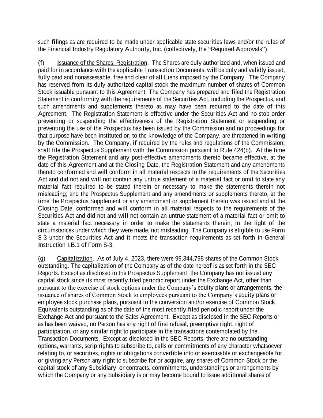 such filings as are required to be made under applicable state securities laws and/or the rules of the Financial Industry Regulatory Authority, Inc. (collectively, the “Required Approvals”). (f) Issuance of the Shares; Registration. The Shares are duly authorized and, when issued and paid for in accordance with the applicable Transaction Documents, will be duly and validly issued, fully paid and nonassessable, free and clear of all Liens imposed by the Company. The Company has reserved from its duly authorized capital stock the maximum number of shares of Common Stock issuable pursuant to this Agreement. The Company has prepared and filed the Registration Statement in conformity with the requirements of the Securities Act, including the Prospectus, and such amendments and supplements thereto as may have been required to the date of this Agreement. The Registration Statement is effective under the Securities Act and no stop order preventing or suspending the effectiveness of the Registration Statement or suspending or preventing the use of the Prospectus has been issued by the Commission and no proceedings for that purpose have been instituted or, to the knowledge of the Company, are threatened in writing by the Commission. The Company, if required by the rules and regulations of the Commission, shall file the Prospectus Supplement with the Commission pursuant to Rule 424(b). At the time the Registration Statement and any post-effective amendments thereto became effective, at the date of this Agreement and at the Closing Date, the Registration Statement and any amendments thereto conformed and will conform in all material respects to the requirements of the Securities Act and did not and will not contain any untrue statement of a material fact or omit to state any material fact required to be stated therein or necessary to make the statements therein not misleading; and the Prospectus Supplement and any amendments or supplements thereto, at the time the Prospectus Supplement or any amendment or supplement thereto was issued and at the Closing Date, conformed and will conform in all material respects to the requirements of the Securities Act and did not and will not contain an untrue statement of a material fact or omit to state a material fact necessary in order to make the statements therein, in the light of the circumstances under which they were made, not misleading. The Company is eligible to use Form S-3 under the Securities Act and it meets the transaction requirements as set forth in General Instruction I.B.1 of Form S-3. (g) Capitalization. As of July 4, 2023, there were 99,344,798 shares of the Common Stock outstanding. The capitalization of the Company as of the date hereof is as set forth in the SEC Reports. Except as disclosed in the Prospectus Supplement, the Company has not issued any capital stock since its most recently filed periodic report under the Exchange Act, other than pursuant to the exercise of stock options under the Company’s equity plans or arrangements, the issuance of shares of Common Stock to employees pursuant to the Company’s equity plans or employee stock purchase plans, pursuant to the conversion and/or exercise of Common Stock Equivalents outstanding as of the date of the most recently filed periodic report under the Exchange Act and pursuant to the Sales Agreement. Except as disclosed in the SEC Reports or as has been waived, no Person has any right of first refusal, preemptive right, right of participation, or any similar right to participate in the transactions contemplated by the Transaction Documents. Except as disclosed in the SEC Reports, there are no outstanding options, warrants, scrip rights to subscribe to, calls or commitments of any character whatsoever relating to, or securities, rights or obligations convertible into or exercisable or exchangeable for, or giving any Person any right to subscribe for or acquire, any shares of Common Stock or the capital stock of any Subsidiary, or contracts, commitments, understandings or arrangements by which the Company or any Subsidiary is or may become bound to issue additional shares of