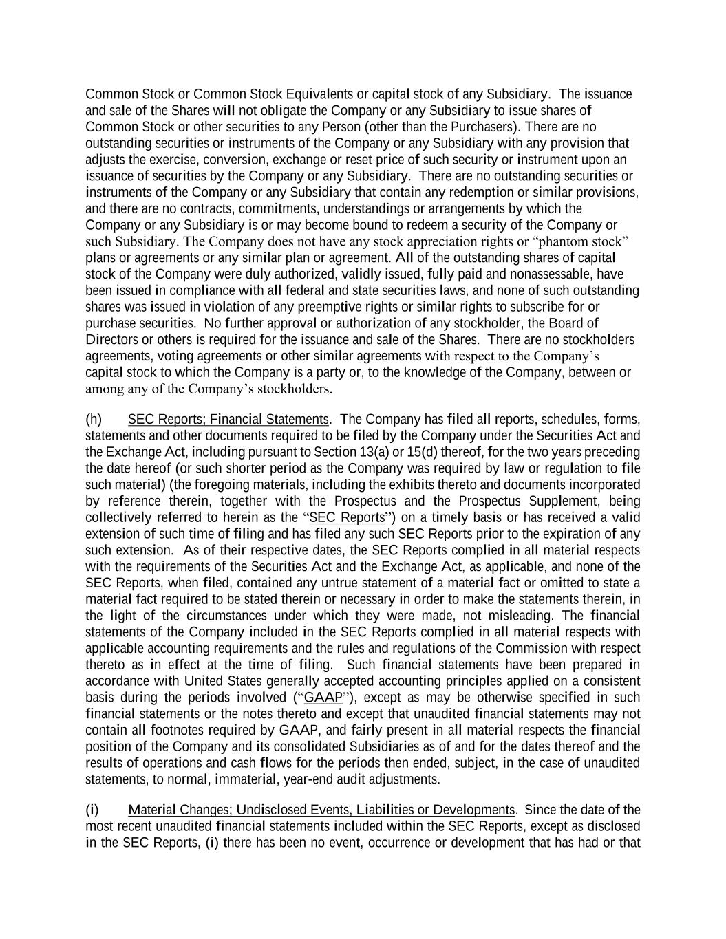 Common Stock or Common Stock Equivalents or capital stock of any Subsidiary. The issuance and sale of the Shares will not obligate the Company or any Subsidiary to issue shares of Common Stock or other securities to any Person (other than the Purchasers). There are no outstanding securities or instruments of the Company or any Subsidiary with any provision that adjusts the exercise, conversion, exchange or reset price of such security or instrument upon an issuance of securities by the Company or any Subsidiary. There are no outstanding securities or instruments of the Company or any Subsidiary that contain any redemption or similar provisions, and there are no contracts, commitments, understandings or arrangements by which the Company or any Subsidiary is or may become bound to redeem a security of the Company or such Subsidiary. The Company does not have any stock appreciation rights or “phantom stock” plans or agreements or any similar plan or agreement. All of the outstanding shares of capital stock of the Company were duly authorized, validly issued, fully paid and nonassessable, have been issued in compliance with all federal and state securities laws, and none of such outstanding shares was issued in violation of any preemptive rights or similar rights to subscribe for or purchase securities. No further approval or authorization of any stockholder, the Board of Directors or others is required for the issuance and sale of the Shares. There are no stockholders agreements, voting agreements or other similar agreements with respect to the Company’s capital stock to which the Company is a party or, to the knowledge of the Company, between or among any of the Company’s stockholders. (h) SEC Reports; Financial Statements. The Company has filed all reports, schedules, forms, statements and other documents required to be filed by the Company under the Securities Act and the Exchange Act, including pursuant to Section 13(a) or 15(d) thereof, for the two years preceding the date hereof (or such shorter period as the Company was required by law or regulation to file such material) (the foregoing materials, including the exhibits thereto and documents incorporated by reference therein, together with the Prospectus and the Prospectus Supplement, being collectively referred to herein as the “SEC Reports”) on a timely basis or has received a valid extension of such time of filing and has filed any such SEC Reports prior to the expiration of any such extension. As of their respective dates, the SEC Reports complied in all material respects with the requirements of the Securities Act and the Exchange Act, as applicable, and none of the SEC Reports, when filed, contained any untrue statement of a material fact or omitted to state a material fact required to be stated therein or necessary in order to make the statements therein, in the light of the circumstances under which they were made, not misleading. The financial statements of the Company included in the SEC Reports complied in all material respects with applicable accounting requirements and the rules and regulations of the Commission with respect thereto as in effect at the time of filing. Such financial statements have been prepared in accordance with United States generally accepted accounting principles applied on a consistent basis during the periods involved (“GAAP”), except as may be otherwise specified in such financial statements or the notes thereto and except that unaudited financial statements may not contain all footnotes required by GAAP, and fairly present in all material respects the financial position of the Company and its consolidated Subsidiaries as of and for the dates thereof and the results of operations and cash flows for the periods then ended, subject, in the case of unaudited statements, to normal, immaterial, year-end audit adjustments. (i) Material Changes; Undisclosed Events, Liabilities or Developments. Since the date of the most recent unaudited financial statements included within the SEC Reports, except as disclosed in the SEC Reports, (i) there has been no event, occurrence or development that has had or that