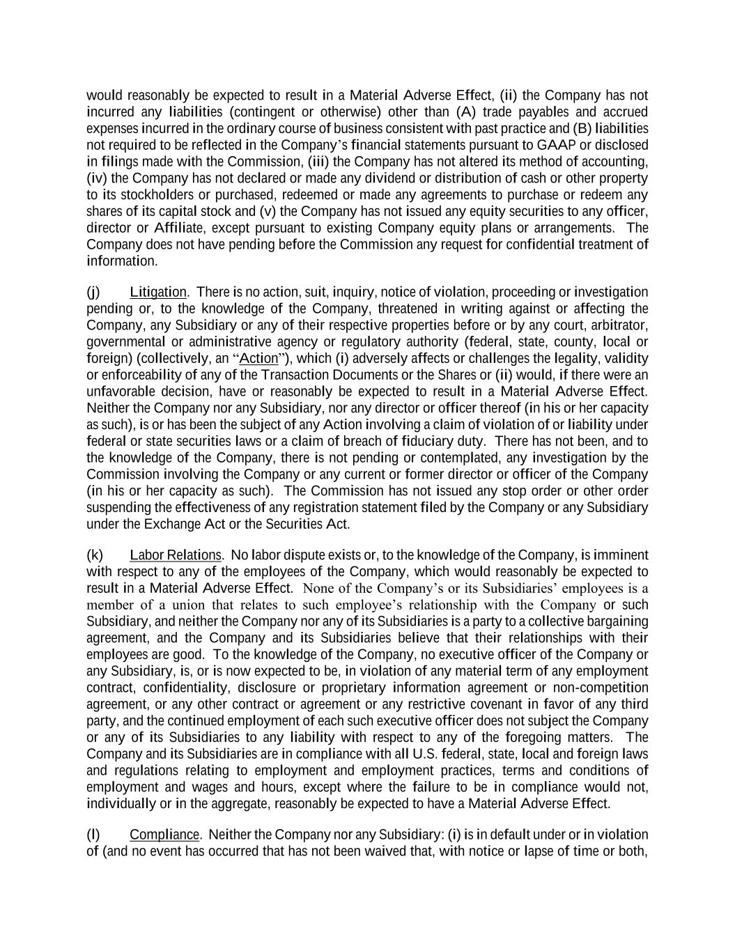 would reasonably be expected to result in a Material Adverse Effect, (ii) the Company has not incurred any liabilities (contingent or otherwise) other than (A) trade payables and accrued expenses incurred in the ordinary course of business consistent with past practice and (B) liabilities not required to be reflected in the Company’s financial statements pursuant to GAAP or disclosed in filings made with the Commission, (iii) the Company has not altered its method of accounting, (iv) the Company has not declared or made any dividend or distribution of cash or other property to its stockholders or purchased, redeemed or made any agreements to purchase or redeem any shares of its capital stock and (v) the Company has not issued any equity securities to any officer, director or Affiliate, except pursuant to existing Company equity plans or arrangements. The Company does not have pending before the Commission any request for confidential treatment of information. (j) Litigation. There is no action, suit, inquiry, notice of violation, proceeding or investigation pending or, to the knowledge of the Company, threatened in writing against or affecting the Company, any Subsidiary or any of their respective properties before or by any court, arbitrator, governmental or administrative agency or regulatory authority (federal, state, county, local or foreign) (collectively, an “Action”), which (i) adversely affects or challenges the legality, validity or enforceability of any of the Transaction Documents or the Shares or (ii) would, if there were an unfavorable decision, have or reasonably be expected to result in a Material Adverse Effect. Neither the Company nor any Subsidiary, nor any director or officer thereof (in his or her capacity as such), is or has been the subject of any Action involving a claim of violation of or liability under federal or state securities laws or a claim of breach of fiduciary duty. There has not been, and to the knowledge of the Company, there is not pending or contemplated, any investigation by the Commission involving the Company or any current or former director or officer of the Company (in his or her capacity as such). The Commission has not issued any stop order or other order suspending the effectiveness of any registration statement filed by the Company or any Subsidiary under the Exchange Act or the Securities Act. (k) Labor Relations. No labor dispute exists or, to the knowledge of the Company, is imminent with respect to any of the employees of the Company, which would reasonably be expected to result in a Material Adverse Effect. None of the Company’s or its Subsidiaries’ employees is a member of a union that relates to such employee’s relationship with the Company or such Subsidiary, and neither the Company nor any of its Subsidiaries is a party to a collective bargaining agreement, and the Company and its Subsidiaries believe that their relationships with their employees are good. To the knowledge of the Company, no executive officer of the Company or any Subsidiary, is, or is now expected to be, in violation of any material term of any employment contract, confidentiality, disclosure or proprietary information agreement or non-competition agreement, or any other contract or agreement or any restrictive covenant in favor of any third party, and the continued employment of each such executive officer does not subject the Company or any of its Subsidiaries to any liability with respect to any of the foregoing matters. The Company and its Subsidiaries are in compliance with all U.S. federal, state, local and foreign laws and regulations relating to employment and employment practices, terms and conditions of employment and wages and hours, except where the failure to be in compliance would not, individually or in the aggregate, reasonably be expected to have a Material Adverse Effect. (l) Compliance. Neither the Company nor any Subsidiary: (i) is in default under or in violation of (and no event has occurred that has not been waived that, with notice or lapse of time or both,