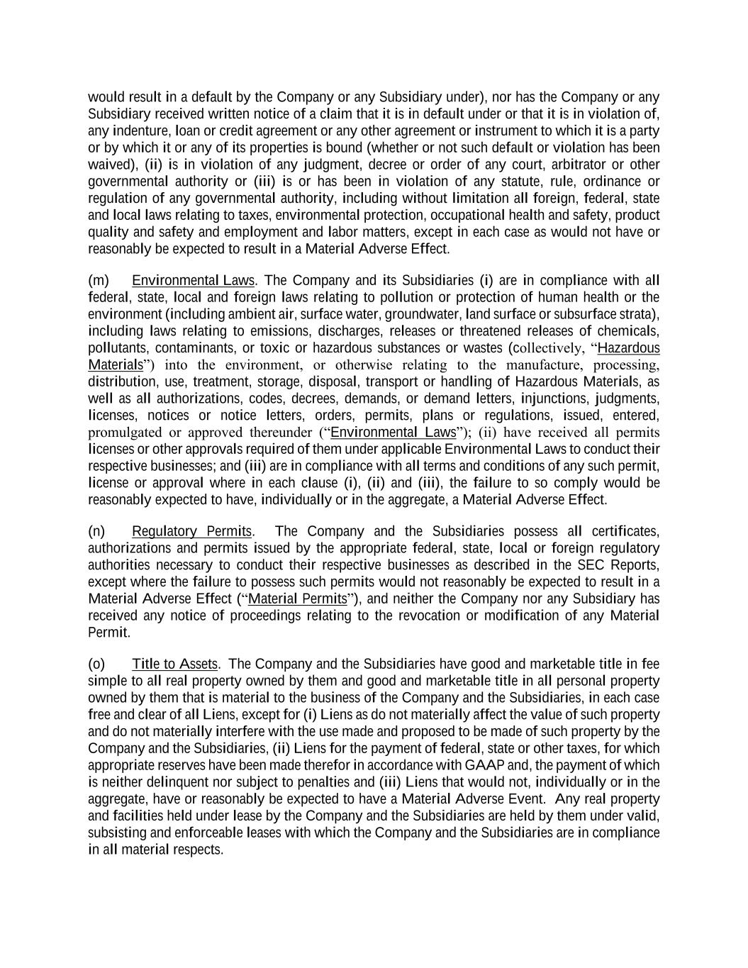 would result in a default by the Company or any Subsidiary under), nor has the Company or any Subsidiary received written notice of a claim that it is in default under or that it is in violation of, any indenture, loan or credit agreement or any other agreement or instrument to which it is a party or by which it or any of its properties is bound (whether or not such default or violation has been waived), (ii) is in violation of any judgment, decree or order of any court, arbitrator or other governmental authority or (iii) is or has been in violation of any statute, rule, ordinance or regulation of any governmental authority, including without limitation all foreign, federal, state and local laws relating to taxes, environmental protection, occupational health and safety, product quality and safety and employment and labor matters, except in each case as would not have or reasonably be expected to result in a Material Adverse Effect. (m) Environmental Laws. The Company and its Subsidiaries (i) are in compliance with all federal, state, local and foreign laws relating to pollution or protection of human health or the environment (including ambient air, surface water, groundwater, land surface or subsurface strata), including laws relating to emissions, discharges, releases or threatened releases of chemicals, pollutants, contaminants, or toxic or hazardous substances or wastes (collectively, “Hazardous Materials”) into the environment, or otherwise relating to the manufacture, processing, distribution, use, treatment, storage, disposal, transport or handling of Hazardous Materials, as well as all authorizations, codes, decrees, demands, or demand letters, injunctions, judgments, licenses, notices or notice letters, orders, permits, plans or regulations, issued, entered, promulgated or approved thereunder (“Environmental Laws”); (ii) have received all permits licenses or other approvals required of them under applicable Environmental Laws to conduct their respective businesses; and (iii) are in compliance with all terms and conditions of any such permit, license or approval where in each clause (i), (ii) and (iii), the failure to so comply would be reasonably expected to have, individually or in the aggregate, a Material Adverse Effect. (n) Regulatory Permits. The Company and the Subsidiaries possess all certificates, authorizations and permits issued by the appropriate federal, state, local or foreign regulatory authorities necessary to conduct their respective businesses as described in the SEC Reports, except where the failure to possess such permits would not reasonably be expected to result in a Material Adverse Effect (“Material Permits”), and neither the Company nor any Subsidiary has received any notice of proceedings relating to the revocation or modification of any Material Permit. (o) Title to Assets. The Company and the Subsidiaries have good and marketable title in fee simple to all real property owned by them and good and marketable title in all personal property owned by them that is material to the business of the Company and the Subsidiaries, in each case free and clear of all Liens, except for (i) Liens as do not materially affect the value of such property and do not materially interfere with the use made and proposed to be made of such property by the Company and the Subsidiaries, (ii) Liens for the payment of federal, state or other taxes, for which appropriate reserves have been made therefor in accordance with GAAP and, the payment of which is neither delinquent nor subject to penalties and (iii) Liens that would not, individually or in the aggregate, have or reasonably be expected to have a Material Adverse Event. Any real property and facilities held under lease by the Company and the Subsidiaries are held by them under valid, subsisting and enforceable leases with which the Company and the Subsidiaries are in compliance in all material respects.