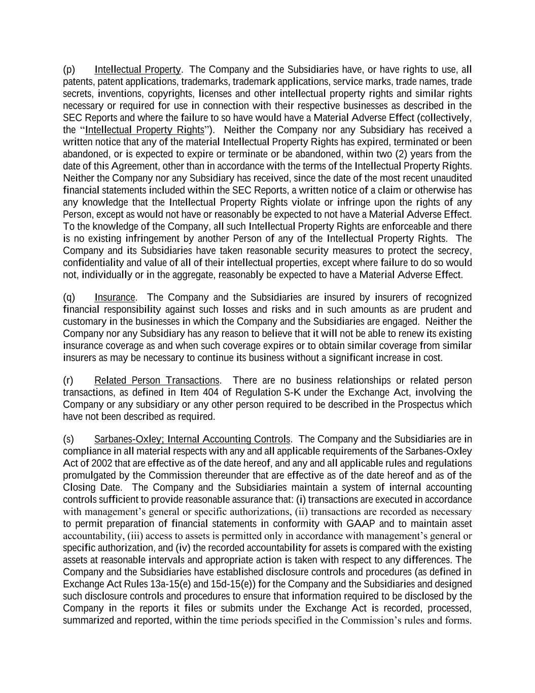 (p) Intellectual Property. The Company and the Subsidiaries have, or have rights to use, all patents, patent applications, trademarks, trademark applications, service marks, trade names, trade secrets, inventions, copyrights, licenses and other intellectual property rights and similar rights necessary or required for use in connection with their respective businesses as described in the SEC Reports and where the failure to so have would have a Material Adverse Effect (collectively, the “Intellectual Property Rights”). Neither the Company nor any Subsidiary has received a written notice that any of the material Intellectual Property Rights has expired, terminated or been abandoned, or is expected to expire or terminate or be abandoned, within two (2) years from the date of this Agreement, other than in accordance with the terms of the Intellectual Property Rights. Neither the Company nor any Subsidiary has received, since the date of the most recent unaudited financial statements included within the SEC Reports, a written notice of a claim or otherwise has any knowledge that the Intellectual Property Rights violate or infringe upon the rights of any Person, except as would not have or reasonably be expected to not have a Material Adverse Effect. To the knowledge of the Company, all such Intellectual Property Rights are enforceable and there is no existing infringement by another Person of any of the Intellectual Property Rights. The Company and its Subsidiaries have taken reasonable security measures to protect the secrecy, confidentiality and value of all of their intellectual properties, except where failure to do so would not, individually or in the aggregate, reasonably be expected to have a Material Adverse Effect. (q) Insurance. The Company and the Subsidiaries are insured by insurers of recognized financial responsibility against such losses and risks and in such amounts as are prudent and customary in the businesses in which the Company and the Subsidiaries are engaged. Neither the Company nor any Subsidiary has any reason to believe that it will not be able to renew its existing insurance coverage as and when such coverage expires or to obtain similar coverage from similar insurers as may be necessary to continue its business without a significant increase in cost. (r) Related Person Transactions. There are no business relationships or related person transactions, as defined in Item 404 of Regulation S-K under the Exchange Act, involving the Company or any subsidiary or any other person required to be described in the Prospectus which have not been described as required. (s) Sarbanes-Oxley; Internal Accounting Controls. The Company and the Subsidiaries are in compliance in all material respects with any and all applicable requirements of the Sarbanes-Oxley Act of 2002 that are effective as of the date hereof, and any and all applicable rules and regulations promulgated by the Commission thereunder that are effective as of the date hereof and as of the Closing Date. The Company and the Subsidiaries maintain a system of internal accounting controls sufficient to provide reasonable assurance that: (i) transactions are executed in accordance with management’s general or specific authorizations, (ii) transactions are recorded as necessary to permit preparation of financial statements in conformity with GAAP and to maintain asset accountability, (iii) access to assets is permitted only in accordance with management’s general or specific authorization, and (iv) the recorded accountability for assets is compared with the existing assets at reasonable intervals and appropriate action is taken with respect to any differences. The Company and the Subsidiaries have established disclosure controls and procedures (as defined in Exchange Act Rules 13a-15(e) and 15d-15(e)) for the Company and the Subsidiaries and designed such disclosure controls and procedures to ensure that information required to be disclosed by the Company in the reports it files or submits under the Exchange Act is recorded, processed, summarized and reported, within the time periods specified in the Commission’s rules and forms.