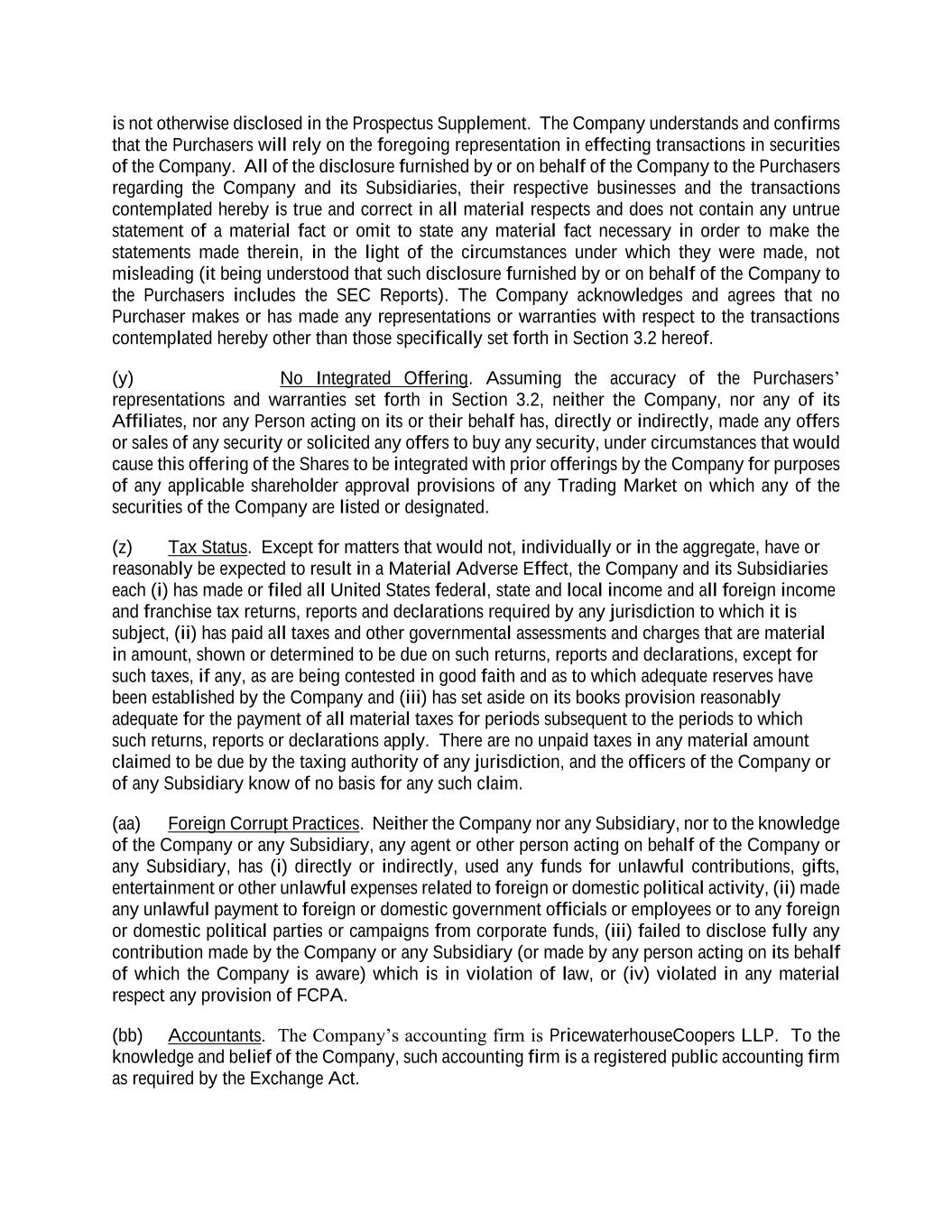 is not otherwise disclosed in the Prospectus Supplement. The Company understands and confirms that the Purchasers will rely on the foregoing representation in effecting transactions in securities of the Company. All of the disclosure furnished by or on behalf of the Company to the Purchasers regarding the Company and its Subsidiaries, their respective businesses and the transactions contemplated hereby is true and correct in all material respects and does not contain any untrue statement of a material fact or omit to state any material fact necessary in order to make the statements made therein, in the light of the circumstances under which they were made, not misleading (it being understood that such disclosure furnished by or on behalf of the Company to the Purchasers includes the SEC Reports). The Company acknowledges and agrees that no Purchaser makes or has made any representations or warranties with respect to the transactions contemplated hereby other than those specifically set forth in Section 3.2 hereof. (y) No Integrated Offering. Assuming the accuracy of the Purchasers’ representations and warranties set forth in Section 3.2, neither the Company, nor any of its Affiliates, nor any Person acting on its or their behalf has, directly or indirectly, made any offers or sales of any security or solicited any offers to buy any security, under circumstances that would cause this offering of the Shares to be integrated with prior offerings by the Company for purposes of any applicable shareholder approval provisions of any Trading Market on which any of the securities of the Company are listed or designated. (z) Tax Status. Except for matters that would not, individually or in the aggregate, have or reasonably be expected to result in a Material Adverse Effect, the Company and its Subsidiaries each (i) has made or filed all United States federal, state and local income and all foreign income and franchise tax returns, reports and declarations required by any jurisdiction to which it is subject, (ii) has paid all taxes and other governmental assessments and charges that are material in amount, shown or determined to be due on such returns, reports and declarations, except for such taxes, if any, as are being contested in good faith and as to which adequate reserves have been established by the Company and (iii) has set aside on its books provision reasonably adequate for the payment of all material taxes for periods subsequent to the periods to which such returns, reports or declarations apply. There are no unpaid taxes in any material amount claimed to be due by the taxing authority of any jurisdiction, and the officers of the Company or of any Subsidiary know of no basis for any such claim. (aa) Foreign Corrupt Practices. Neither the Company nor any Subsidiary, nor to the knowledge of the Company or any Subsidiary, any agent or other person acting on behalf of the Company or any Subsidiary, has (i) directly or indirectly, used any funds for unlawful contributions, gifts, entertainment or other unlawful expenses related to foreign or domestic political activity, (ii) made any unlawful payment to foreign or domestic government officials or employees or to any foreign or domestic political parties or campaigns from corporate funds, (iii) failed to disclose fully any contribution made by the Company or any Subsidiary (or made by any person acting on its behalf of which the Company is aware) which is in violation of law, or (iv) violated in any material respect any provision of FCPA. (bb) Accountants. The Company’s accounting firm is PricewaterhouseCoopers LLP. To the knowledge and belief of the Company, such accounting firm is a registered public accounting firm as required by the Exchange Act.