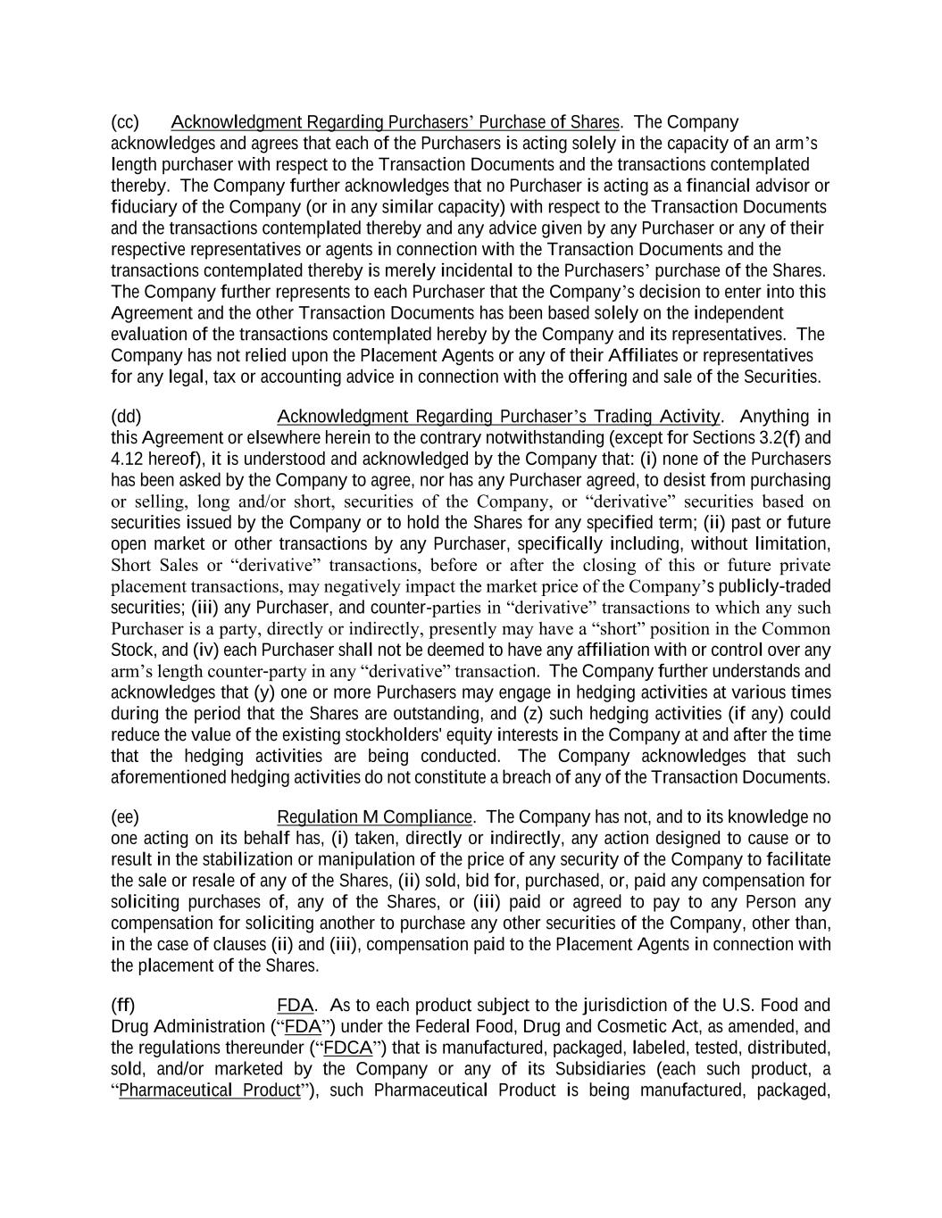 (cc) Acknowledgment Regarding Purchasers’ Purchase of Shares. The Company acknowledges and agrees that each of the Purchasers is acting solely in the capacity of an arm’s length purchaser with respect to the Transaction Documents and the transactions contemplated thereby. The Company further acknowledges that no Purchaser is acting as a financial advisor or fiduciary of the Company (or in any similar capacity) with respect to the Transaction Documents and the transactions contemplated thereby and any advice given by any Purchaser or any of their respective representatives or agents in connection with the Transaction Documents and the transactions contemplated thereby is merely incidental to the Purchasers’ purchase of the Shares. The Company further represents to each Purchaser that the Company’s decision to enter into this Agreement and the other Transaction Documents has been based solely on the independent evaluation of the transactions contemplated hereby by the Company and its representatives. The Company has not relied upon the Placement Agents or any of their Affiliates or representatives for any legal, tax or accounting advice in connection with the offering and sale of the Securities. (dd) Acknowledgment Regarding Purchaser’s Trading Activity. Anything in this Agreement or elsewhere herein to the contrary notwithstanding (except for Sections 3.2(f) and 4.12 hereof), it is understood and acknowledged by the Company that: (i) none of the Purchasers has been asked by the Company to agree, nor has any Purchaser agreed, to desist from purchasing or selling, long and/or short, securities of the Company, or “derivative” securities based on securities issued by the Company or to hold the Shares for any specified term; (ii) past or future open market or other transactions by any Purchaser, specifically including, without limitation, Short Sales or “derivative” transactions, before or after the closing of this or future private placement transactions, may negatively impact the market price of the Company’s publicly-traded securities; (iii) any Purchaser, and counter-parties in “derivative” transactions to which any such Purchaser is a party, directly or indirectly, presently may have a “short” position in the Common Stock, and (iv) each Purchaser shall not be deemed to have any affiliation with or control over any arm’s length counter-party in any “derivative” transaction. The Company further understands and acknowledges that (y) one or more Purchasers may engage in hedging activities at various times during the period that the Shares are outstanding, and (z) such hedging activities (if any) could reduce the value of the existing stockholders' equity interests in the Company at and after the time that the hedging activities are being conducted. The Company acknowledges that such aforementioned hedging activities do not constitute a breach of any of the Transaction Documents. (ee) Regulation M Compliance. The Company has not, and to its knowledge no one acting on its behalf has, (i) taken, directly or indirectly, any action designed to cause or to result in the stabilization or manipulation of the price of any security of the Company to facilitate the sale or resale of any of the Shares, (ii) sold, bid for, purchased, or, paid any compensation for soliciting purchases of, any of the Shares, or (iii) paid or agreed to pay to any Person any compensation for soliciting another to purchase any other securities of the Company, other than, in the case of clauses (ii) and (iii), compensation paid to the Placement Agents in connection with the placement of the Shares. (ff) FDA. As to each product subject to the jurisdiction of the U.S. Food and Drug Administration (“FDA”) under the Federal Food, Drug and Cosmetic Act, as amended, and the regulations thereunder (“FDCA”) that is manufactured, packaged, labeled, tested, distributed, sold, and/or marketed by the Company or any of its Subsidiaries (each such product, a “Pharmaceutical Product”), such Pharmaceutical Product is being manufactured, packaged,