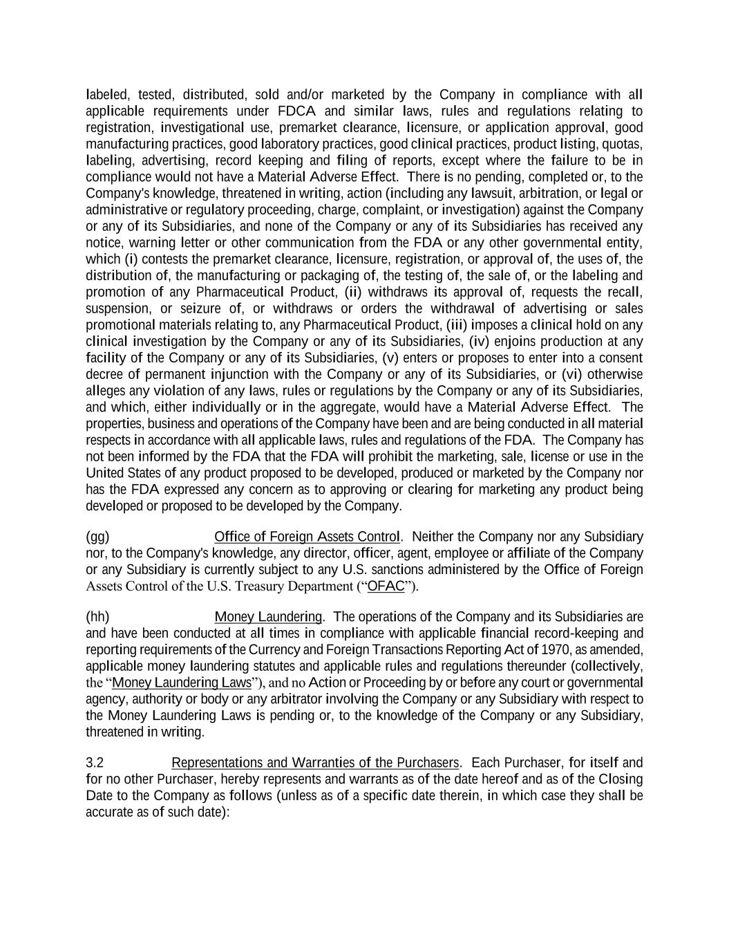 labeled, tested, distributed, sold and/or marketed by the Company in compliance with all applicable requirements under FDCA and similar laws, rules and regulations relating to registration, investigational use, premarket clearance, licensure, or application approval, good manufacturing practices, good laboratory practices, good clinical practices, product listing, quotas, labeling, advertising, record keeping and filing of reports, except where the failure to be in compliance would not have a Material Adverse Effect. There is no pending, completed or, to the Company's knowledge, threatened in writing, action (including any lawsuit, arbitration, or legal or administrative or regulatory proceeding, charge, complaint, or investigation) against the Company or any of its Subsidiaries, and none of the Company or any of its Subsidiaries has received any notice, warning letter or other communication from the FDA or any other governmental entity, which (i) contests the premarket clearance, licensure, registration, or approval of, the uses of, the distribution of, the manufacturing or packaging of, the testing of, the sale of, or the labeling and promotion of any Pharmaceutical Product, (ii) withdraws its approval of, requests the recall, suspension, or seizure of, or withdraws or orders the withdrawal of advertising or sales promotional materials relating to, any Pharmaceutical Product, (iii) imposes a clinical hold on any clinical investigation by the Company or any of its Subsidiaries, (iv) enjoins production at any facility of the Company or any of its Subsidiaries, (v) enters or proposes to enter into a consent decree of permanent injunction with the Company or any of its Subsidiaries, or (vi) otherwise alleges any violation of any laws, rules or regulations by the Company or any of its Subsidiaries, and which, either individually or in the aggregate, would have a Material Adverse Effect. The properties, business and operations of the Company have been and are being conducted in all material respects in accordance with all applicable laws, rules and regulations of the FDA. The Company has not been informed by the FDA that the FDA will prohibit the marketing, sale, license or use in the United States of any product proposed to be developed, produced or marketed by the Company nor has the FDA expressed any concern as to approving or clearing for marketing any product being developed or proposed to be developed by the Company. (gg) Office of Foreign Assets Control. Neither the Company nor any Subsidiary nor, to the Company's knowledge, any director, officer, agent, employee or affiliate of the Company or any Subsidiary is currently subject to any U.S. sanctions administered by the Office of Foreign Assets Control of the U.S. Treasury Department (“OFAC”). (hh) Money Laundering. The operations of the Company and its Subsidiaries are and have been conducted at all times in compliance with applicable financial record-keeping and reporting requirements of the Currency and Foreign Transactions Reporting Act of 1970, as amended, applicable money laundering statutes and applicable rules and regulations thereunder (collectively, the “Money Laundering Laws”), and no Action or Proceeding by or before any court or governmental agency, authority or body or any arbitrator involving the Company or any Subsidiary with respect to the Money Laundering Laws is pending or, to the knowledge of the Company or any Subsidiary, threatened in writing. 3.2 Representations and Warranties of the Purchasers. Each Purchaser, for itself and for no other Purchaser, hereby represents and warrants as of the date hereof and as of the Closing Date to the Company as follows (unless as of a specific date therein, in which case they shall be accurate as of such date):
