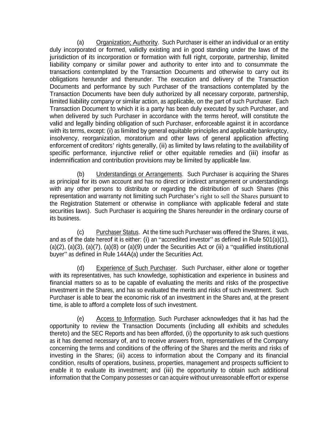 (a) Organization; Authority. Such Purchaser is either an individual or an entity duly incorporated or formed, validly existing and in good standing under the laws of the jurisdiction of its incorporation or formation with full right, corporate, partnership, limited liability company or similar power and authority to enter into and to consummate the transactions contemplated by the Transaction Documents and otherwise to carry out its obligations hereunder and thereunder. The execution and delivery of the Transaction Documents and performance by such Purchaser of the transactions contemplated by the Transaction Documents have been duly authorized by all necessary corporate, partnership, limited liability company or similar action, as applicable, on the part of such Purchaser. Each Transaction Document to which it is a party has been duly executed by such Purchaser, and when delivered by such Purchaser in accordance with the terms hereof, will constitute the valid and legally binding obligation of such Purchaser, enforceable against it in accordance with its terms, except: (i) as limited by general equitable principles and applicable bankruptcy, insolvency, reorganization, moratorium and other laws of general application affecting enforcement of creditors’ rights generally, (ii) as limited by laws relating to the availability of specific performance, injunctive relief or other equitable remedies and (iii) insofar as indemnification and contribution provisions may be limited by applicable law. (b) Understandings or Arrangements. Such Purchaser is acquiring the Shares as principal for its own account and has no direct or indirect arrangement or understandings with any other persons to distribute or regarding the distribution of such Shares (this representation and warranty not limiting such Purchaser’s right to sell the Shares pursuant to the Registration Statement or otherwise in compliance with applicable federal and state securities laws). Such Purchaser is acquiring the Shares hereunder in the ordinary course of its business. (c) Purchaser Status. At the time such Purchaser was offered the Shares, it was, and as of the date hereof it is either: (i) an “accredited investor” as defined in Rule 501(a)(1), (a)(2), (a)(3), (a)(7), (a)(8) or (a)(9) under the Securities Act or (ii) a “qualified institutional buyer” as defined in Rule 144A(a) under the Securities Act. (d) Experience of Such Purchaser. Such Purchaser, either alone or together with its representatives, has such knowledge, sophistication and experience in business and financial matters so as to be capable of evaluating the merits and risks of the prospective investment in the Shares, and has so evaluated the merits and risks of such investment. Such Purchaser is able to bear the economic risk of an investment in the Shares and, at the present time, is able to afford a complete loss of such investment. (e) Access to Information. Such Purchaser acknowledges that it has had the opportunity to review the Transaction Documents (including all exhibits and schedules thereto) and the SEC Reports and has been afforded, (i) the opportunity to ask such questions as it has deemed necessary of, and to receive answers from, representatives of the Company concerning the terms and conditions of the offering of the Shares and the merits and risks of investing in the Shares; (ii) access to information about the Company and its financial condition, results of operations, business, properties, management and prospects sufficient to enable it to evaluate its investment; and (iii) the opportunity to obtain such additional information that the Company possesses or can acquire without unreasonable effort or expense
