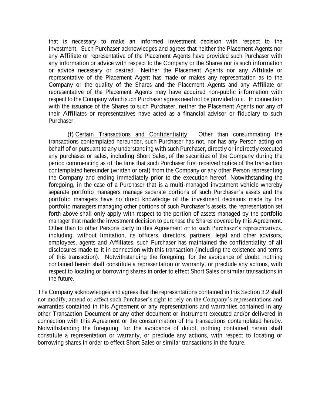 that is necessary to make an informed investment decision with respect to the investment. Such Purchaser acknowledges and agrees that neither the Placement Agents nor any Affiliate or representative of the Placement Agents have provided such Purchaser with any information or advice with respect to the Company or the Shares nor is such information or advice necessary or desired. Neither the Placement Agents nor any Affiliate or representative of the Placement Agent has made or makes any representation as to the Company or the quality of the Shares and the Placement Agents and any Affiliate or representative of the Placement Agents may have acquired non-public information with respect to the Company which such Purchaser agrees need not be provided to it. In connection with the issuance of the Shares to such Purchaser, neither the Placement Agents nor any of their Affiliates or representatives have acted as a financial advisor or fiduciary to such Purchaser. (f) Certain Transactions and Confidentiality. Other than consummating the transactions contemplated hereunder, such Purchaser has not, nor has any Person acting on behalf of or pursuant to any understanding with such Purchaser, directly or indirectly executed any purchases or sales, including Short Sales, of the securities of the Company during the period commencing as of the time that such Purchaser first received notice of the transaction contemplated hereunder (written or oral) from the Company or any other Person representing the Company and ending immediately prior to the execution hereof. Notwithstanding the foregoing, in the case of a Purchaser that is a multi-managed investment vehicle whereby separate portfolio managers manage separate portions of such Purchaser’s assets and the portfolio managers have no direct knowledge of the investment decisions made by the portfolio managers managing other portions of such Purchaser’s assets, the representation set forth above shall only apply with respect to the portion of assets managed by the portfolio manager that made the investment decision to purchase the Shares covered by this Agreement. Other than to other Persons party to this Agreement or to such Purchaser’s representatives, including, without limitation, its officers, directors, partners, legal and other advisors, employees, agents and Affiliates, such Purchaser has maintained the confidentiality of all disclosures made to it in connection with this transaction (including the existence and terms of this transaction). Notwithstanding the foregoing, for the avoidance of doubt, nothing contained herein shall constitute a representation or warranty, or preclude any actions, with respect to locating or borrowing shares in order to effect Short Sales or similar transactions in the future. The Company acknowledges and agrees that the representations contained in this Section 3.2 shall not modify, amend or affect such Purchaser’s right to rely on the Company’s representations and warranties contained in this Agreement or any representations and warranties contained in any other Transaction Document or any other document or instrument executed and/or delivered in connection with this Agreement or the consummation of the transactions contemplated hereby. Notwithstanding the foregoing, for the avoidance of doubt, nothing contained herein shall constitute a representation or warranty, or preclude any actions, with respect to locating or borrowing shares in order to effect Short Sales or similar transactions in the future.