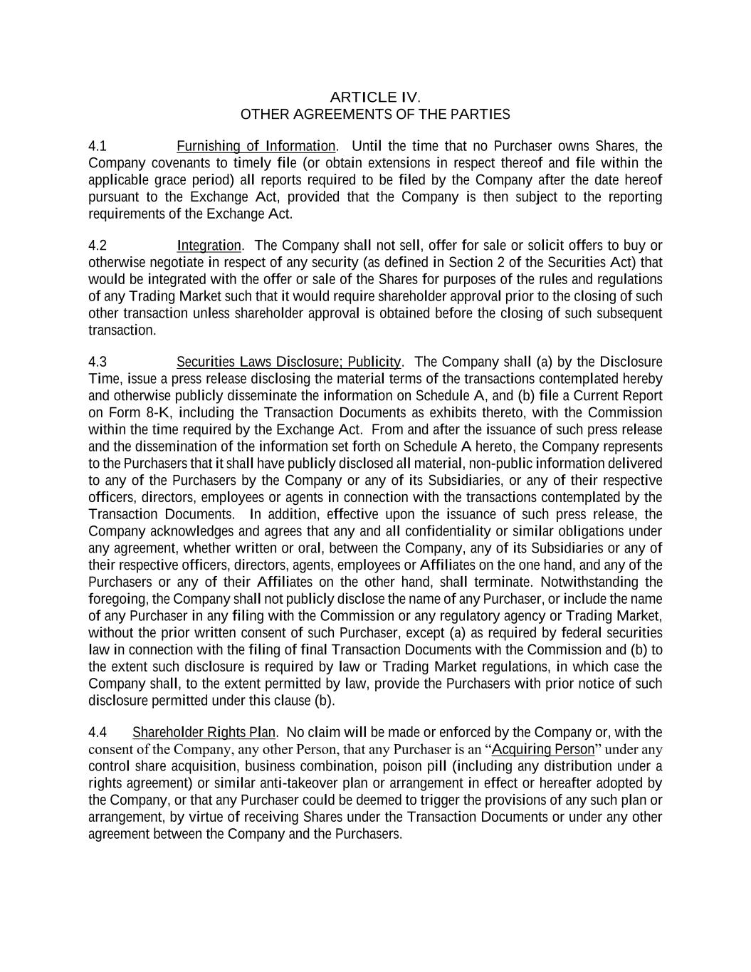 ARTICLE IV. OTHER AGREEMENTS OF THE PARTIES 4.1 Furnishing of Information. Until the time that no Purchaser owns Shares, the Company covenants to timely file (or obtain extensions in respect thereof and file within the applicable grace period) all reports required to be filed by the Company after the date hereof pursuant to the Exchange Act, provided that the Company is then subject to the reporting requirements of the Exchange Act. 4.2 Integration. The Company shall not sell, offer for sale or solicit offers to buy or otherwise negotiate in respect of any security (as defined in Section 2 of the Securities Act) that would be integrated with the offer or sale of the Shares for purposes of the rules and regulations of any Trading Market such that it would require shareholder approval prior to the closing of such other transaction unless shareholder approval is obtained before the closing of such subsequent transaction. 4.3 Securities Laws Disclosure; Publicity. The Company shall (a) by the Disclosure Time, issue a press release disclosing the material terms of the transactions contemplated hereby and otherwise publicly disseminate the information on Schedule A, and (b) file a Current Report on Form 8-K, including the Transaction Documents as exhibits thereto, with the Commission within the time required by the Exchange Act. From and after the issuance of such press release and the dissemination of the information set forth on Schedule A hereto, the Company represents to the Purchasers that it shall have publicly disclosed all material, non-public information delivered to any of the Purchasers by the Company or any of its Subsidiaries, or any of their respective officers, directors, employees or agents in connection with the transactions contemplated by the Transaction Documents. In addition, effective upon the issuance of such press release, the Company acknowledges and agrees that any and all confidentiality or similar obligations under any agreement, whether written or oral, between the Company, any of its Subsidiaries or any of their respective officers, directors, agents, employees or Affiliates on the one hand, and any of the Purchasers or any of their Affiliates on the other hand, shall terminate. Notwithstanding the foregoing, the Company shall not publicly disclose the name of any Purchaser, or include the name of any Purchaser in any filing with the Commission or any regulatory agency or Trading Market, without the prior written consent of such Purchaser, except (a) as required by federal securities law in connection with the filing of final Transaction Documents with the Commission and (b) to the extent such disclosure is required by law or Trading Market regulations, in which case the Company shall, to the extent permitted by law, provide the Purchasers with prior notice of such disclosure permitted under this clause (b). 4.4 Shareholder Rights Plan. No claim will be made or enforced by the Company or, with the consent of the Company, any other Person, that any Purchaser is an “Acquiring Person” under any control share acquisition, business combination, poison pill (including any distribution under a rights agreement) or similar anti-takeover plan or arrangement in effect or hereafter adopted by the Company, or that any Purchaser could be deemed to trigger the provisions of any such plan or arrangement, by virtue of receiving Shares under the Transaction Documents or under any other agreement between the Company and the Purchasers.