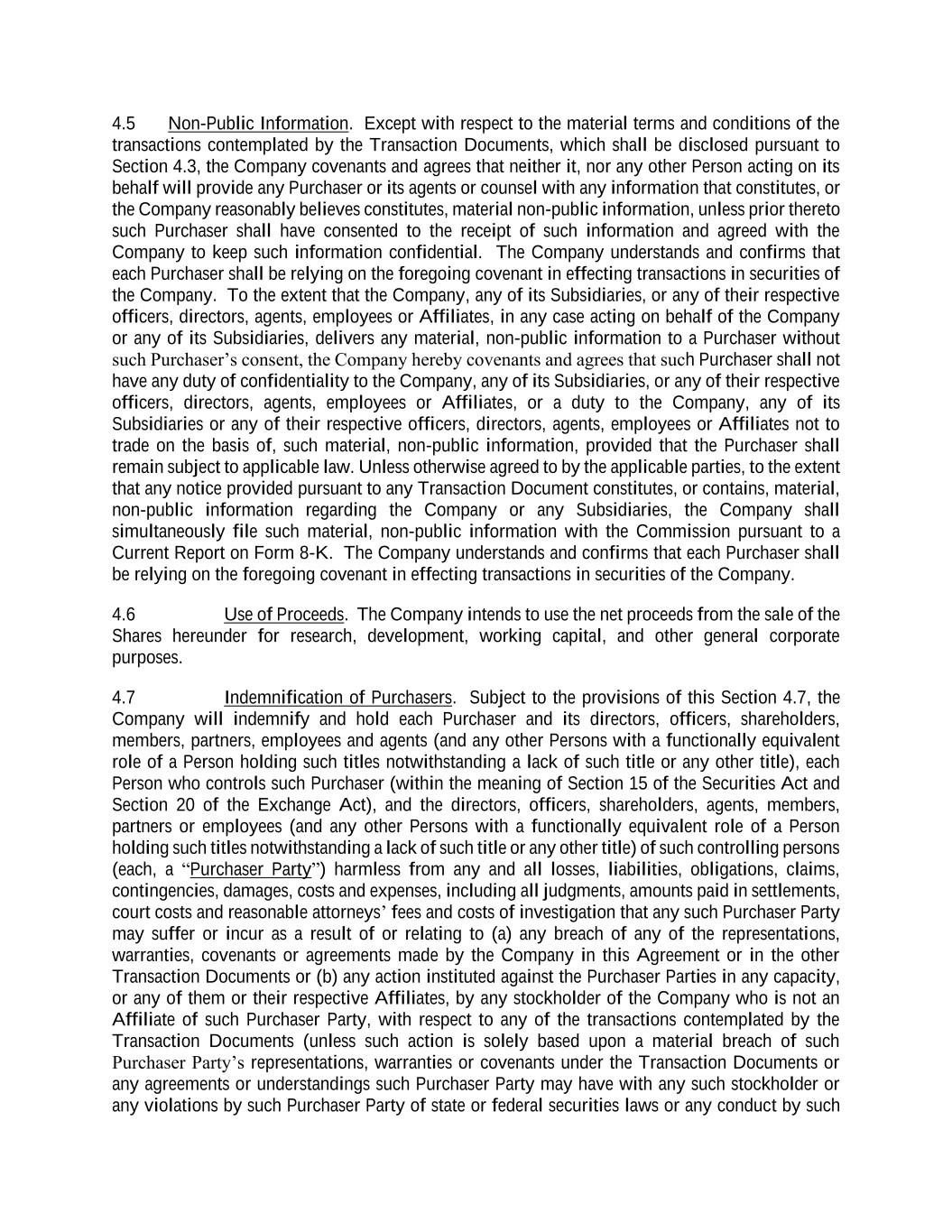 4.5 Non-Public Information. Except with respect to the material terms and conditions of the transactions contemplated by the Transaction Documents, which shall be disclosed pursuant to Section 4.3, the Company covenants and agrees that neither it, nor any other Person acting on its behalf will provide any Purchaser or its agents or counsel with any information that constitutes, or the Company reasonably believes constitutes, material non-public information, unless prior thereto such Purchaser shall have consented to the receipt of such information and agreed with the Company to keep such information confidential. The Company understands and confirms that each Purchaser shall be relying on the foregoing covenant in effecting transactions in securities of the Company. To the extent that the Company, any of its Subsidiaries, or any of their respective officers, directors, agents, employees or Affiliates, in any case acting on behalf of the Company or any of its Subsidiaries, delivers any material, non-public information to a Purchaser without such Purchaser’s consent, the Company hereby covenants and agrees that such Purchaser shall not have any duty of confidentiality to the Company, any of its Subsidiaries, or any of their respective officers, directors, agents, employees or Affiliates, or a duty to the Company, any of its Subsidiaries or any of their respective officers, directors, agents, employees or Affiliates not to trade on the basis of, such material, non-public information, provided that the Purchaser shall remain subject to applicable law. Unless otherwise agreed to by the applicable parties, to the extent that any notice provided pursuant to any Transaction Document constitutes, or contains, material, non-public information regarding the Company or any Subsidiaries, the Company shall simultaneously file such material, non-public information with the Commission pursuant to a Current Report on Form 8-K. The Company understands and confirms that each Purchaser shall be relying on the foregoing covenant in effecting transactions in securities of the Company. 4.6 Use of Proceeds. The Company intends to use the net proceeds from the sale of the Shares hereunder for research, development, working capital, and other general corporate purposes. 4.7 Indemnification of Purchasers. Subject to the provisions of this Section 4.7, the Company will indemnify and hold each Purchaser and its directors, officers, shareholders, members, partners, employees and agents (and any other Persons with a functionally equivalent role of a Person holding such titles notwithstanding a lack of such title or any other title), each Person who controls such Purchaser (within the meaning of Section 15 of the Securities Act and Section 20 of the Exchange Act), and the directors, officers, shareholders, agents, members, partners or employees (and any other Persons with a functionally equivalent role of a Person holding such titles notwithstanding a lack of such title or any other title) of such controlling persons (each, a “Purchaser Party”) harmless from any and all losses, liabilities, obligations, claims, contingencies, damages, costs and expenses, including all judgments, amounts paid in settlements, court costs and reasonable attorneys’ fees and costs of investigation that any such Purchaser Party may suffer or incur as a result of or relating to (a) any breach of any of the representations, warranties, covenants or agreements made by the Company in this Agreement or in the other Transaction Documents or (b) any action instituted against the Purchaser Parties in any capacity, or any of them or their respective Affiliates, by any stockholder of the Company who is not an Affiliate of such Purchaser Party, with respect to any of the transactions contemplated by the Transaction Documents (unless such action is solely based upon a material breach of such Purchaser Party’s representations, warranties or covenants under the Transaction Documents or any agreements or understandings such Purchaser Party may have with any such stockholder or any violations by such Purchaser Party of state or federal securities laws or any conduct by such