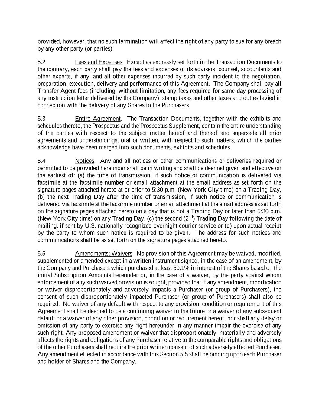 provided, however, that no such termination will affect the right of any party to sue for any breach by any other party (or parties). 5.2 Fees and Expenses. Except as expressly set forth in the Transaction Documents to the contrary, each party shall pay the fees and expenses of its advisers, counsel, accountants and other experts, if any, and all other expenses incurred by such party incident to the negotiation, preparation, execution, delivery and performance of this Agreement. The Company shall pay all Transfer Agent fees (including, without limitation, any fees required for same-day processing of any instruction letter delivered by the Company), stamp taxes and other taxes and duties levied in connection with the delivery of any Shares to the Purchasers. 5.3 Entire Agreement. The Transaction Documents, together with the exhibits and schedules thereto, the Prospectus and the Prospectus Supplement, contain the entire understanding of the parties with respect to the subject matter hereof and thereof and supersede all prior agreements and understandings, oral or written, with respect to such matters, which the parties acknowledge have been merged into such documents, exhibits and schedules. 5.4 Notices. Any and all notices or other communications or deliveries required or permitted to be provided hereunder shall be in writing and shall be deemed given and effective on the earliest of: (a) the time of transmission, if such notice or communication is delivered via facsimile at the facsimile number or email attachment at the email address as set forth on the signature pages attached hereto at or prior to 5:30 p.m. (New York City time) on a Trading Day, (b) the next Trading Day after the time of transmission, if such notice or communication is delivered via facsimile at the facsimile number or email attachment at the email address as set forth on the signature pages attached hereto on a day that is not a Trading Day or later than 5:30 p.m. (New York City time) on any Trading Day, (c) the second (2nd) Trading Day following the date of mailing, if sent by U.S. nationally recognized overnight courier service or (d) upon actual receipt by the party to whom such notice is required to be given. The address for such notices and communications shall be as set forth on the signature pages attached hereto. 5.5 Amendments; Waivers. No provision of this Agreement may be waived, modified, supplemented or amended except in a written instrument signed, in the case of an amendment, by the Company and Purchasers which purchased at least 50.1% in interest of the Shares based on the initial Subscription Amounts hereunder or, in the case of a waiver, by the party against whom enforcement of any such waived provision is sought, provided that if any amendment, modification or waiver disproportionately and adversely impacts a Purchaser (or group of Purchasers), the consent of such disproportionately impacted Purchaser (or group of Purchasers) shall also be required. No waiver of any default with respect to any provision, condition or requirement of this Agreement shall be deemed to be a continuing waiver in the future or a waiver of any subsequent default or a waiver of any other provision, condition or requirement hereof, nor shall any delay or omission of any party to exercise any right hereunder in any manner impair the exercise of any such right. Any proposed amendment or waiver that disproportionately, materially and adversely affects the rights and obligations of any Purchaser relative to the comparable rights and obligations of the other Purchasers shall require the prior written consent of such adversely affected Purchaser. Any amendment effected in accordance with this Section 5.5 shall be binding upon each Purchaser and holder of Shares and the Company.