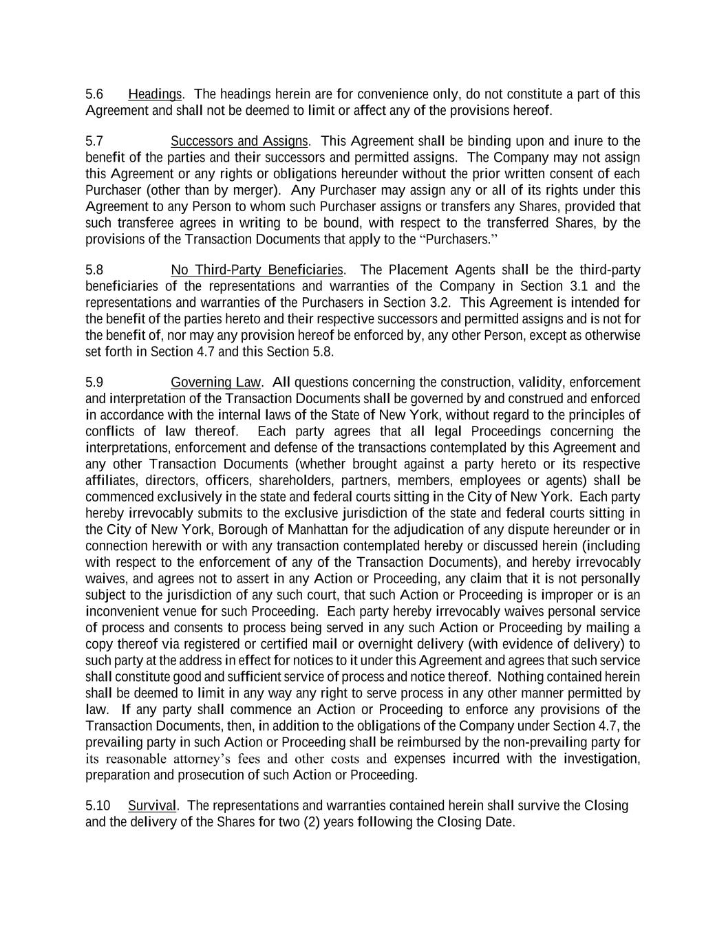 5.6 Headings. The headings herein are for convenience only, do not constitute a part of this Agreement and shall not be deemed to limit or affect any of the provisions hereof. 5.7 Successors and Assigns. This Agreement shall be binding upon and inure to the benefit of the parties and their successors and permitted assigns. The Company may not assign this Agreement or any rights or obligations hereunder without the prior written consent of each Purchaser (other than by merger). Any Purchaser may assign any or all of its rights under this Agreement to any Person to whom such Purchaser assigns or transfers any Shares, provided that such transferee agrees in writing to be bound, with respect to the transferred Shares, by the provisions of the Transaction Documents that apply to the “Purchasers.” 5.8 No Third-Party Beneficiaries. The Placement Agents shall be the third-party beneficiaries of the representations and warranties of the Company in Section 3.1 and the representations and warranties of the Purchasers in Section 3.2. This Agreement is intended for the benefit of the parties hereto and their respective successors and permitted assigns and is not for the benefit of, nor may any provision hereof be enforced by, any other Person, except as otherwise set forth in Section 4.7 and this Section 5.8. 5.9 Governing Law. All questions concerning the construction, validity, enforcement and interpretation of the Transaction Documents shall be governed by and construed and enforced in accordance with the internal laws of the State of New York, without regard to the principles of conflicts of law thereof. Each party agrees that all legal Proceedings concerning the interpretations, enforcement and defense of the transactions contemplated by this Agreement and any other Transaction Documents (whether brought against a party hereto or its respective affiliates, directors, officers, shareholders, partners, members, employees or agents) shall be commenced exclusively in the state and federal courts sitting in the City of New York. Each party hereby irrevocably submits to the exclusive jurisdiction of the state and federal courts sitting in the City of New York, Borough of Manhattan for the adjudication of any dispute hereunder or in connection herewith or with any transaction contemplated hereby or discussed herein (including with respect to the enforcement of any of the Transaction Documents), and hereby irrevocably waives, and agrees not to assert in any Action or Proceeding, any claim that it is not personally subject to the jurisdiction of any such court, that such Action or Proceeding is improper or is an inconvenient venue for such Proceeding. Each party hereby irrevocably waives personal service of process and consents to process being served in any such Action or Proceeding by mailing a copy thereof via registered or certified mail or overnight delivery (with evidence of delivery) to such party at the address in effect for notices to it under this Agreement and agrees that such service shall constitute good and sufficient service of process and notice thereof. Nothing contained herein shall be deemed to limit in any way any right to serve process in any other manner permitted by law. If any party shall commence an Action or Proceeding to enforce any provisions of the Transaction Documents, then, in addition to the obligations of the Company under Section 4.7, the prevailing party in such Action or Proceeding shall be reimbursed by the non-prevailing party for its reasonable attorney’s fees and other costs and expenses incurred with the investigation, preparation and prosecution of such Action or Proceeding. 5.10 Survival. The representations and warranties contained herein shall survive the Closing and the delivery of the Shares for two (2) years following the Closing Date.