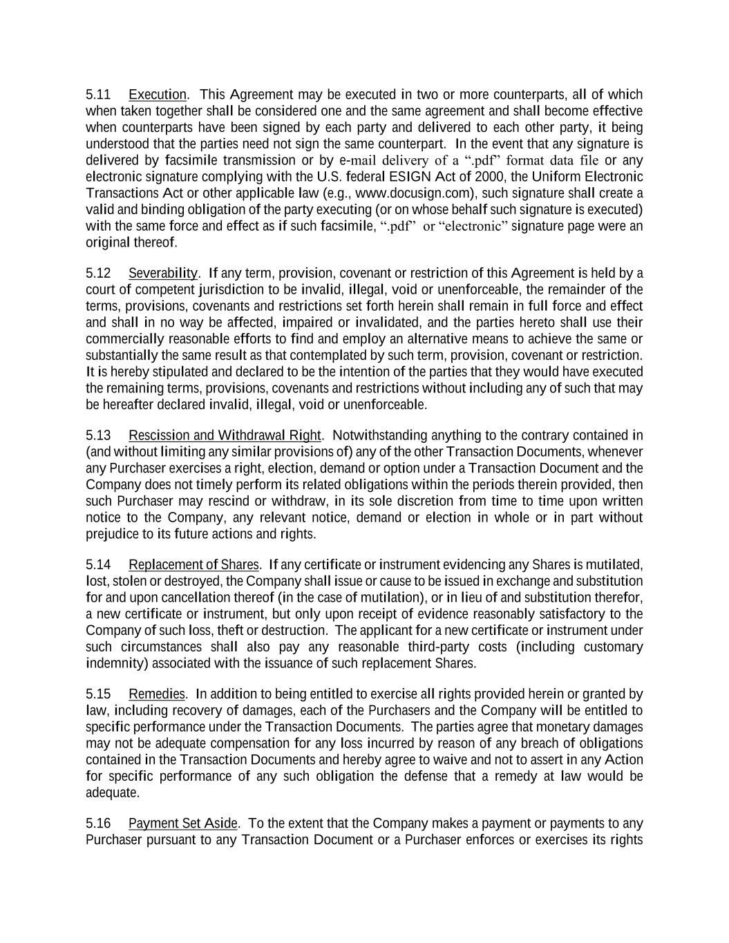 5.11 Execution. This Agreement may be executed in two or more counterparts, all of which when taken together shall be considered one and the same agreement and shall become effective when counterparts have been signed by each party and delivered to each other party, it being understood that the parties need not sign the same counterpart. In the event that any signature is delivered by facsimile transmission or by e-mail delivery of a “.pdf” format data file or any electronic signature complying with the U.S. federal ESIGN Act of 2000, the Uniform Electronic Transactions Act or other applicable law (e.g., www.docusign.com), such signature shall create a valid and binding obligation of the party executing (or on whose behalf such signature is executed) with the same force and effect as if such facsimile, “.pdf” or “electronic” signature page were an original thereof. 5.12 Severability. If any term, provision, covenant or restriction of this Agreement is held by a court of competent jurisdiction to be invalid, illegal, void or unenforceable, the remainder of the terms, provisions, covenants and restrictions set forth herein shall remain in full force and effect and shall in no way be affected, impaired or invalidated, and the parties hereto shall use their commercially reasonable efforts to find and employ an alternative means to achieve the same or substantially the same result as that contemplated by such term, provision, covenant or restriction. It is hereby stipulated and declared to be the intention of the parties that they would have executed the remaining terms, provisions, covenants and restrictions without including any of such that may be hereafter declared invalid, illegal, void or unenforceable. 5.13 Rescission and Withdrawal Right. Notwithstanding anything to the contrary contained in (and without limiting any similar provisions of) any of the other Transaction Documents, whenever any Purchaser exercises a right, election, demand or option under a Transaction Document and the Company does not timely perform its related obligations within the periods therein provided, then such Purchaser may rescind or withdraw, in its sole discretion from time to time upon written notice to the Company, any relevant notice, demand or election in whole or in part without prejudice to its future actions and rights. 5.14 Replacement of Shares. If any certificate or instrument evidencing any Shares is mutilated, lost, stolen or destroyed, the Company shall issue or cause to be issued in exchange and substitution for and upon cancellation thereof (in the case of mutilation), or in lieu of and substitution therefor, a new certificate or instrument, but only upon receipt of evidence reasonably satisfactory to the Company of such loss, theft or destruction. The applicant for a new certificate or instrument under such circumstances shall also pay any reasonable third-party costs (including customary indemnity) associated with the issuance of such replacement Shares. 5.15 Remedies. In addition to being entitled to exercise all rights provided herein or granted by law, including recovery of damages, each of the Purchasers and the Company will be entitled to specific performance under the Transaction Documents. The parties agree that monetary damages may not be adequate compensation for any loss incurred by reason of any breach of obligations contained in the Transaction Documents and hereby agree to waive and not to assert in any Action for specific performance of any such obligation the defense that a remedy at law would be adequate. 5.16 Payment Set Aside. To the extent that the Company makes a payment or payments to any Purchaser pursuant to any Transaction Document or a Purchaser enforces or exercises its rights