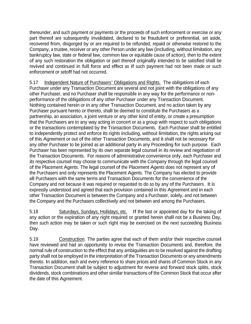 thereunder, and such payment or payments or the proceeds of such enforcement or exercise or any part thereof are subsequently invalidated, declared to be fraudulent or preferential, set aside, recovered from, disgorged by or are required to be refunded, repaid or otherwise restored to the Company, a trustee, receiver or any other Person under any law (including, without limitation, any bankruptcy law, state or federal law, common law or equitable cause of action), then to the extent of any such restoration the obligation or part thereof originally intended to be satisfied shall be revived and continued in full force and effect as if such payment had not been made or such enforcement or setoff had not occurred. 5.17 Independent Nature of Purchasers’ Obligations and Rights. The obligations of each Purchaser under any Transaction Document are several and not joint with the obligations of any other Purchaser, and no Purchaser shall be responsible in any way for the performance or non- performance of the obligations of any other Purchaser under any Transaction Document. Nothing contained herein or in any other Transaction Document, and no action taken by any Purchaser pursuant hereto or thereto, shall be deemed to constitute the Purchasers as a partnership, an association, a joint venture or any other kind of entity, or create a presumption that the Purchasers are in any way acting in concert or as a group with respect to such obligations or the transactions contemplated by the Transaction Documents. Each Purchaser shall be entitled to independently protect and enforce its rights including, without limitation, the rights arising out of this Agreement or out of the other Transaction Documents, and it shall not be necessary for any other Purchaser to be joined as an additional party in any Proceeding for such purpose. Each Purchaser has been represented by its own separate legal counsel in its review and negotiation of the Transaction Documents. For reasons of administrative convenience only, each Purchaser and its respective counsel may choose to communicate with the Company through the legal counsel of the Placement Agents. The legal counsel of the Placement Agents does not represent any of the Purchasers and only represents the Placement Agents. The Company has elected to provide all Purchasers with the same terms and Transaction Documents for the convenience of the Company and not because it was required or requested to do so by any of the Purchasers. It is expressly understood and agreed that each provision contained in this Agreement and in each other Transaction Document is between the Company and a Purchaser, solely, and not between the Company and the Purchasers collectively and not between and among the Purchasers. 5.18 Saturdays, Sundays, Holidays, etc. If the last or appointed day for the taking of any action or the expiration of any right required or granted herein shall not be a Business Day, then such action may be taken or such right may be exercised on the next succeeding Business Day. 5.19 Construction. The parties agree that each of them and/or their respective counsel have reviewed and had an opportunity to revise the Transaction Documents and, therefore, the normal rule of construction to the effect that any ambiguities are to be resolved against the drafting party shall not be employed in the interpretation of the Transaction Documents or any amendments thereto. In addition, each and every reference to share prices and shares of Common Stock in any Transaction Document shall be subject to adjustment for reverse and forward stock splits, stock dividends, stock combinations and other similar transactions of the Common Stock that occur after the date of this Agreement.