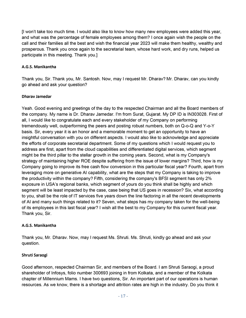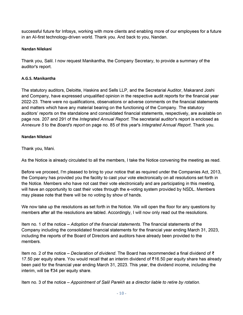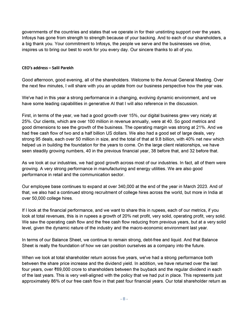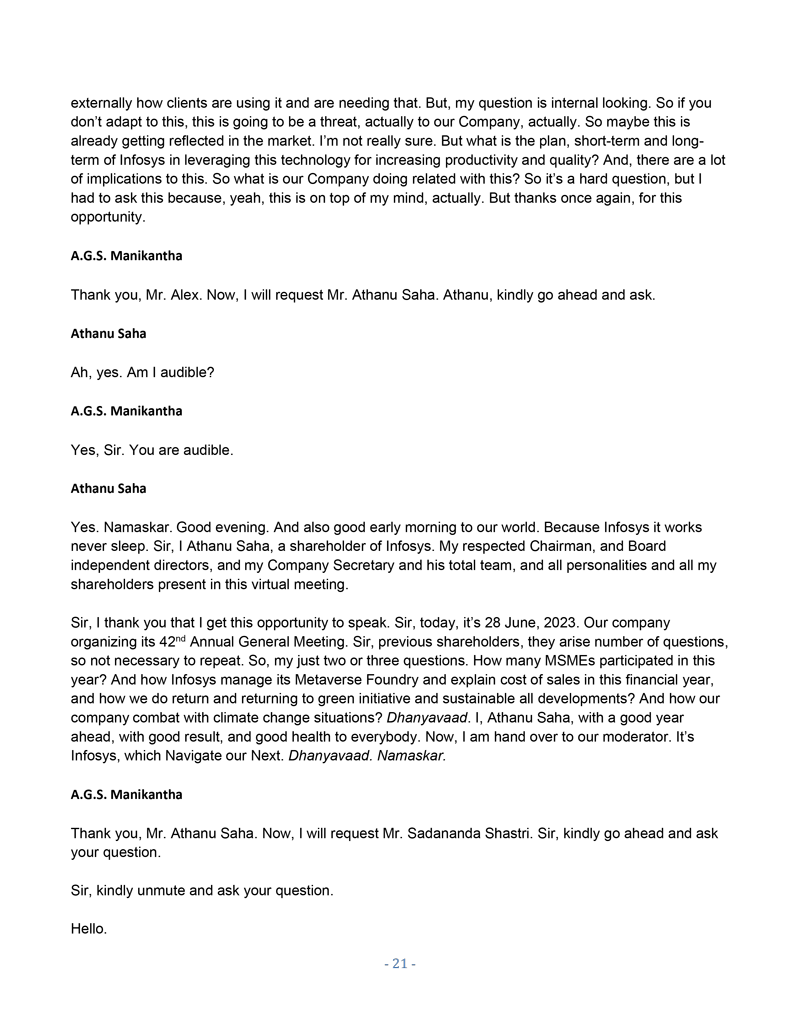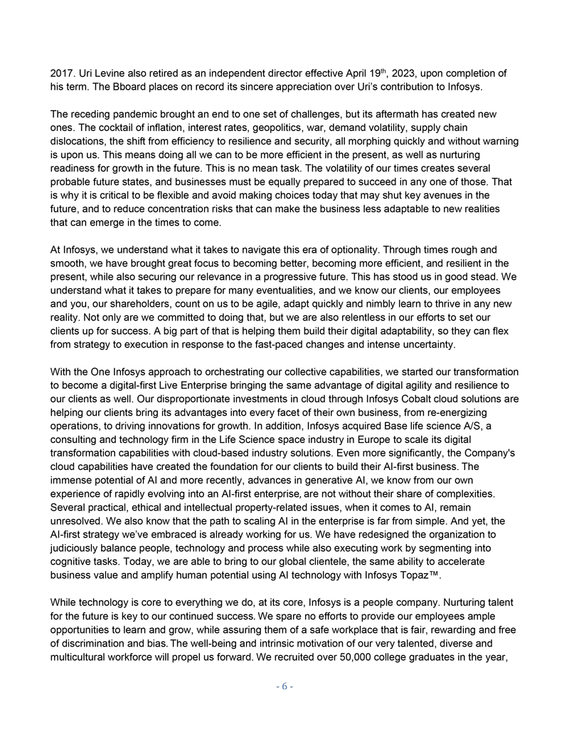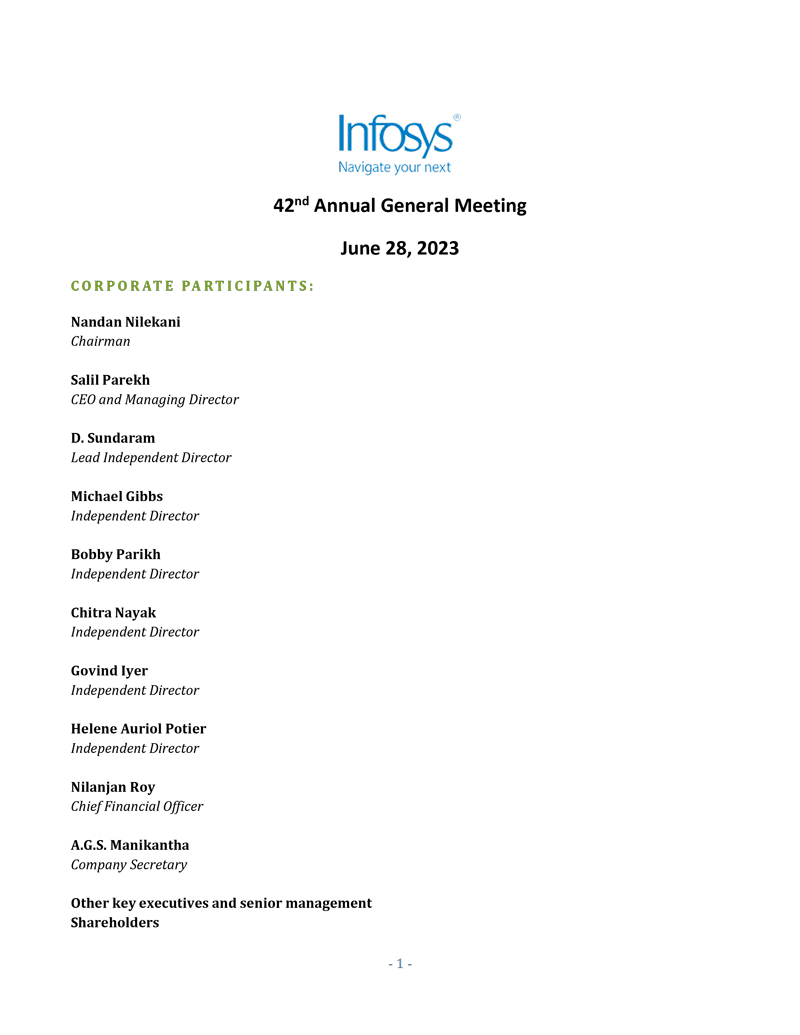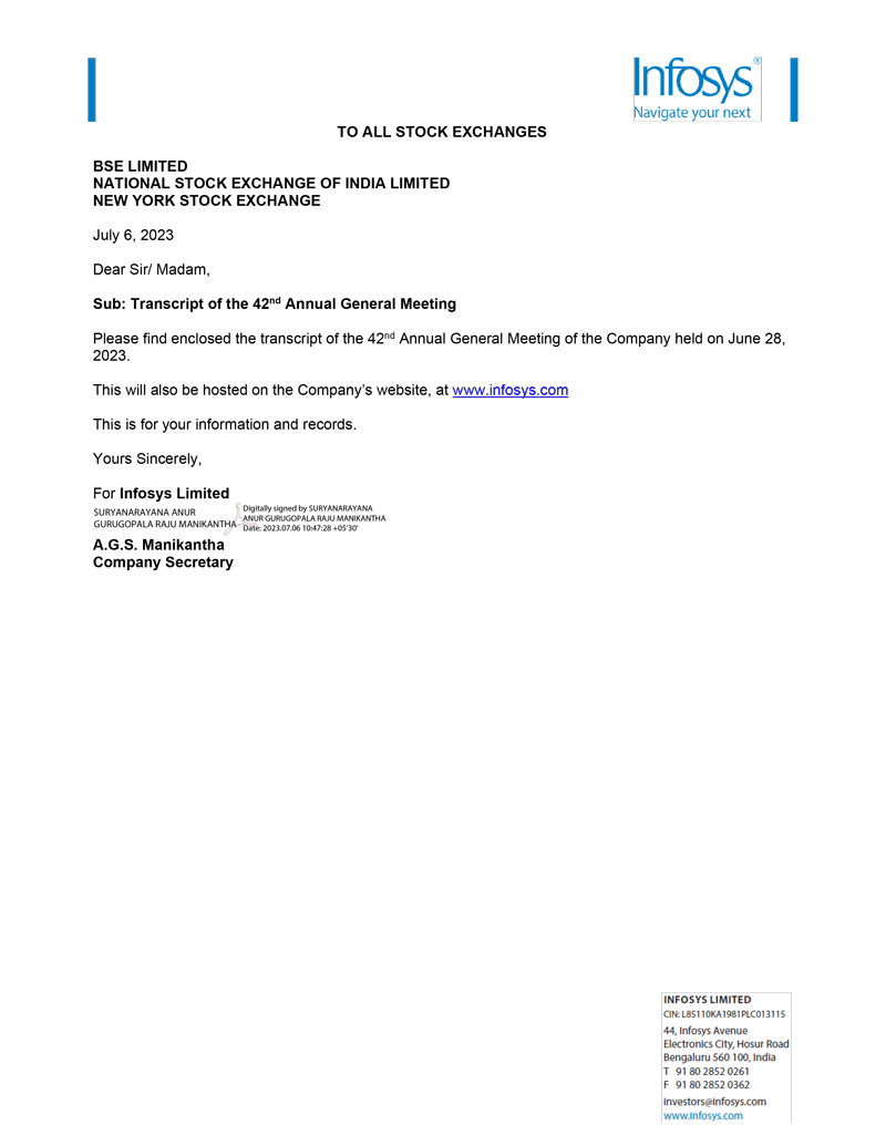 Infosys Limited, a company organized under the laws of the Republic of India ("Infosys", or the "Company"), hereby furnishes with the United States Securities and Exchange Commission this Report on Form 6-K regarding the Intimation dated July 6, 2023 regarding Transcript of 42nd Annual General Meeting held on June 28, 2023.