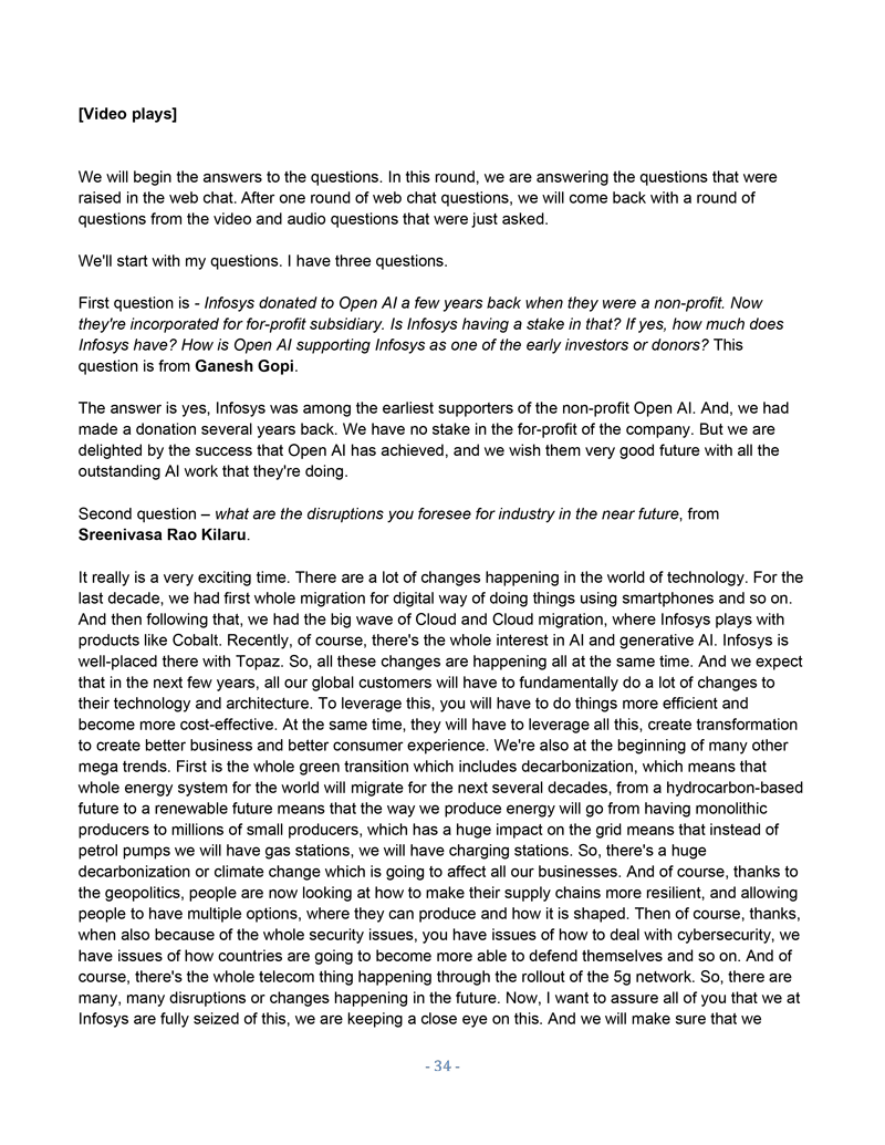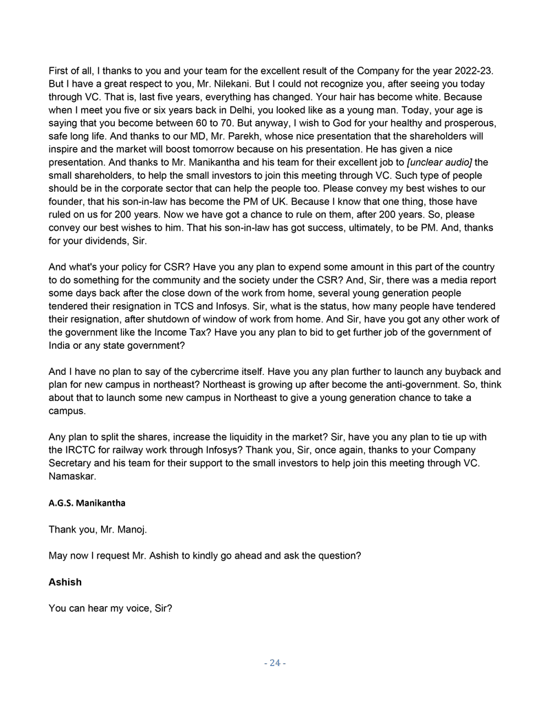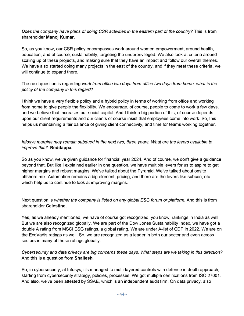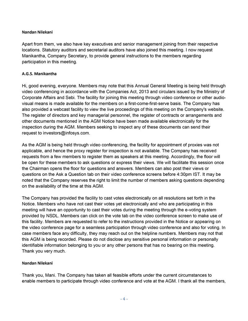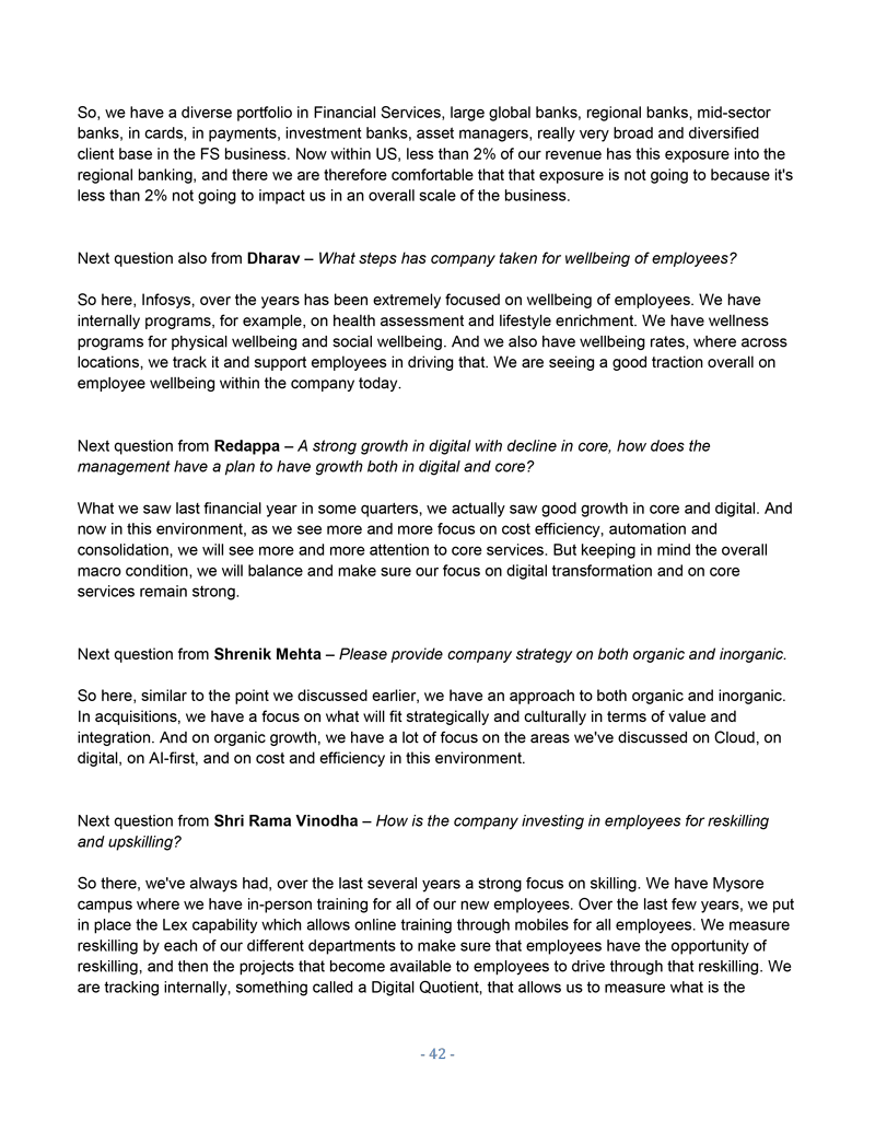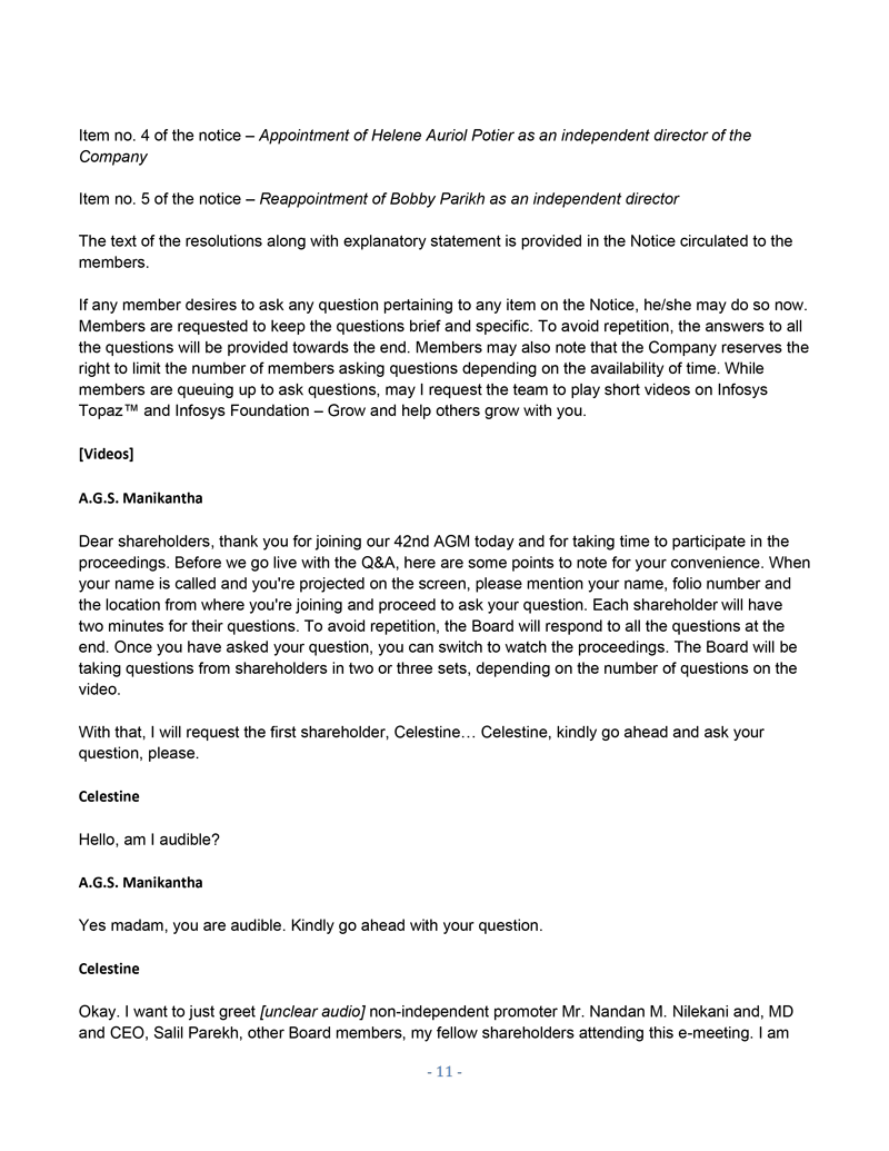 Infosys Limited, a company organized under the laws of the Republic of India ("Infosys", or the "Company"), hereby furnishes with the United States Securities and Exchange Commission this Report on Form 6-K regarding the Intimation dated July 6, 2023 regarding Transcript of 42nd Annual General Meeting held on June 28, 2023.