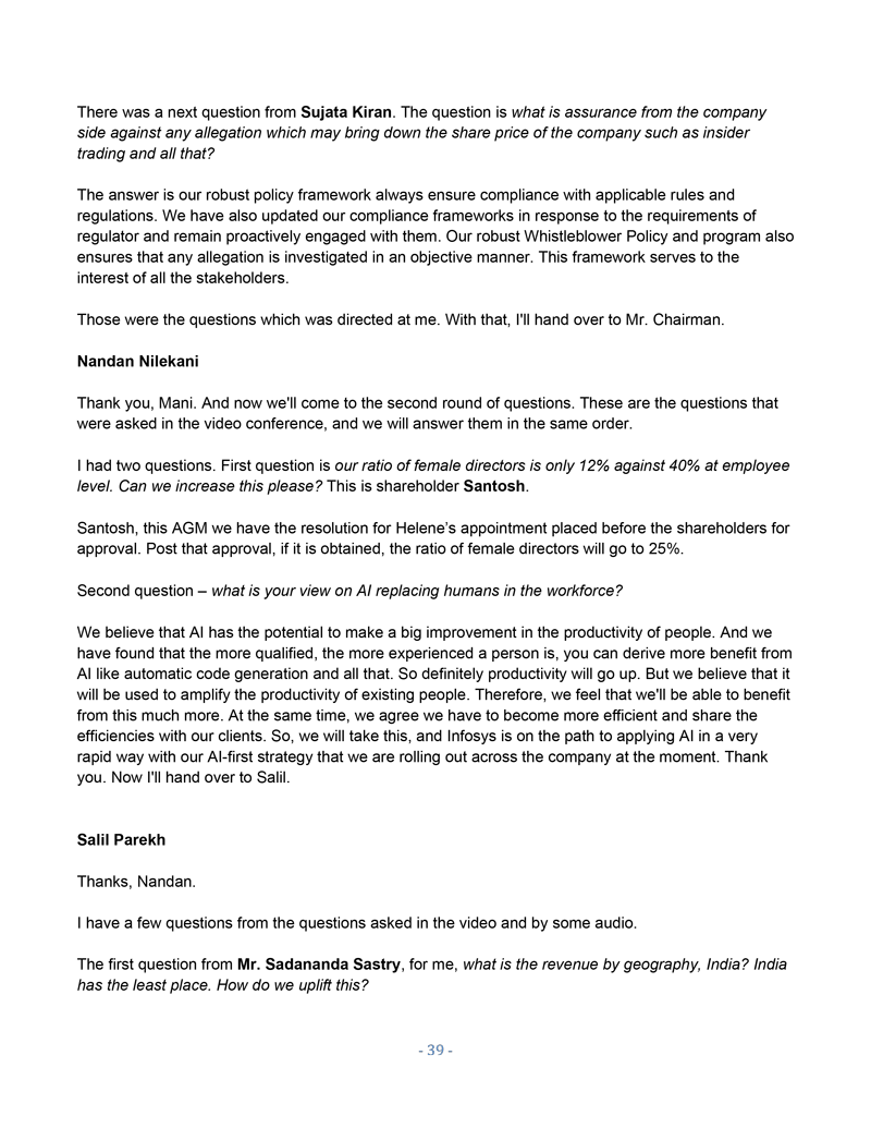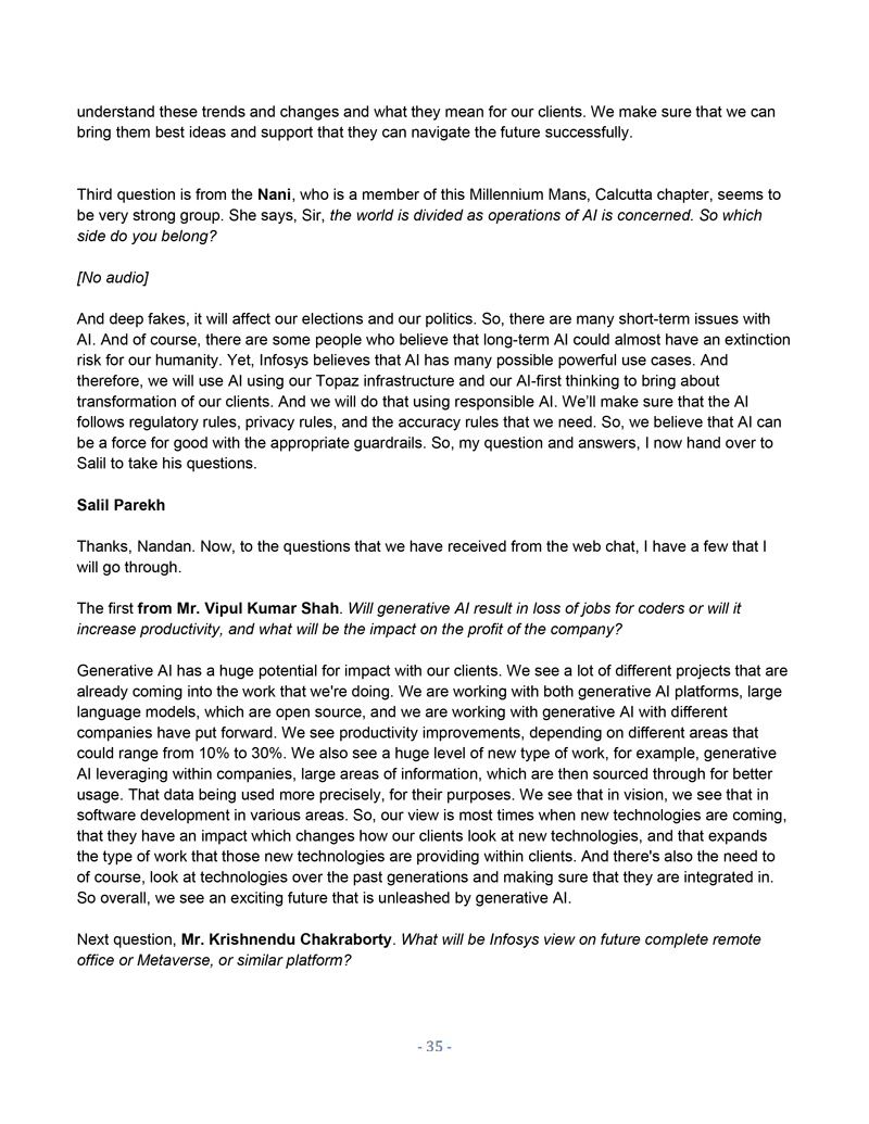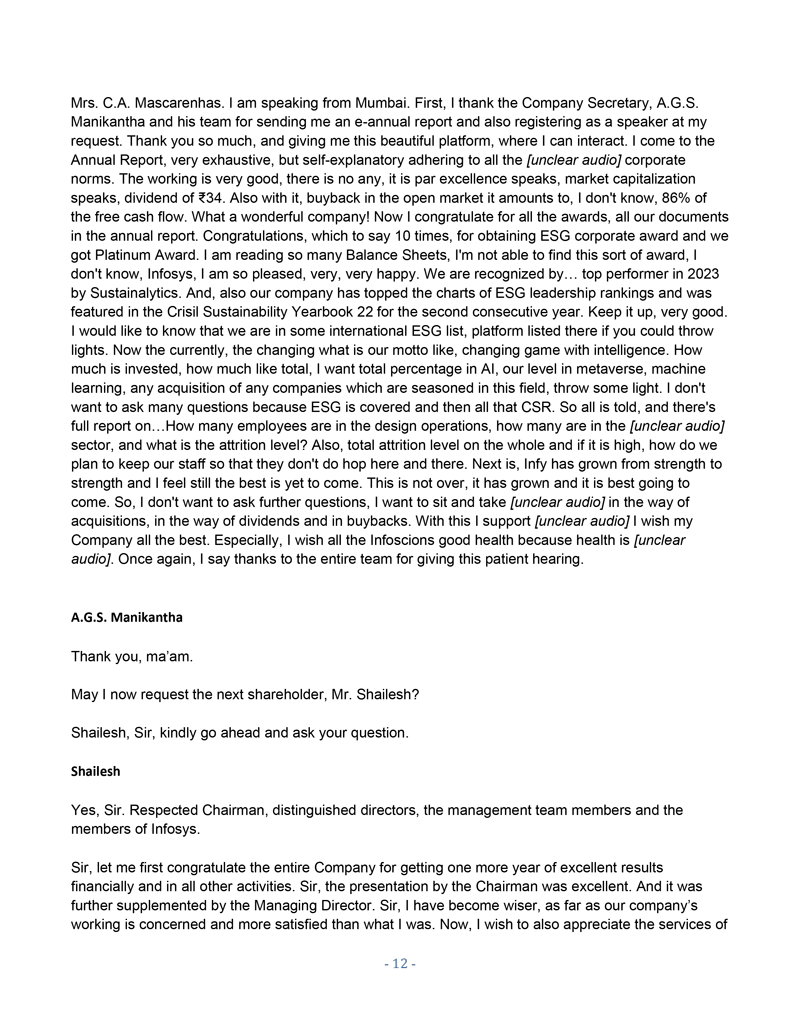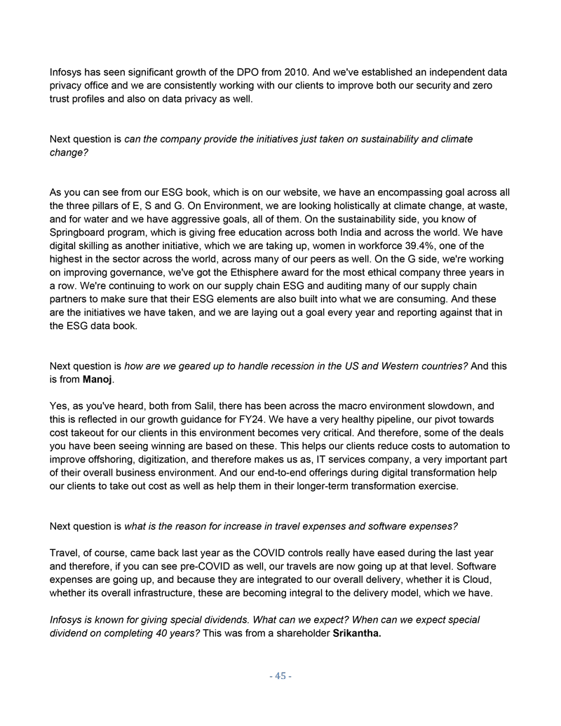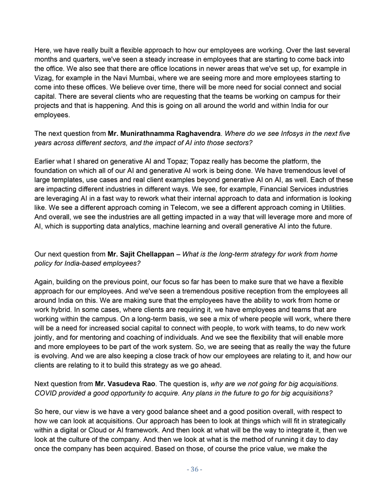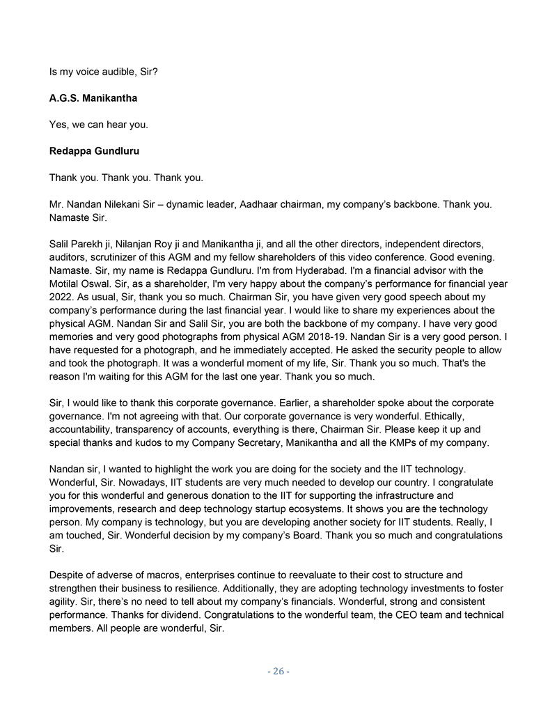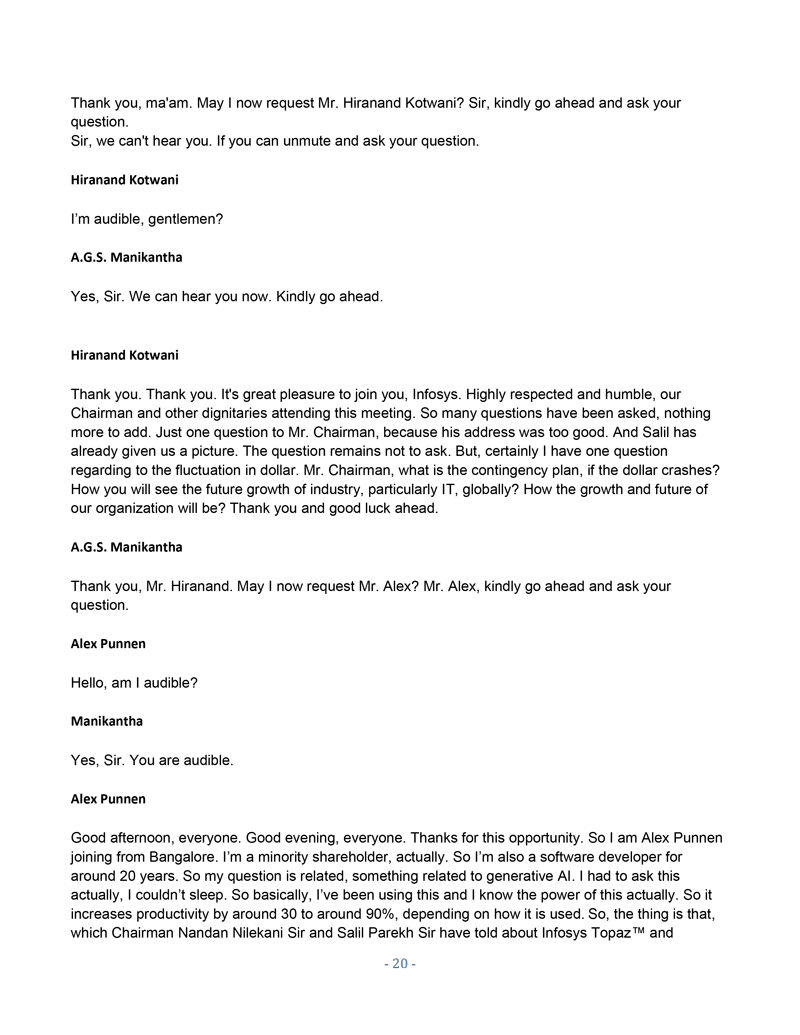 Infosys Limited, a company organized under the laws of the Republic of India ("Infosys", or the "Company"), hereby furnishes with the United States Securities and Exchange Commission this Report on Form 6-K regarding the Intimation dated July 6, 2023 regarding Transcript of 42nd Annual General Meeting held on June 28, 2023.