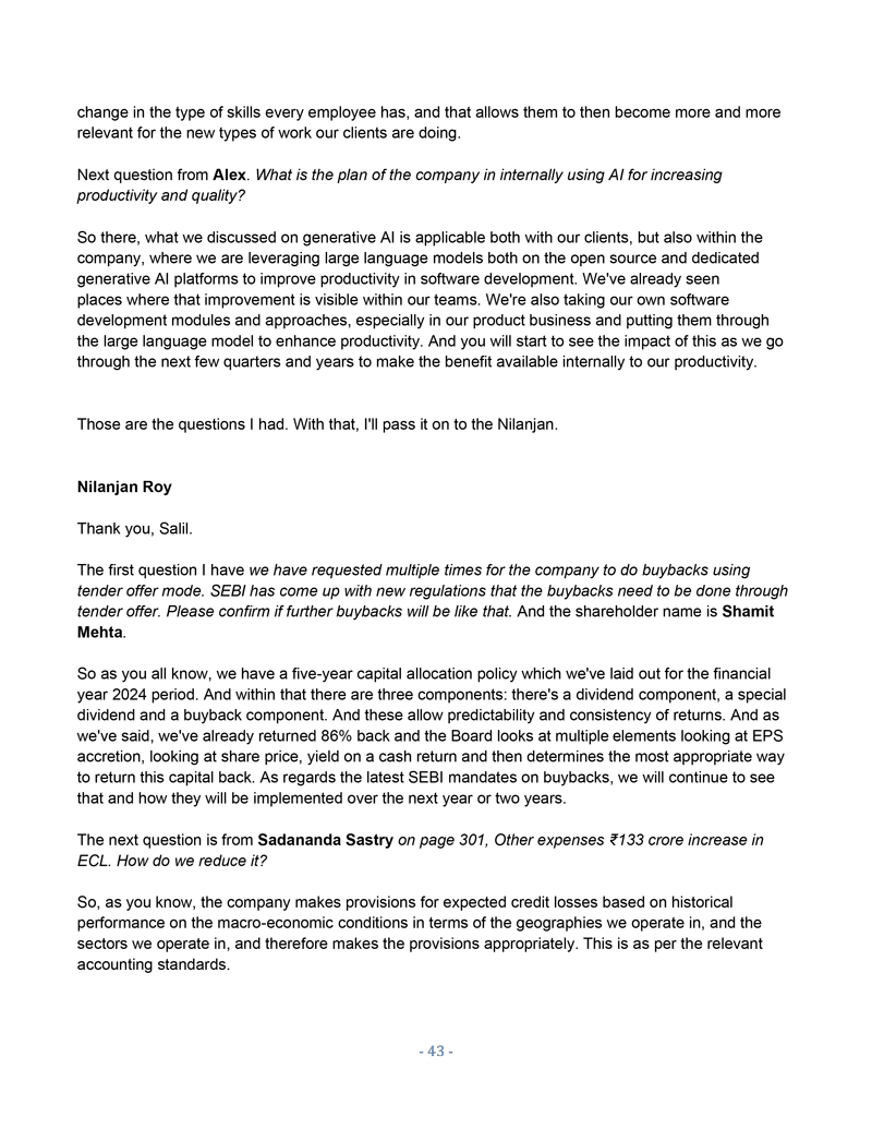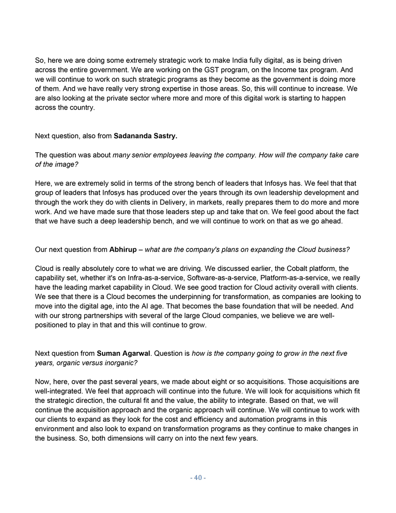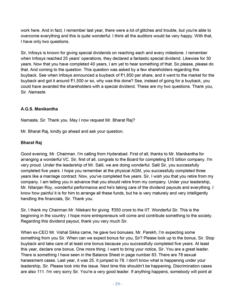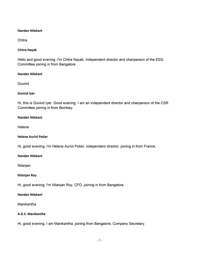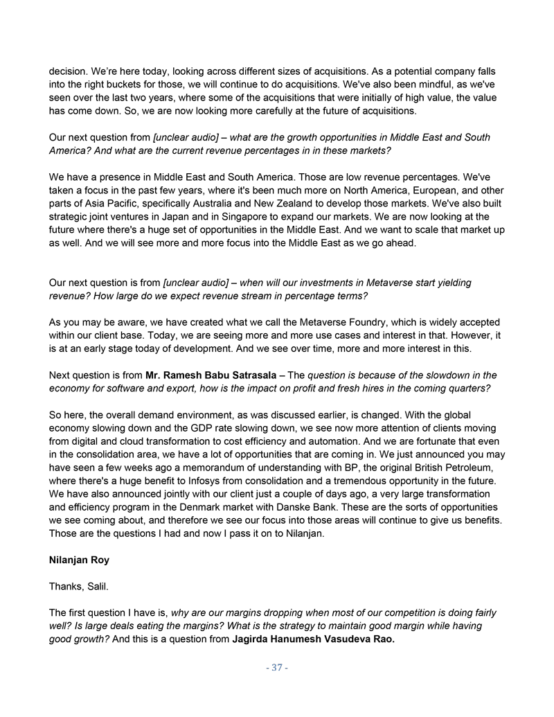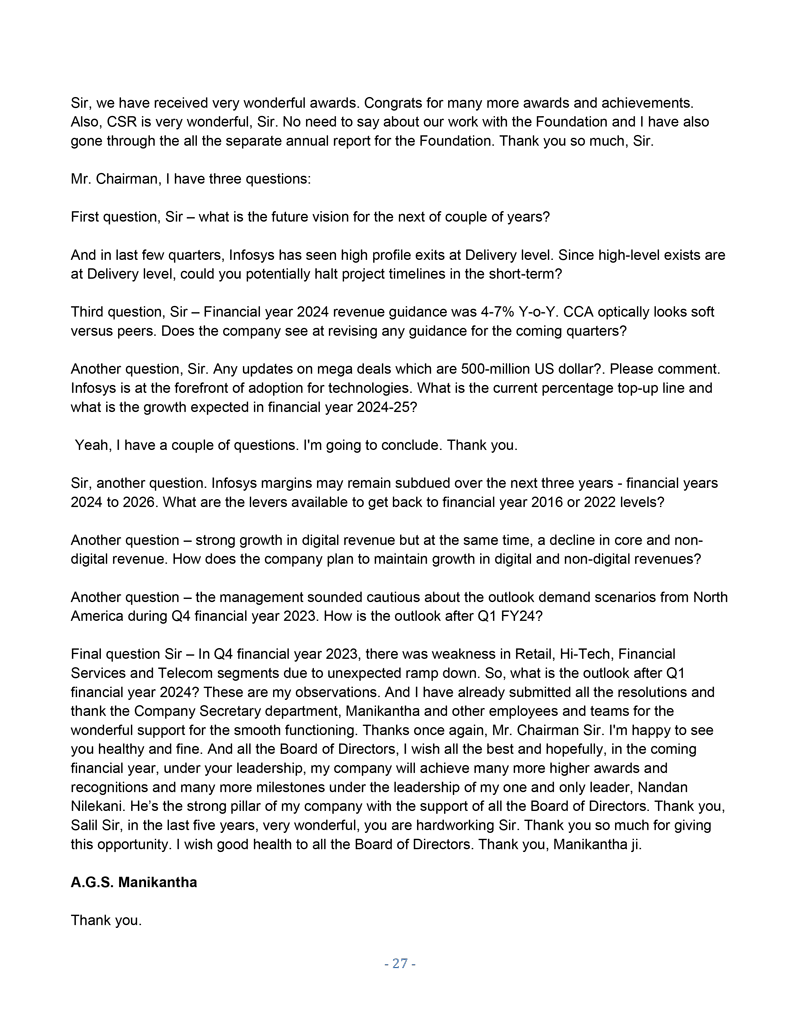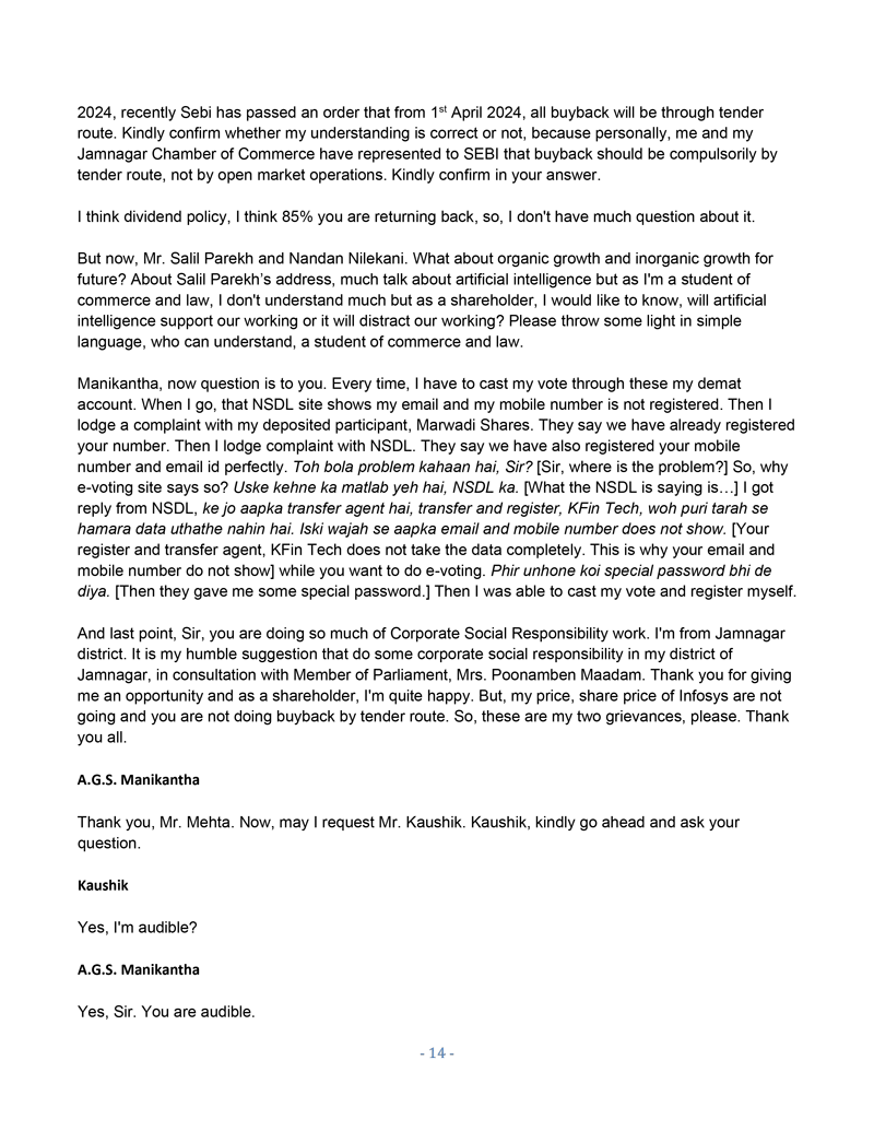 Infosys Limited, a company organized under the laws of the Republic of India ("Infosys", or the "Company"), hereby furnishes with the United States Securities and Exchange Commission this Report on Form 6-K regarding the Intimation dated July 6, 2023 regarding Transcript of 42nd Annual General Meeting held on June 28, 2023.