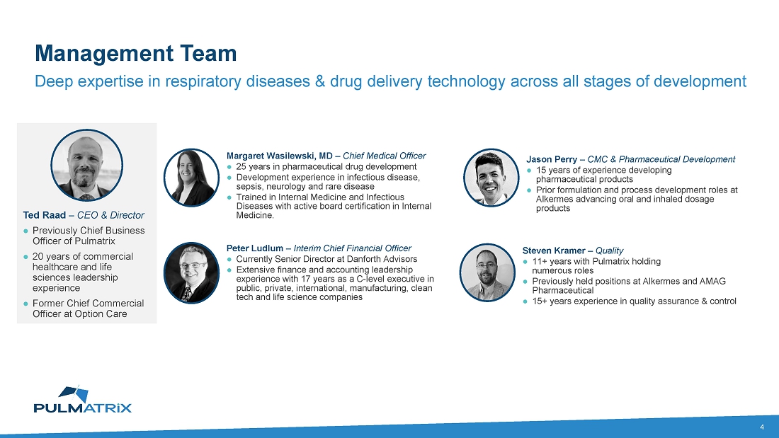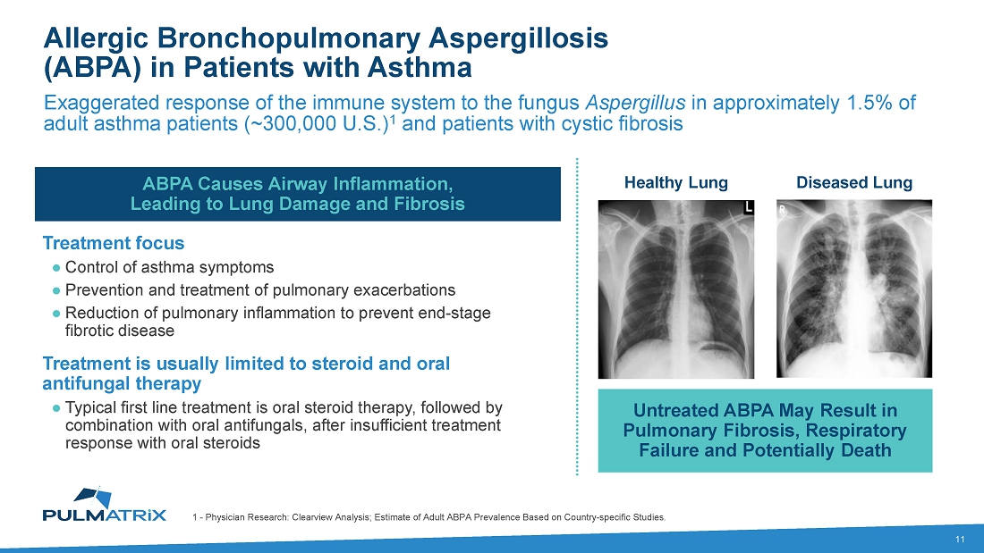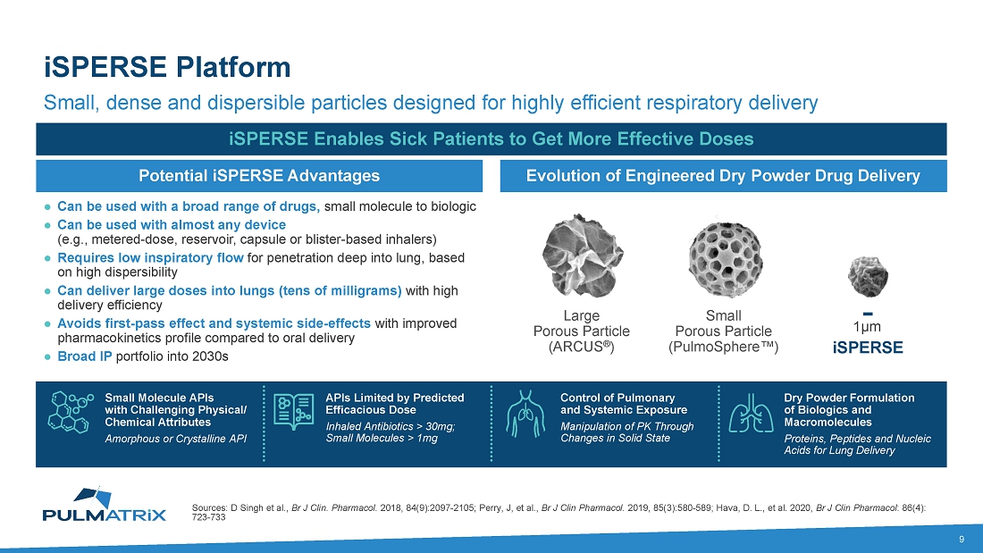 Pulmatrix is a clinical-stage biopharmaceutical company developing innovative inhaled therapies to address serious pulmonary diseases and central nervous system (“CNS”) disorders using its patented iSPERSE™ technology. The Company’s proprietary product pipeline includes treatments for lung diseases, such as allergic bronchopulmonary aspergillosis (“ABPA”), Chronic Obstructive Pulmonary Disease (“COPD”) and CNS disorders such as acute migraine. Pulmatrix’s product candidates are based on its proprietary engineered dry powder delivery platform, iSPERSE™, which seeks to improve therapeutic delivery to the lungs by maximizing local concentrations and reducing systemic side effects to improve patient outcomes.