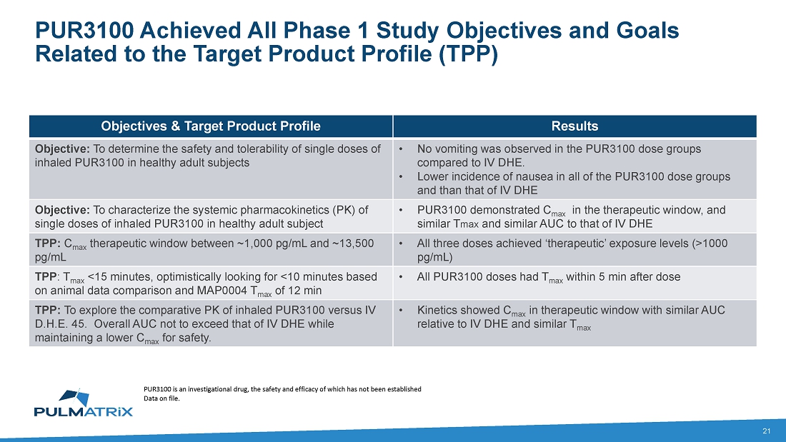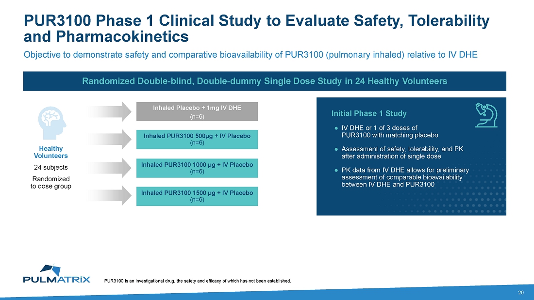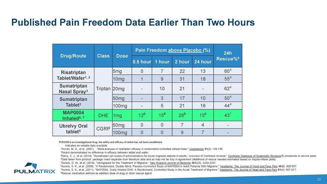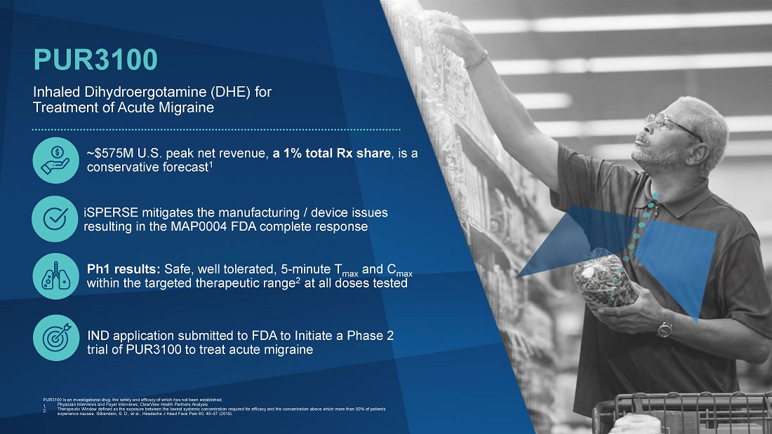 Pulmatrix’s IND includes a Phase 2 clinical protocol where safety and preliminary efficacy of PUR3100 will be investigated in patients with acute migraine. The Phase 1 study data were presented at the American Headache Society 65th Annual Meeting in June 2023. Results showed that the pharmacokinetics (“PK”) of PUR3100 were similar to the PK of intravenous (“IV”) DHE with fewer side effects.