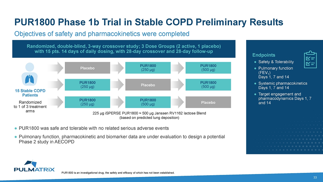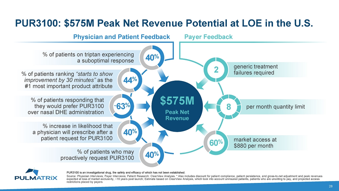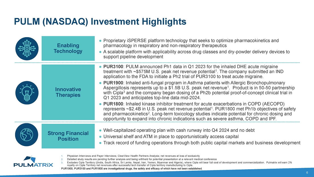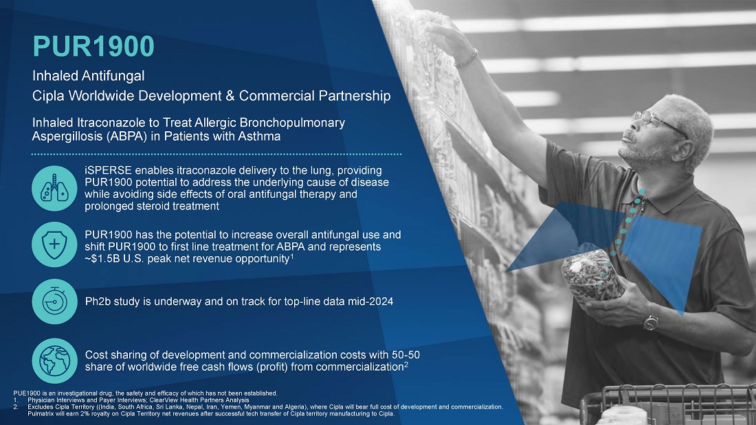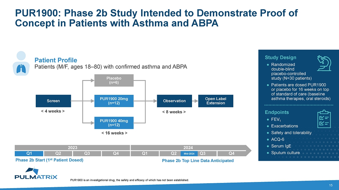 Pulmatrix’s IND includes a Phase 2 clinical protocol where safety and preliminary efficacy of PUR3100 will be investigated in patients with acute migraine. The Phase 1 study data were presented at the American Headache Society 65th Annual Meeting in June 2023. Results showed that the pharmacokinetics (“PK”) of PUR3100 were similar to the PK of intravenous (“IV”) DHE with fewer side effects.