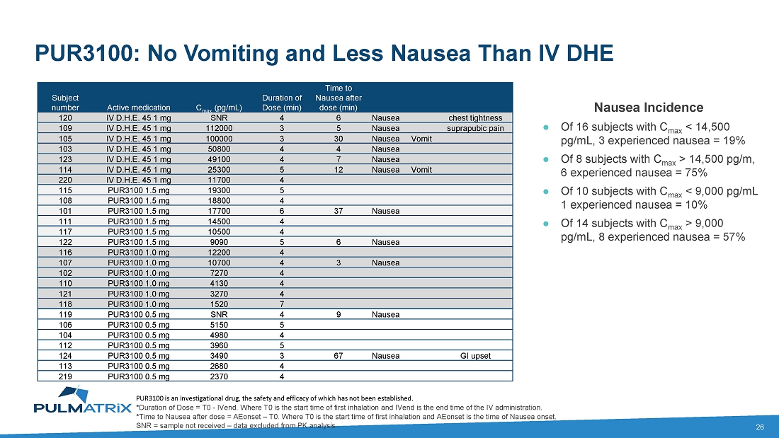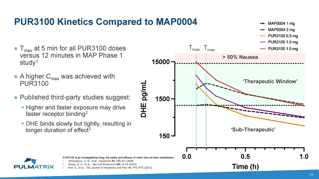 The PK for PUR3100 showed a Tmax was at the first time point (5 min) for all PUR3100 doses. All three doses achieved ‘therapeutic’ exposure levels (>1000 pg/mL). Cmax was within the desired exposure window, with similar Tmax and dose normalized AUC relative to IV DHE.