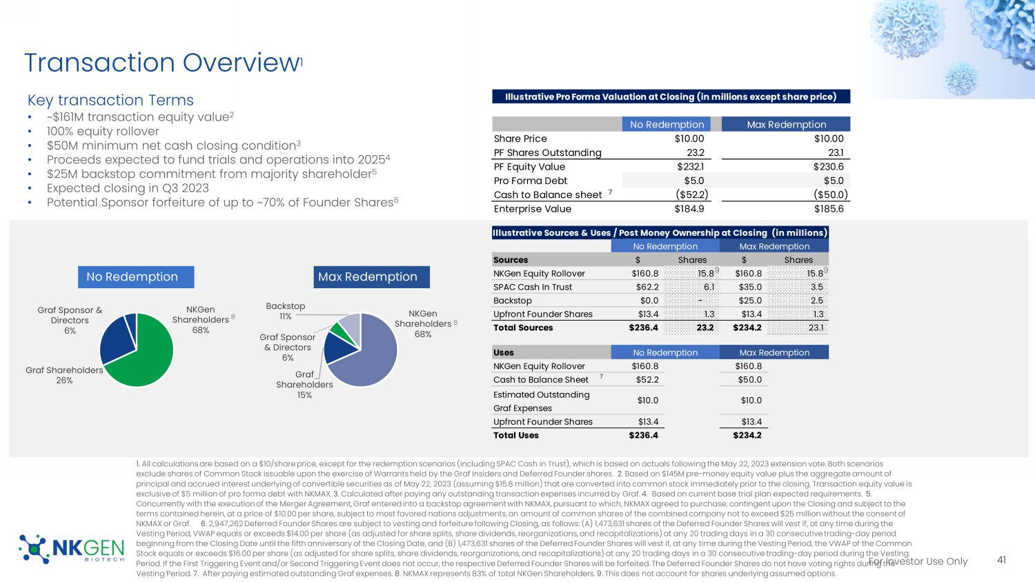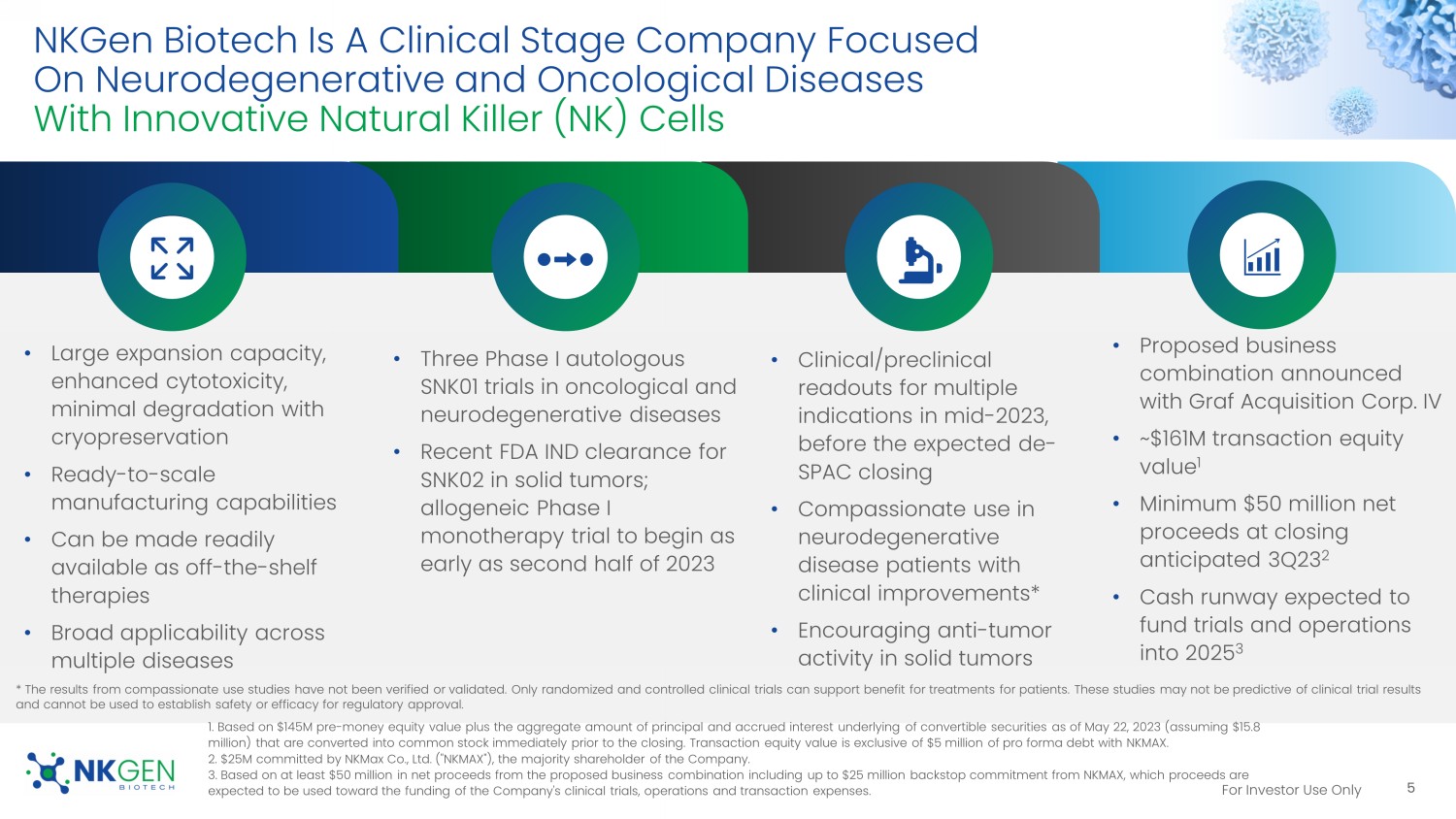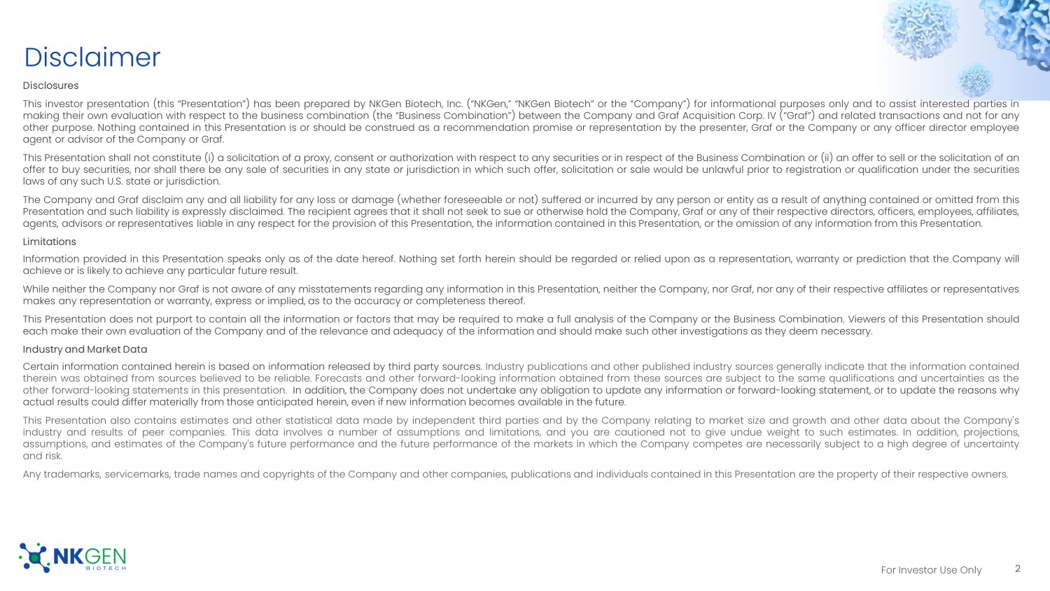This Current Report includes forward-looking statements regarding, among other things, the plans, strategies and prospects, both business and financial, of Graf and NKGen. These statements are based on the beliefs and assumptions of the management of Graf and NKGen. Although Graf and NKGen believe that their respective plans, intentions and expectations reflected in or suggested by these forward-looking statements are reasonable, neither Graf nor NKGen can assure you that either will achieve or realize these plans, intentions or expectations. Forward-looking statements are inherently subject to risks, uncertainties and assumptions. Generally, statements that are not historical facts, including statements concerning possible or assumed future actions, business strategies, events or results of operations, are forward-looking statements. These statements may be preceded by, followed by or include the words “believes,” “estimates,” “anticipates,” “expects,” “projects,” “forecasts,” “outlook,” “future,” “further,” “may,” “will,” “potential,” “should,” “seeks,” “seems,” “targets,” “plans,” “scheduled,” “anticipates,” “intends” or similar expressions. The forward-looking statements are based on projections prepared by, and are the responsibility of, Graf’s or NKGen’s management. These forward-looking statements are not guarantees of future performance, conditions or results, and involve a number of known and unknown risks, uncertainties, assumptions and other important factors, including changes in domestic and foreign business, market, financial, political and legal conditions, many of which are outside the control of the parties, that could cause actual results or outcomes to differ materially from those discussed in the forward-looking statements. Important factors that may affect actual results or outcomes include, among others, the inability of the parties to successfully or timely consummate the proposed Business Combination; the failure to obtain stockholder approval of the extension of time Graf has to consummate the proposed Business Combination at any future meeting of Graf stockholders at which such proposal is presented; the failure to satisfy the conditions to the consummation of the proposed Business Combination, including the approval of the Merger Agreement by Graf’s stockholders, the satisfaction of the minimum cash condition and the receipt of certain governmental and regulatory approvals; the inability to obtain any PIPE investments; the effect of the announcement or pendency of the proposed Business Combination on NKGen’s business relationships, operating results, and business generally; the risk that the proposed Business Combination disrupts the current plans and operations of NKGen; NKGen’s lack of products approved for sale and ability to achieve profitability; the risk that preclinical studies and early-stage clinical trials may not be predictive of future results; NKGen’s ability to manage clinical trials or studies, including any compassionate use programs and product pipeline, the risk associated with the use and reliance on the initial or preliminary results and date from the compassionate use programs and the ongoing Phase I clinical trial; NKGen’s ability to raise additional funding to complete the development and any commercialization of its product candidates; NKGen’s dependence on its lead product candidates, SNK01 and SNK02; the complexity of the manufacturing process for natural killer cell therapies; the risk that regulatory approvals for NKGen’s product development are not obtained, are delayed or are subject to unanticipated conditions that could adversely affect the post-Business Combination entity (“New NKGen”) or the expected benefits of the proposed Business Combination; NKGen’s ability to manage future growth; NKGen’s ability to manage clinical trials or studies, including any compassionate use programs and product pipeline; the dependence on the success of NKGen’s SNK natural killer cell technology platform; New NKGen’s ability to meet the listing standards of the New York Stock Exchange, NYSE American or, Nasdaq Stock Market; the amount of redemption requests made by Graf’s public stockholders; the complexity of numerous regulatory and legal requirements that NKGen needs to comply with to operate its business; the failure to obtain, adequately protect, maintain or enforce NKGen’s intellectual property rights; the ability of Graf or New NKGen to issue equity or equity-linked securities in connection with the proposed Business Combination or in the future; the concentrated ownership of New NKGen common stock among NKGen’s existing executive officers, directors and principal stockholders; and those factors discussed under the heading “Risk Factors” in the Registration Statement and other documents of Graf filed, or to be filed, with the SEC. New risk factors emerge from time to time and it is not possible to predict all such risk factors, nor can Graf or NKGen assess the impact of all such risk factors on the businesses of Graf and NKGen prior to the proposed Business Combination, and the combined company following the proposed Business Combination, or the extent to which any factor or combination of factors may cause actual results to differ materially from those contained in any forward-looking statements. Forward-looking statements are not guarantees of performance. You should not put undue reliance on these statements, which speak only as of the date hereof. All forward-looking statements attributable to Graf or NKGen or persons acting on their behalf are expressly qualified in their entirety by the foregoing cautionary statements. Graf and NKGen prior to the proposed Business Combination, and the combined company following the proposed Business Combination, undertake no obligations to update or revise publicly any forward-looking