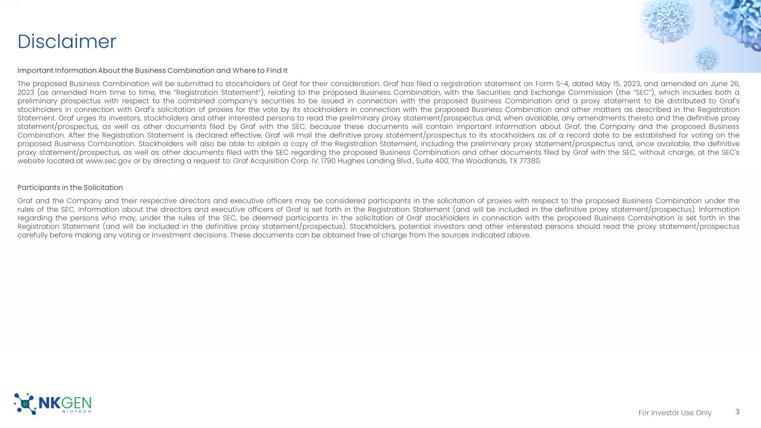 The proposed Business Combination will be submitted to stockholders of Graf for their consideration. Graf has filed with the Securities and Exchange Commission (the “SEC”) a registration statement on Form S-4, dated May 15, 2023, as amended on June 26, 2023 and July 17, 2023 (as may be further amended, the “Registration Statement”), relating to the proposed Business Combination, which includes both a preliminary prospectus with respect to the combined company’s securities to be issued in connection with the proposed Business Combination and a proxy statement to be distributed to Graf's stockholders in connection with Graf's solicitation of proxies for the vote by its stockholders in connection with the proposed Business Combination and other matters as described in the Registration Statement. Graf urges its investors, stockholders and other interested persons to read the preliminary proxy statement/prospectus and, when available, any amendments thereto and the definitive proxy statement/prospectus, as well as other documents filed by Graf with the SEC, because these documents will contain important information about Graf, NKGen and the proposed Business Combination. After the Registration Statement is declared effective, Graf will mail the definitive proxy statement/prospectus to its stockholders as of a record date to be established for voting on the proposed Business Combination. Stockholders will also be able to obtain a copy of the Registration Statement, including the preliminary proxy statement/prospectus and, once available, the definitive proxy statement/prospectus, as well as other documents filed with the SEC regarding the proposed Business Combination and other documents filed by Graf with the SEC, without charge, at the SEC's website located at www.sec.gov or by directing a request to: Graf Acquisition Corp. IV, 1790 Hughes Landing Blvd., Suite 400, The Woodlands, TX 77380.