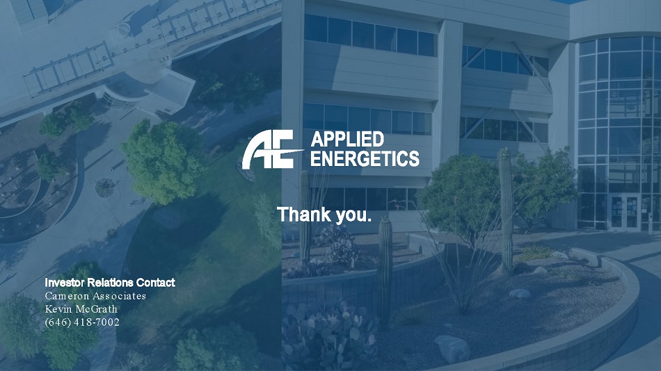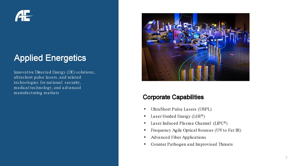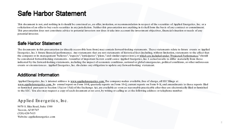 2 This document is not, and nothing in it should be construed as, an offer, invitation, or recommendation in respect of the sec uri ties of Applied Energetics, Inc. or a solicitation of an offer to buy such securities in any jurisdiction. Neither this presentation nor anything in it shall form the basis of any contract or commitment. This presentation does not constitute advice to potential investors nor does it take into account the investment objectives, fin ancial situation or needs of any potential investor. Safe Harbor Statement The documents in this presentation (or directly accessible here from) may contain forward - looking statements. These statements r elate to future events or Applied Energetics, Inc.’s future financial performance. Any statements that are not statements of historical fact (including, withou t l imitation, statements to the effect that the company or its management "believes", "expects", "anticipates", "plans," and similar expressions), or which are included under "Projected Performance ," should be considered forward - looking statements. A number of important factors could cause Applied Energetics, Inc.’s actual results to differ materially from those indicated by the forward - looking statements, including the impact of economic conditions, national or global emergencies, politi cal conditions, or other unforeseen events or circumstances. Applied Energetics, Inc. disclaims any obligation to update any forward - looking statement. Additional Information Applied Energetics, Inc.’s internet address is www.appliedenergetics.com The company makes available, free of charge, all SEC filings at www.appliedenergetics.com. Its annual report on Form 10 - K, quarterly reports on Form 10 - Q, current reports on Form 8 - K, and amendments to those reports f iled or furnished pursuant to Section 13(a) or 15(d) of the Exchange Act, are available as soon as reasonably practicable after t hey are electronically filed or furnished to the SEC. You also may request a copy of each document at no cost, by writing or calling us at the following address or tel eph one number: Applied Energetics, Inc. 9070 S. Rita Road, Suite 1500 Tucson, AZ 85747 (520) 628 - 7415 Website: appliedenergetics.com Safe Harbor Statement