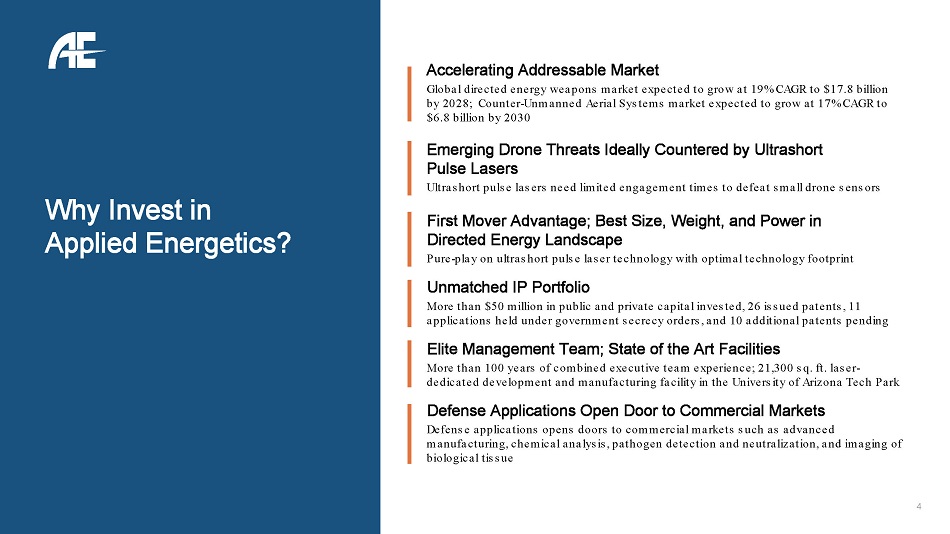3 Applied Energetics Innovative Directed Energy (DE) solutions, ultrashort pulse lasers, and related technologies for national security, medical technology, and advanced manufacturing markets Corporate Capabilities ▪ UltraShort Pulse Lasers (USPL) ▪ Laser Guided Energy (LGE ® ) ▪ Laser Induced Plasma Channel (LIPC ® ) ▪ Frequency Agile Optical Sources (UV to Far IR) ▪ Advanced Fiber Applications ▪ Counter Pathogen and Improvised Threats