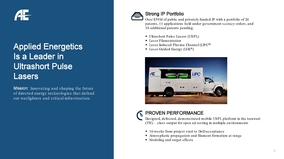 4 Why Invest in Applied Energetics? Accelerating Addressable Market Global directed energy weapons market expected to grow at 19% CAGR to $17.8 billion by 2028; Counter - Unmanned Aerial Systems market expected to grow at 17% CAGR to $6.8 billion by 2030 Emerging Drone Threats Ideally Countered by Ultrashort Pulse Lasers Ultrashort pulse lasers need limited engagement times to defeat small drone sensors First Mover Advantage; Best Size, Weight, and Power in Directed Energy Landscape Pure - play on ultrashort pulse laser technology with optimal technology footprint Unmatched IP Portfolio More than $50 million in public and private capital invested, 26 issued patents, 11 applications held under government secrecy orders, and 10 additional patents pending Elite Management Team; State of the Art Facilities More than 100 years of combined executive team experience; 21,300 sq. ft. laser - dedicated development and manufacturing facility in the University of Arizona Tech Park Defense Applications Open Door to Commercial Markets Defense applications opens doors to commercial markets such as advanced manufacturing, chemical analysis, pathogen detection and neutralization, and imaging of biological tissue