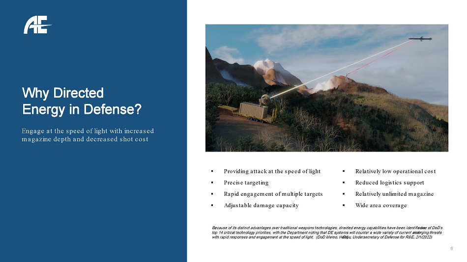 5 Applied Energetics Is a Leader in Ultrashort Pulse Lasers Strong IP Portfolio Over $50M of public and privately funded IP with a portfolio of 26 patents, 11 applications held under government secrecy orders, and 10 additional patents pending. ▪ Ultrashort Pulse Lasers (USPL) ▪ Laser Filamentation ▪ Laser Induced Plasma Channel (LIPC ®) ▪ Laser Guided Energy (LGE ® ) Mission: Innovating and shaping the future of directed energy technologies that defend our warfighters and critical infrastructure. PROVEN PERFORMANCE Designed, delivered, demonstrated mobile USPL platform in the terawatt (TW) – class output for open air testing in multiple environments ▪ 16 - weeks from project start to DoD acceptance ▪ Atmospheric propagation and filament formation at range ▪ Modeling and target effects