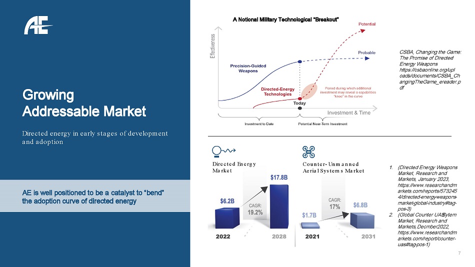 6 Why Directed Energy in Defense? Engage at the speed of light with increased magazine depth and decreased shot cost ▪ Providing attack at the speed of light ▪ Precise targeting ▪ Rapid engagement of multiple targets ▪ Adjustable damage capacity Because of its distinct advantages over traditional weapons technologies, directed energy capabilities have been identified a s o ne of DoD’s top 14 critical technology priorities, with the Department noting that DE systems will counter a wide variety of current and eme rging threats with rapid responses and engagement at the speed of light. (DoD Memo, Heidi Shyu , Undersecretary of Defense for R&E, 2/1/2022) ▪ Relatively low operational cost ▪ Reduced logistics support ▪ Relatively unlimited magazine ▪ Wide area coverage