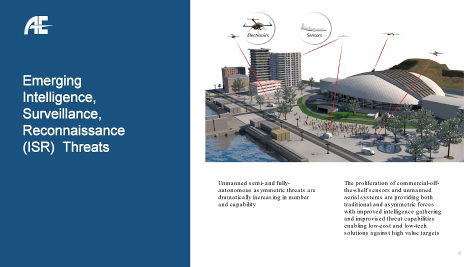 7 Growing Addressable Market Directed energy in early stages of development and adoption AE is well positioned to be a catalyst to “bend” the adoption curve of directed energy 1. (Directed Energy Weapons Market, Research and Markets, January 2023, https://www.researchandm arkets.com/reports/573245 4/directed - energy - weapons - market - global - industry#tag - pos - 3) 2. (Global Counter UAS Sytem Market, Research and Markets, Decmber 2022, https://www.researchandm arkets.com/report/counter - uas#tag - pos - 1) A Notional Military Technological “Breakout” CSBA, Changing the Game: The Promise of Directed - Energy Weapons https://csbaonline.org/upl oads/documents/CSBA_Ch angingTheGame_ereader.p df Directed Energy Market Counter - Unmanned Aerial Systems Market