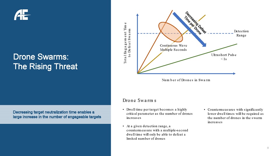 9 Drone Swarms: The Rising Threat Drone Swarms • Dwell time per target becomes a highly critical parameter as the number of drones increases • At a given detection range, a countermeasure with a multiple - second dwell time will only be able to defeat a limited number of drones Total Engagement Time to Defeat Swarm Number of Drones in Swarm Detection Range Ultrashort Pulse < 1s Continuous Wave Multiple Seconds • Countermeasures with significantly lower dwell times will be required as the number of drones in the swarm increases Decreasing target neutralization time enables a large increase in the number of engageable targets