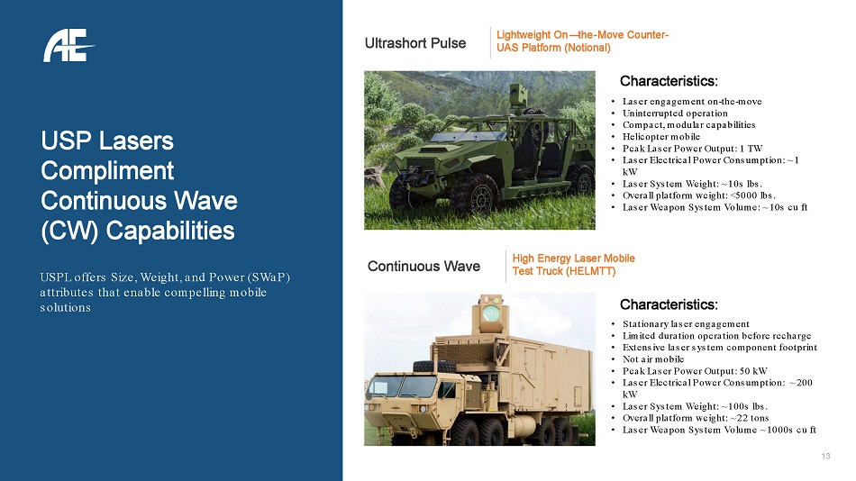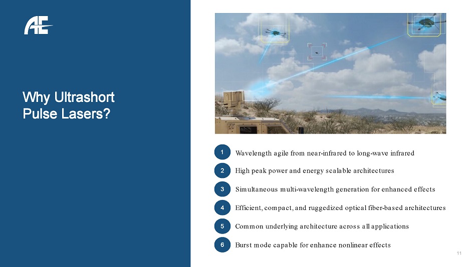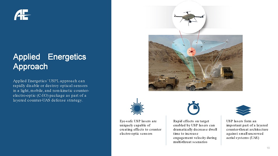 10 Applied Energetics Approach Applied Energetics’ USPL approach can rapidly disable or destroy optical sensors in a light, mobile, and non - kinetic counter - electro - optic (C - EO) package as part of a layered counter - UAS defense strategy. Eye - safe USP lasers are uniquely capable of creating effects to counter electro - optic sensors Rapid effects on target enabled by USP lasers can dramatically decrease dwell time to increase engagement velocity during multi - threat scenarios USP lasers form an important part of a layered counter - threat architecture against small uncrewed aerial systems (UAS)