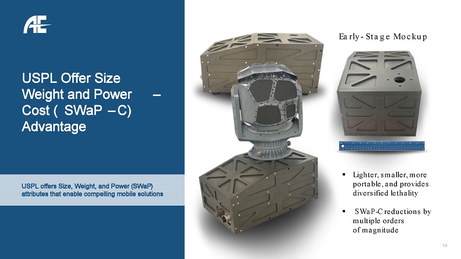 13 USP Lasers Compliment Continuous Wave (CW) Capabilities USPL offers Size, Weight, and Power ( SWaP ) attributes that enable compelling mobile solutions • Stationary laser engagement • Limited duration operation before recharge • Extensive laser system component footprint • Not air mobile • Peak Laser Power Output: 50 kW • Laser Electrical Power Consumption: ~200 kW • Laser System Weight: ~100s lbs. • Overall platform weight: ~22 tons • Laser Weapon System Volume ~1000s cu ft • Laser engagement on - the - move • Uninterrupted operation • Compact, modular capabilities • Helicopter mobile • Peak Laser Power Output: 1 TW • Laser Electrical Power Consumption: ~1 kW • Laser System Weight: ~10s lbs. • Overall platform weight: <5000 lbs. • Laser Weapon System Volume: ~10s cu ft Lightweight On — the - Move Counter - UAS Platform (Notional) Ultrashort Pulse High Energy Laser Mobile Test Truck (HELMTT) Continuous Wave Characteristics: Characteristics: