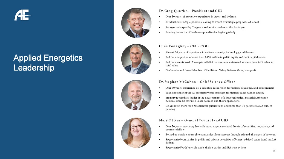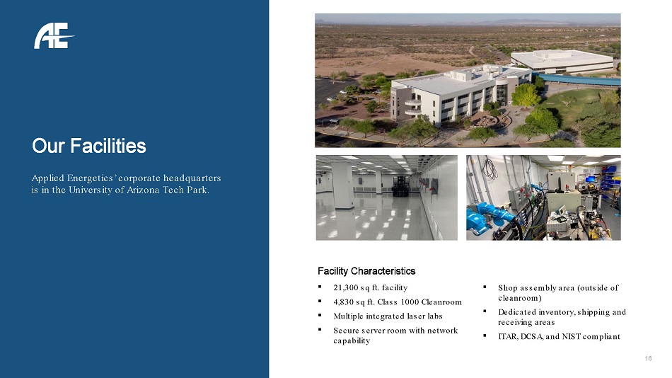 15 Applied Energetics Leadership Dr. Greg Quarles – President and CEO ▪ Over 30 years of executive experience in lasers and defense ▪ Established strategic priorities leading to award of multiple programs of record ▪ Recognized expert by Congress and senior leaders at the Pentagon ▪ Leading innovator of dual - use optical technologies globally Chris Donaghey – CFO / COO ▪ Almost 30 years of experience in national security, technology, and finance ▪ Led the completion of more than $450 million in public equity and debt capital raises ▪ Led the execution of 17 completed M&A transactions estimated at more than $4.5 billion in total value ▪ Co - founder and Board Member of the Silicon Valley Defense Group non - profit Dr. Stephen McCahon – Chief Science Officer ▪ Over 30 years experience as a scientific researcher, technology developer, and entrepreneur ▪ Lead developer of the AE proprietary breakthrough technology Laser Guided Energy ▪ Industry recognized leader in the development of advanced optical materials, photonic devices, Ultra Short Pulse Laser sources and their applications ▪ Co - authored more than 50 scientific publications and more than 30 patents issued and/or pending Mary O’Hara – General Counsel and CLO ▪ Over 30 years practicing law with broad experience in all facets of securities, corporate, and commercial law ▪ Served as outside counsel to companies from start - up through exit and all stages in between ▪ Represented companies in public and private securities offerings; advised on national market listings ▪ Represented both buy - side and sell - side parties in M&A transactions