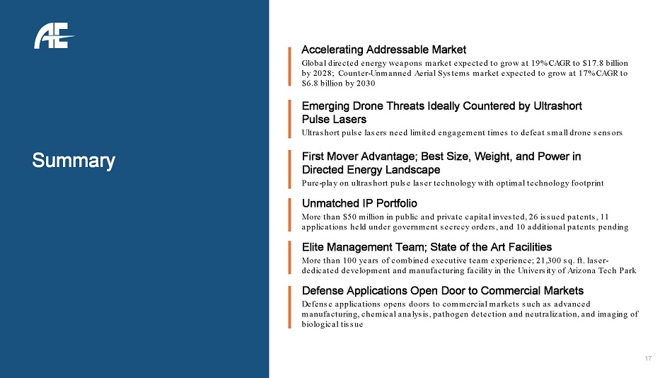 16 Our Facilities Applied Energetics’ corporate headquarters is in the University of Arizona Tech Park. ▪ Shop assembly area (outside of cleanroom) ▪ Dedicated inventory, shipping and receiving areas ▪ ITAR, DCSA, and NIST compliant Facility Characteristics ▪ 21,300 sq ft. facility ▪ 4,830 sq ft. Class 1000 Cleanroom ▪ Multiple integrated laser labs ▪ Secure server room with network capability