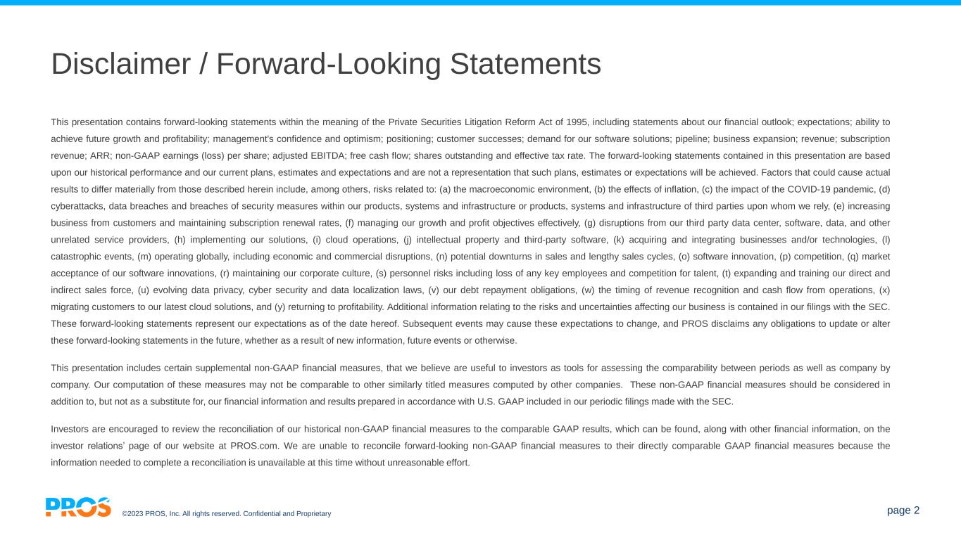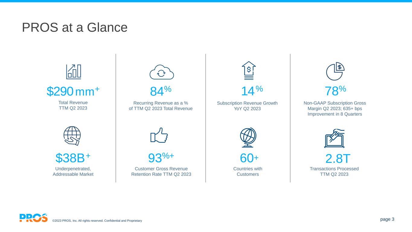 ©2023 PROS, Inc. All rights reserved. Confidential and Proprietary page 2 Disclaimer / Forward-Looking Statements This presentation contains forward-looking statements within the meaning of the Private Securities Litigation Reform Act of 1995, including statements about our financial outlook; expectations; ability to achieve future growth and profitability; management's confidence and optimism; positioning; customer successes; demand for our software solutions; pipeline; business expansion; revenue; subscription revenue; ARR; non-GAAP earnings (loss) per share; adjusted EBITDA; free cash flow; shares outstanding and effective tax rate. The forward-looking statements contained in this presentation are based upon our historical performance and our current plans, estimates and expectations and are not a representation that such plans, estimates or expectations will be achieved. Factors that could cause actual results to differ materially from those described herein include, among others, risks related to: (a) the macroeconomic environment, (b) the effects of inflation, (c) the impact of the COVID-19 pandemic, (d) cyberattacks, data breaches and breaches of security measures within our products, systems and infrastructure or products, systems and infrastructure of third parties upon whom we rely, (e) increasing business from customers and maintaining subscription renewal rates, (f) managing our growth and profit objectives effectively, (g) disruptions from our third party data center, software, data, and other unrelated service providers, (h) implementing our solutions, (i) cloud operations, (j) intellectual property and third-party software, (k) acquiring and integrating businesses and/or technologies, (l) catastrophic events, (m) operating globally, including economic and commercial disruptions, (n) potential downturns in sales and lengthy sales cycles, (o) software innovation, (p) competition, (q) market acceptance of our software innovations, (r) maintaining our corporate culture, (s) personnel risks including loss of any key employees and competition for talent, (t) expanding and training our direct and indirect sales force, (u) evolving data privacy, cyber security and data localization laws, (v) our debt repayment obligations, (w) the timing of revenue recognition and cash flow from operations, (x) migrating customers to our latest cloud solutions, and (y) returning to profitability. Additional information relating to the risks and uncertainties affecting our business is contained in our filings with the SEC. These forward-looking statements represent our expectations as of the date hereof. Subsequent events may cause these expectations to change, and PROS disclaims any obligations to update or alter these forward-looking statements in the future, whether as a result of new information, future events or otherwise. This presentation includes certain supplemental non-GAAP financial measures, that we believe are useful to investors as tools for assessing the comparability between periods as well as company by company. Our computation of these measures may not be comparable to other similarly titled measures computed by other companies. These non-GAAP financial measures should be considered in addition to, but not as a substitute for, our financial information and results prepared in accordance with U.S. GAAP included in our periodic filings made with the SEC. Investors are encouraged to review the reconciliation of our historical non-GAAP financial measures to the comparable GAAP results, which can be found, along with other financial information, on the investor relations’ page of our website at PROS.com. We are unable to reconcile forward-looking non-GAAP financial measures to their directly comparable GAAP financial measures because the information needed to complete a reconciliation is unavailable at this time without unreasonable effort.