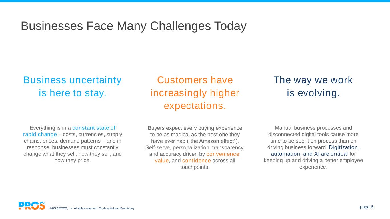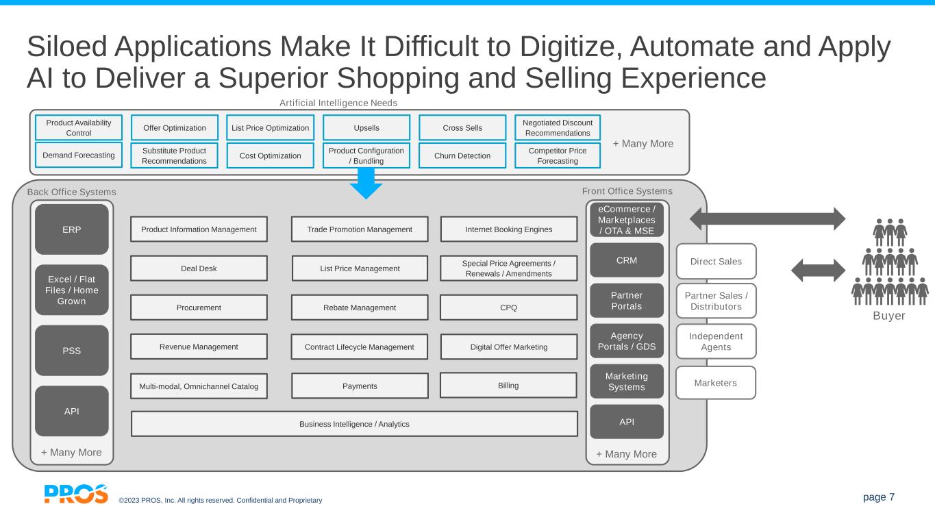 ©2023 PROS, Inc. All rights reserved. Confidential and Proprietary page 6 Businesses Face Many Challenges Today The way we work is evolving. Manual business processes and disconnected digital tools cause more time to be spent on process than on driving business forward. Digitization, automation, and AI are critical for keeping up and driving a better employee experience. Business uncertainty is here to stay. Everything is in a constant state of rapid change – costs, currencies, supply chains, prices, demand patterns – and in response, businesses must constantly change what they sell, how they sell, and how they price. Customers have increasingly higher expectations. Buyers expect every buying experience to be as magical as the best one they have ever had (“the Amazon effect”). Self-serve, personalization, transparency, and accuracy driven by convenience, value, and confidence across all touchpoints.